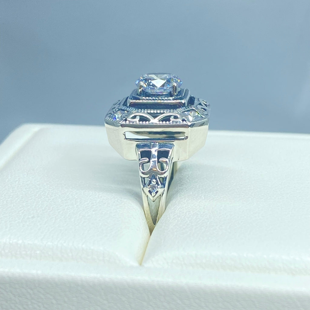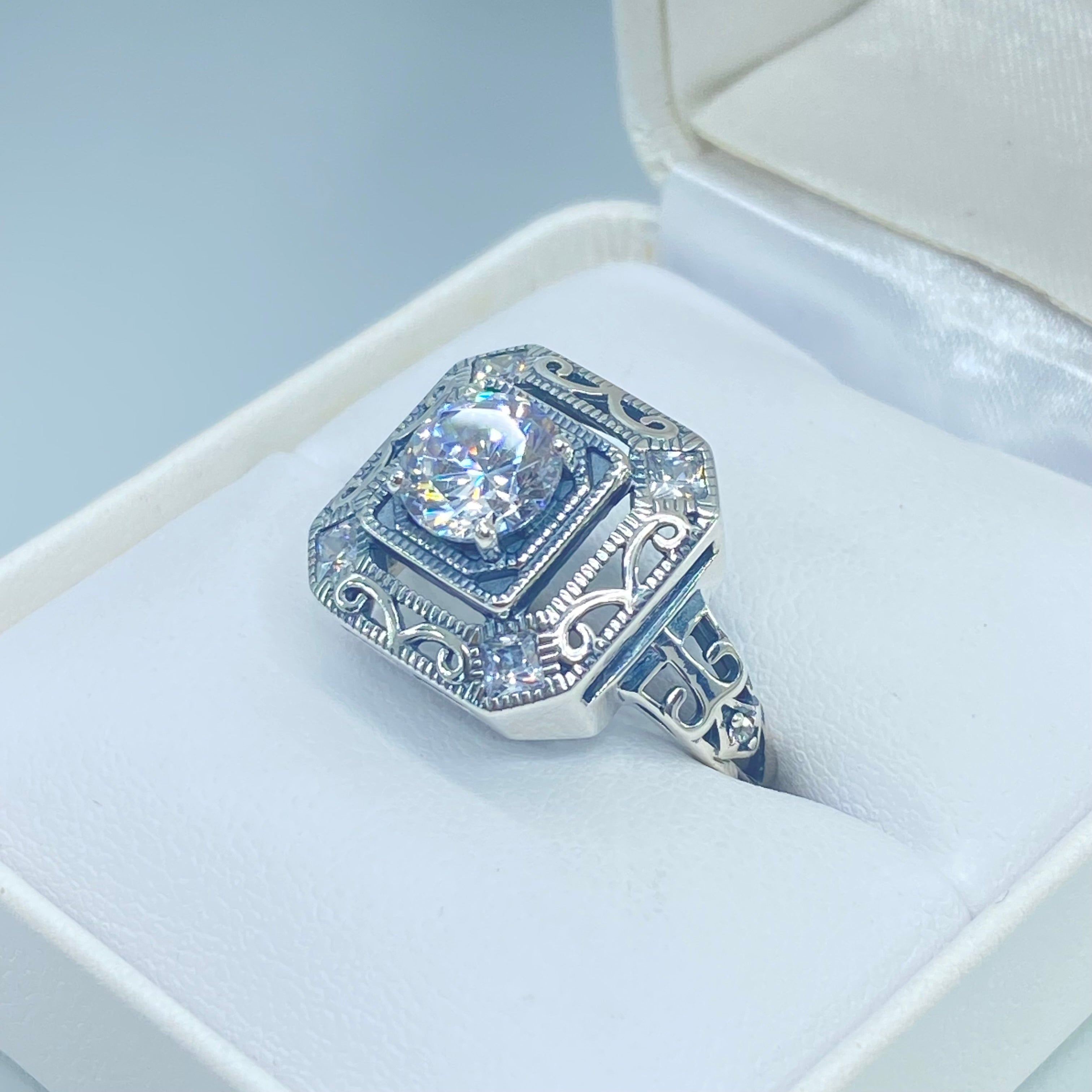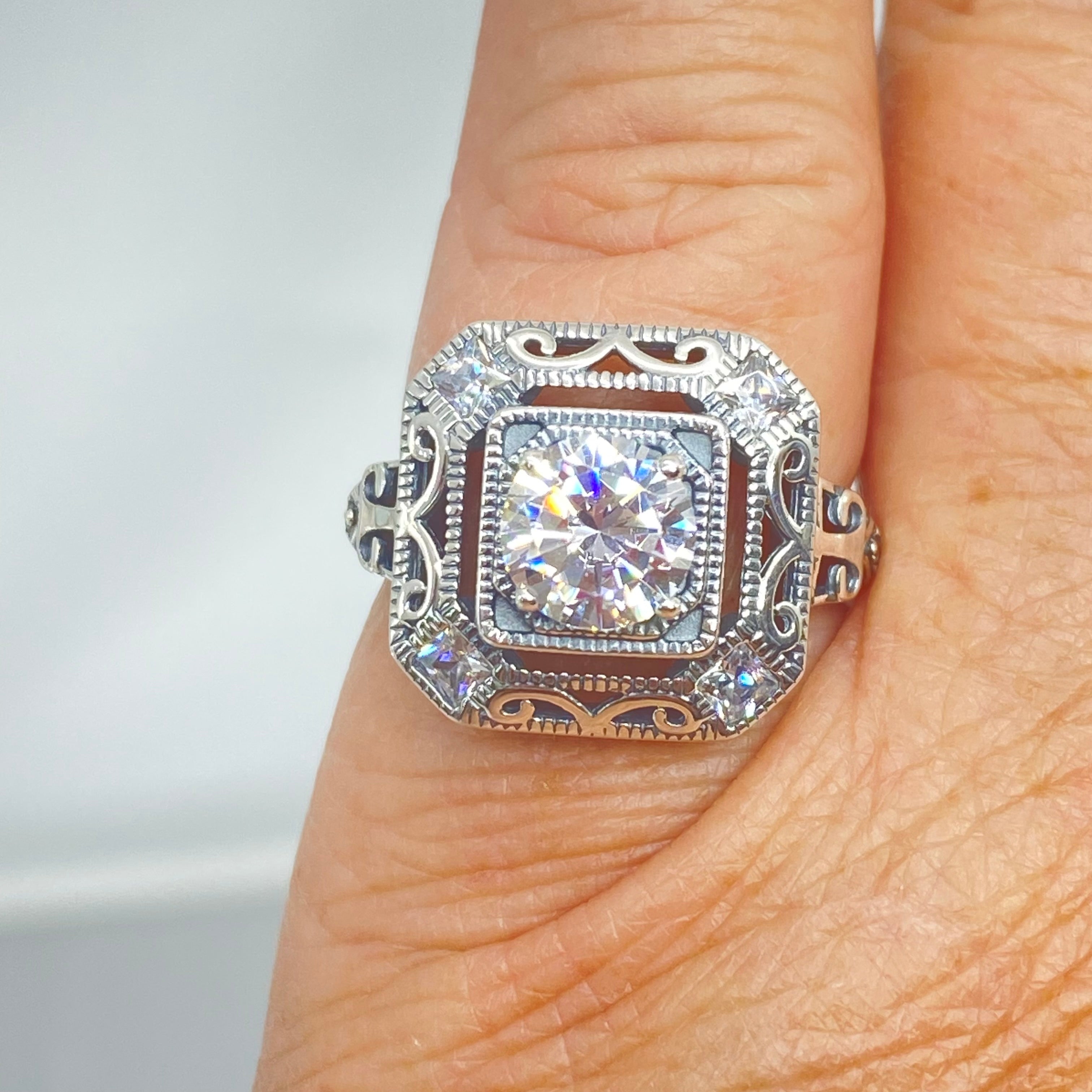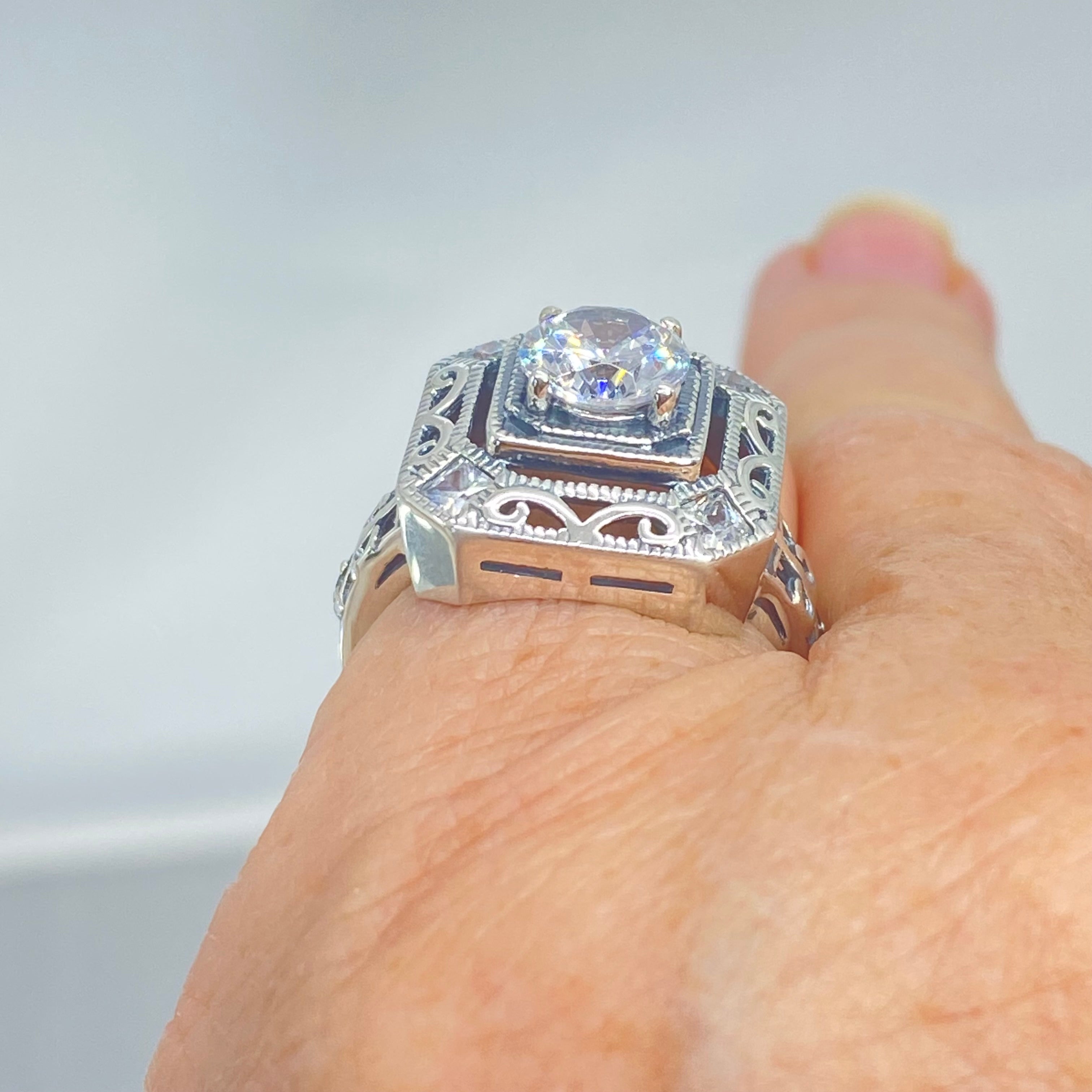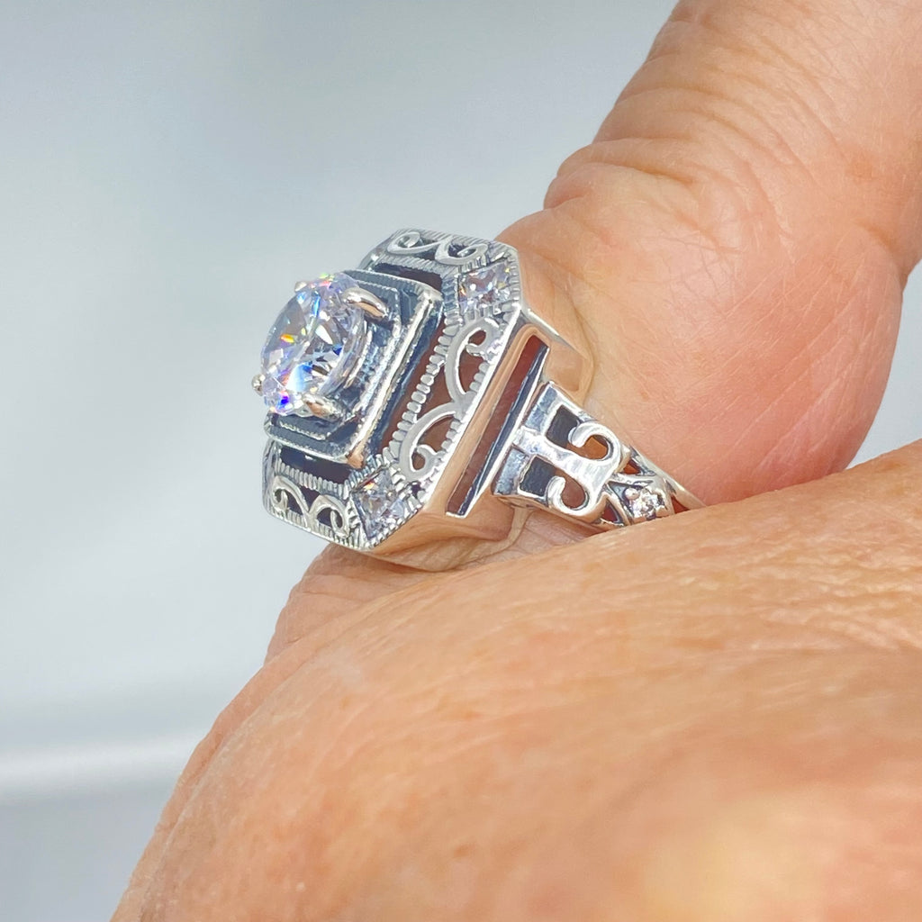 Inspired by the Art Deco movement, this gorgeous Art Deco revival filigree ring is set in sterling silver. This lovely sterling silver ring is set with a stunning quality 1ctw center round-cut white Cubic Zirconia (CZ) gemstone. There are two small White CZ gemstones that also grace the side of the band, one on each side. There are four (4) square baguette white CZs on the ring as a sparkling accent. The baguette gems are approximately 2.5mm each. The full-cut center gemstone is 7mm in diameter. Notice the beautiful design of the silver filigree setting and band. The ring sits 5/8" North to South on the finger. The inside of the band is marked 925 for sterling silver.