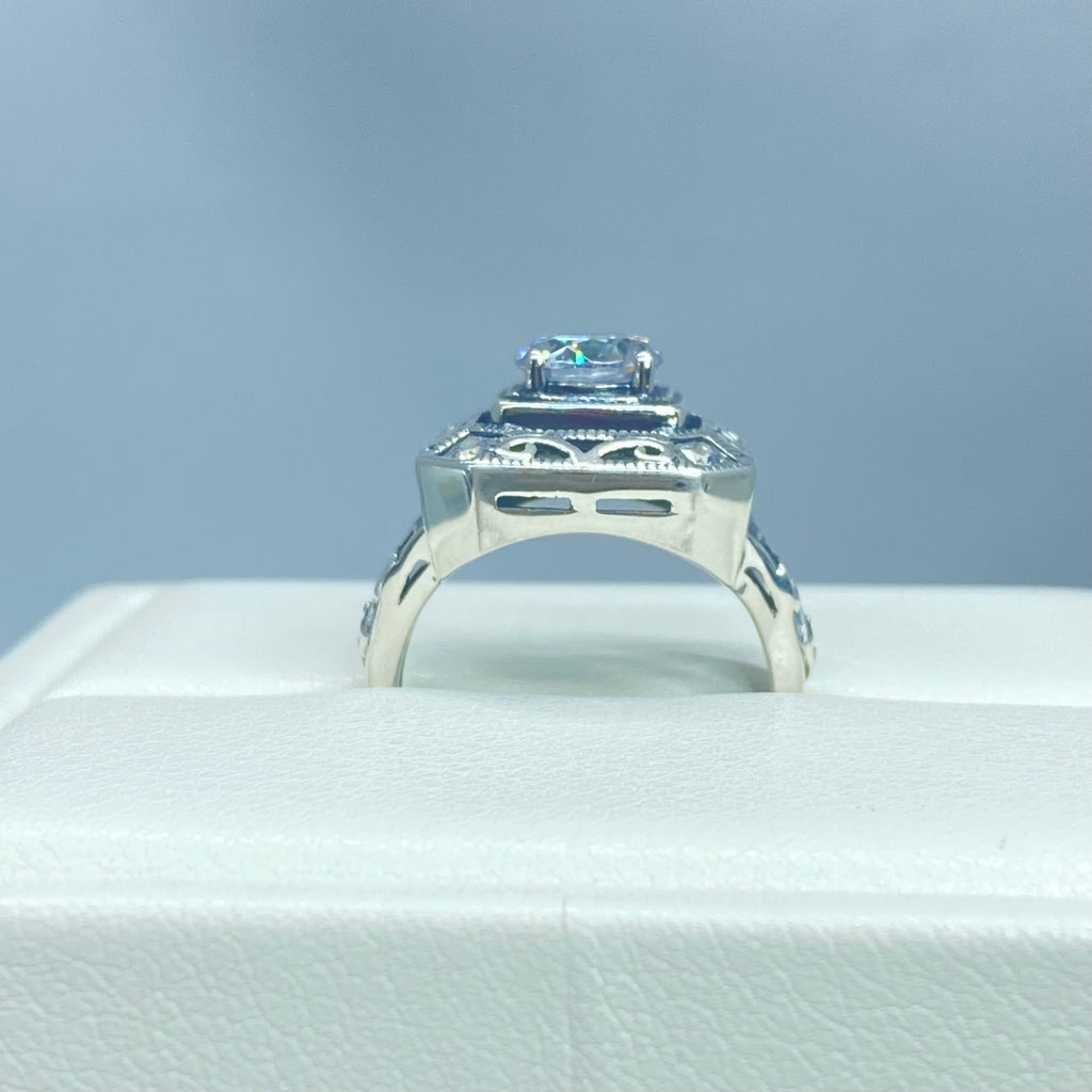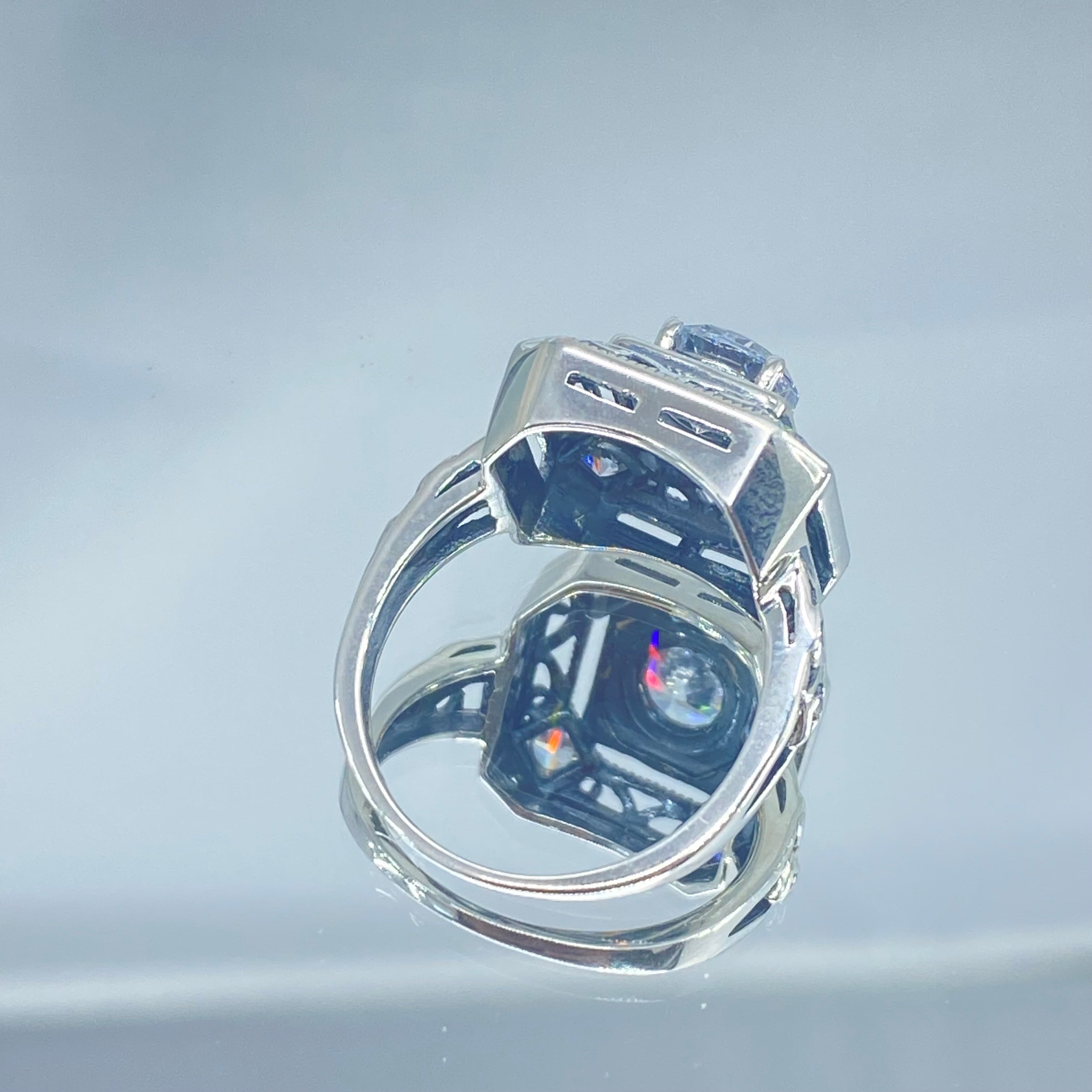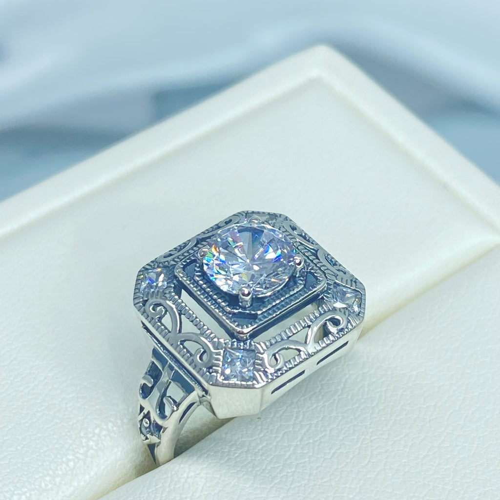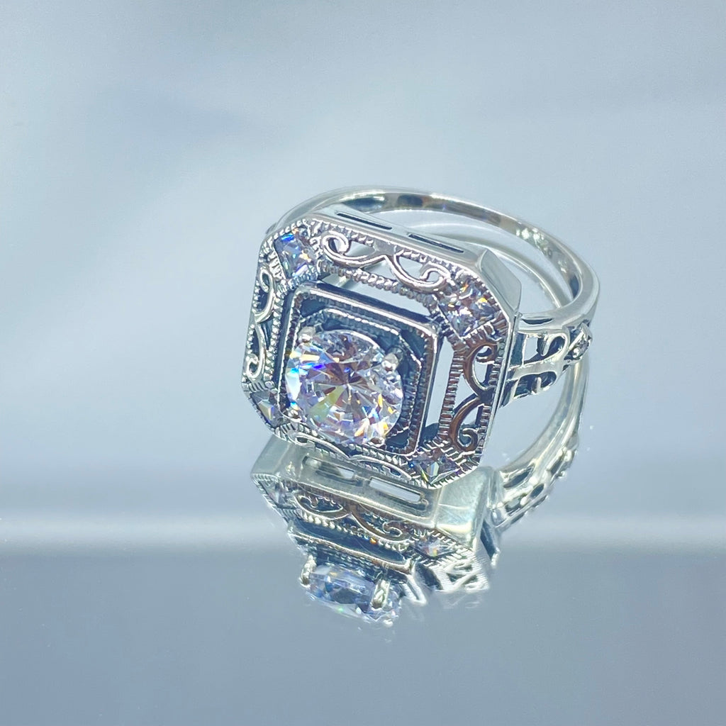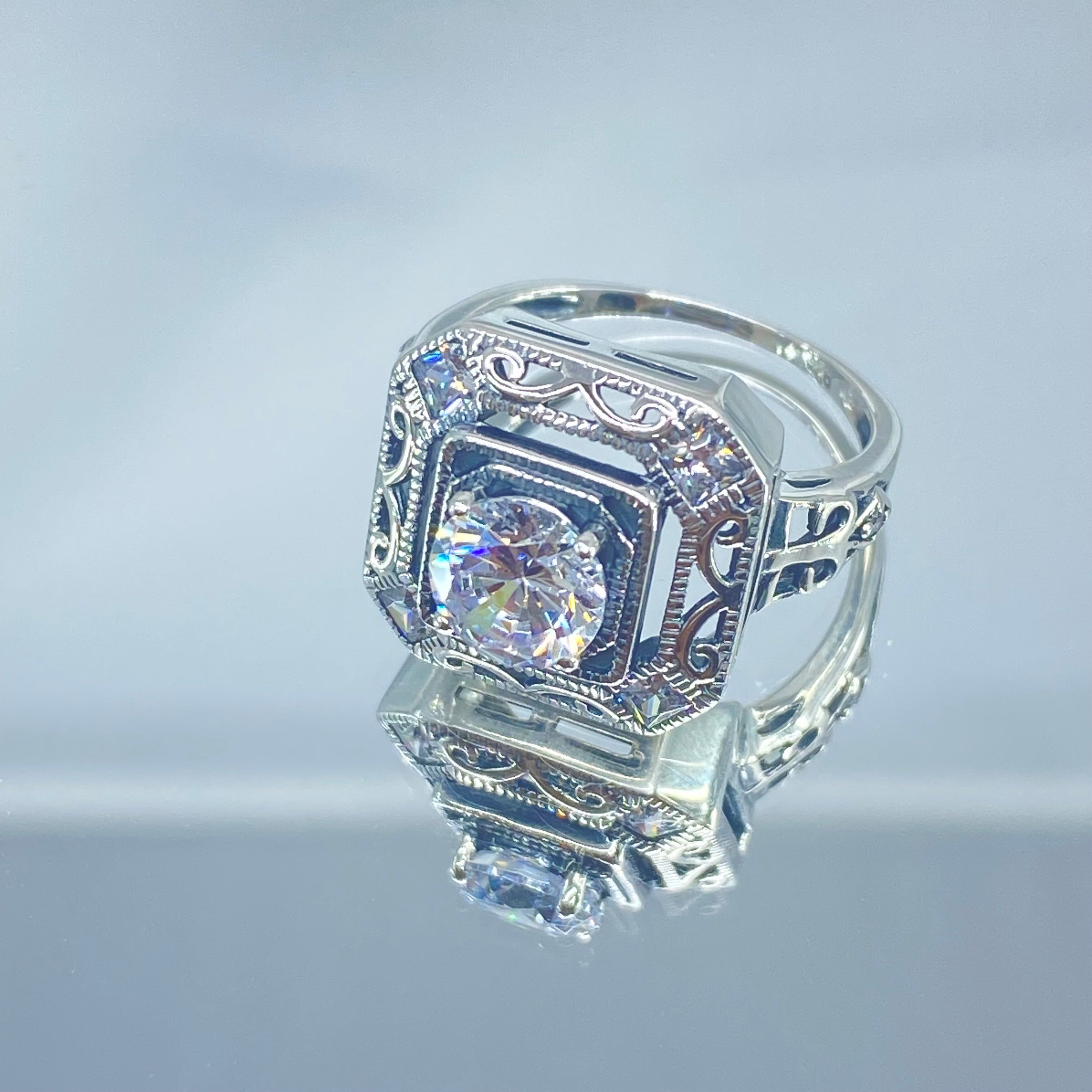 Inspired by the Art Deco movement, this gorgeous Art Deco revival filigree ring is set in sterling silver. This lovely sterling silver ring is set with a stunning quality 1ctw center round-cut white Cubic Zirconia (CZ) gemstone. There are two small White CZ gemstones that also grace the side of the band, one on each side. There are four (4) square baguette white CZs on the ring as a sparkling accent. The baguette gems are approximately 2.5mm each. The full-cut center gemstone is 7mm in diameter. Notice the beautiful design of the silver filigree setting and band. The ring sits 5/8" North to South on the finger. The inside of the band is marked 925 for sterling silver.