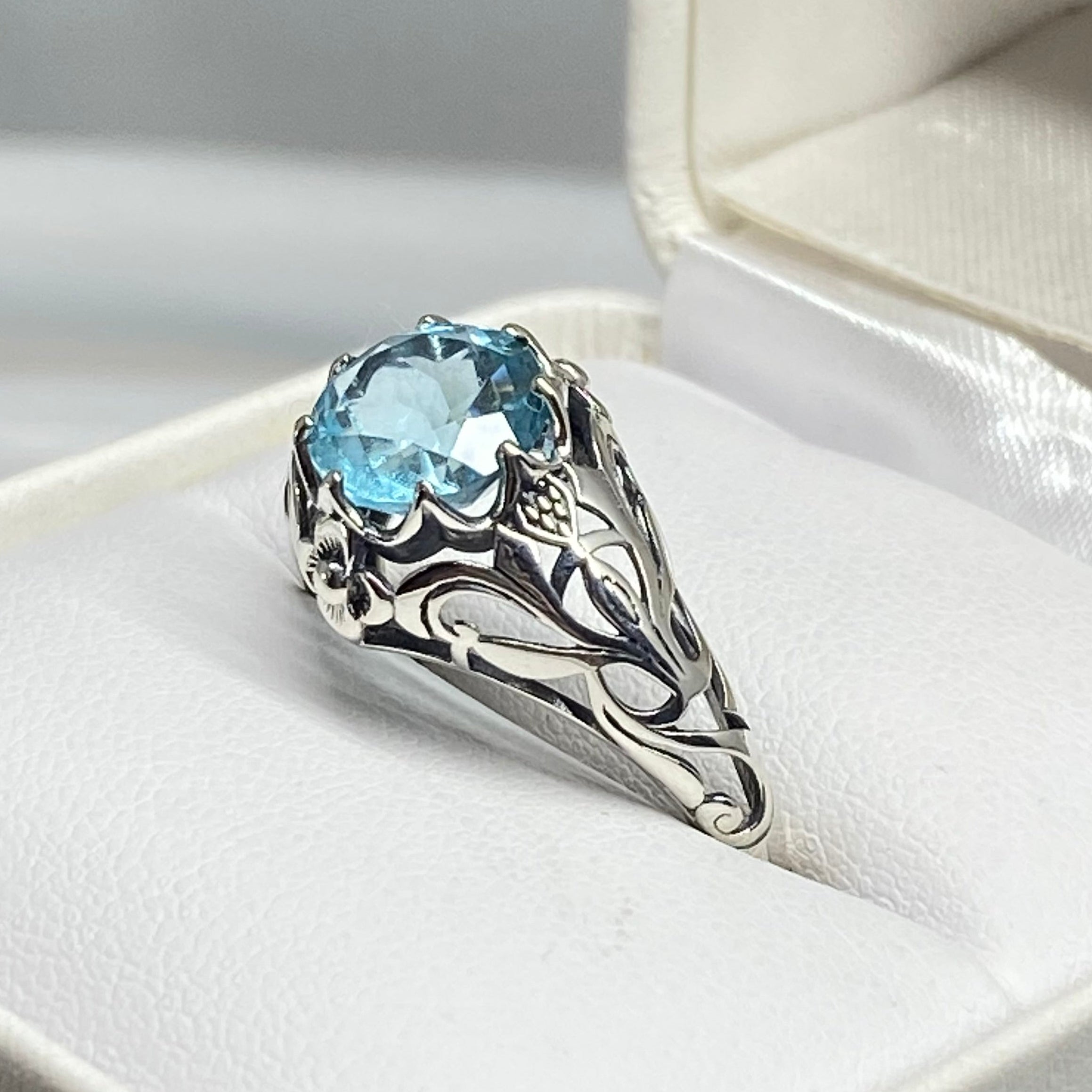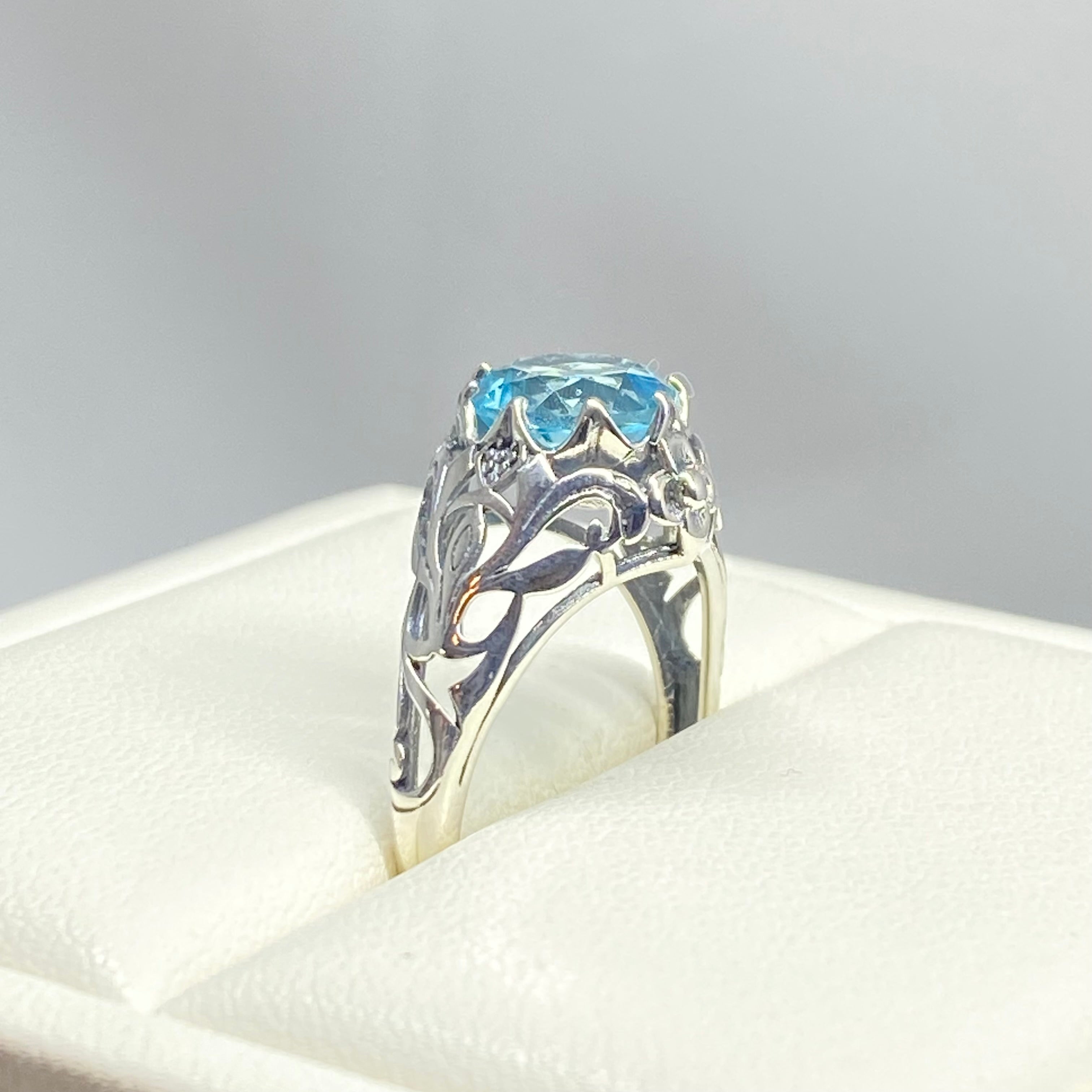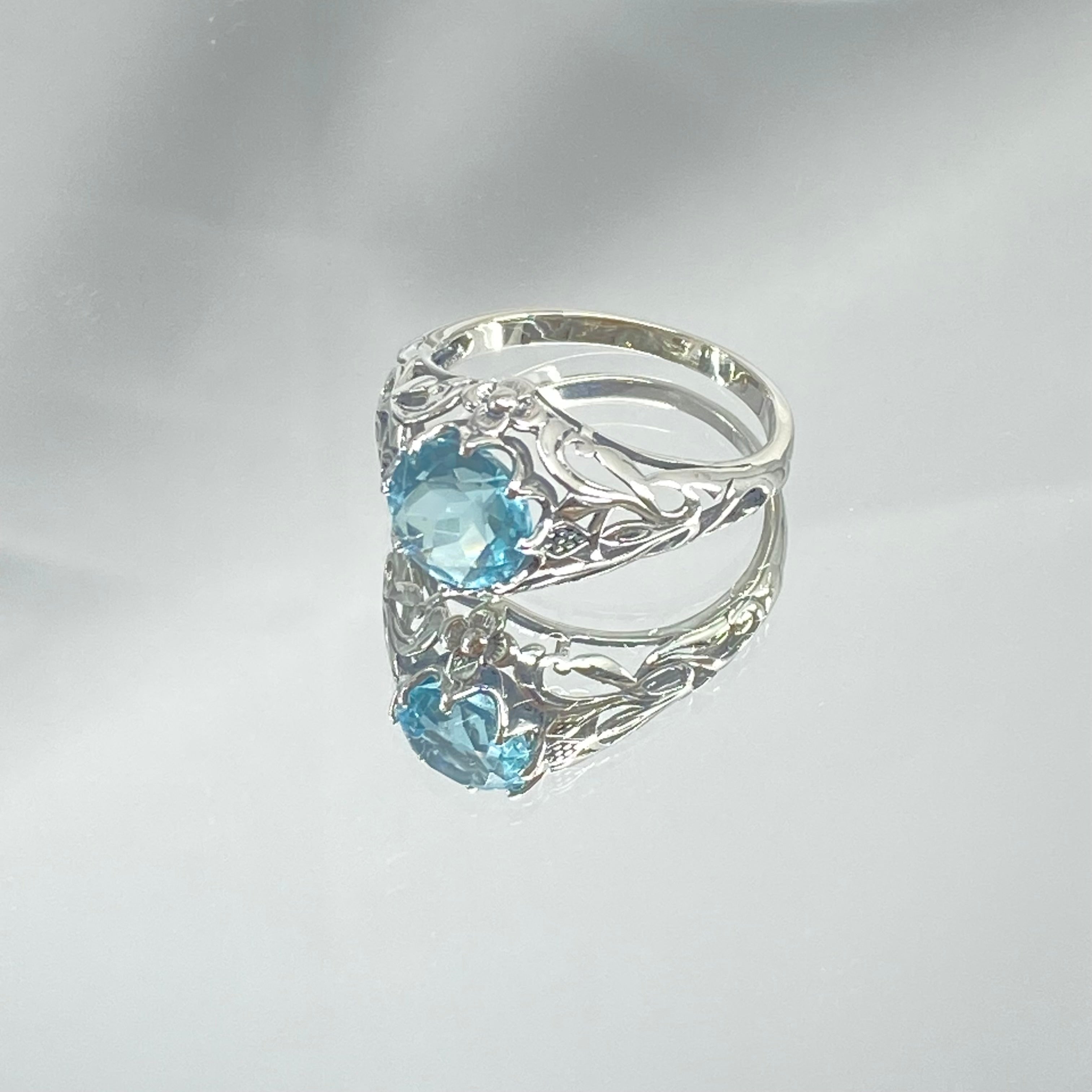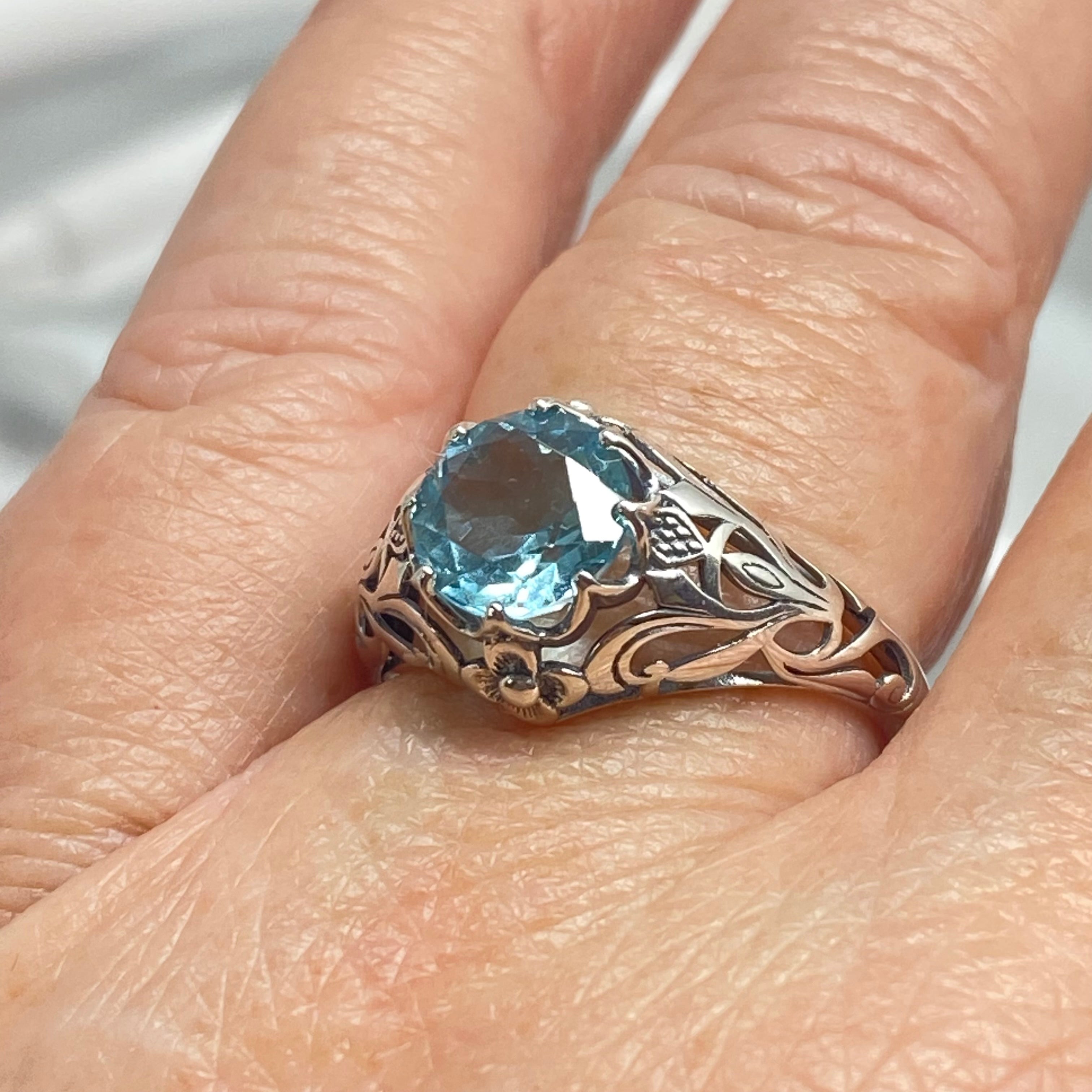 This is a sterling silver filigree ring inspired by Art Nouveau movement of the early 20th century. This beautiful floral filigree ring is set with a simulated blue aquamarine stone. The round full cut gem is 8mm in diameter. The ring measures 12mm North to South on the finger. The band is marked 925 for sterling silver.