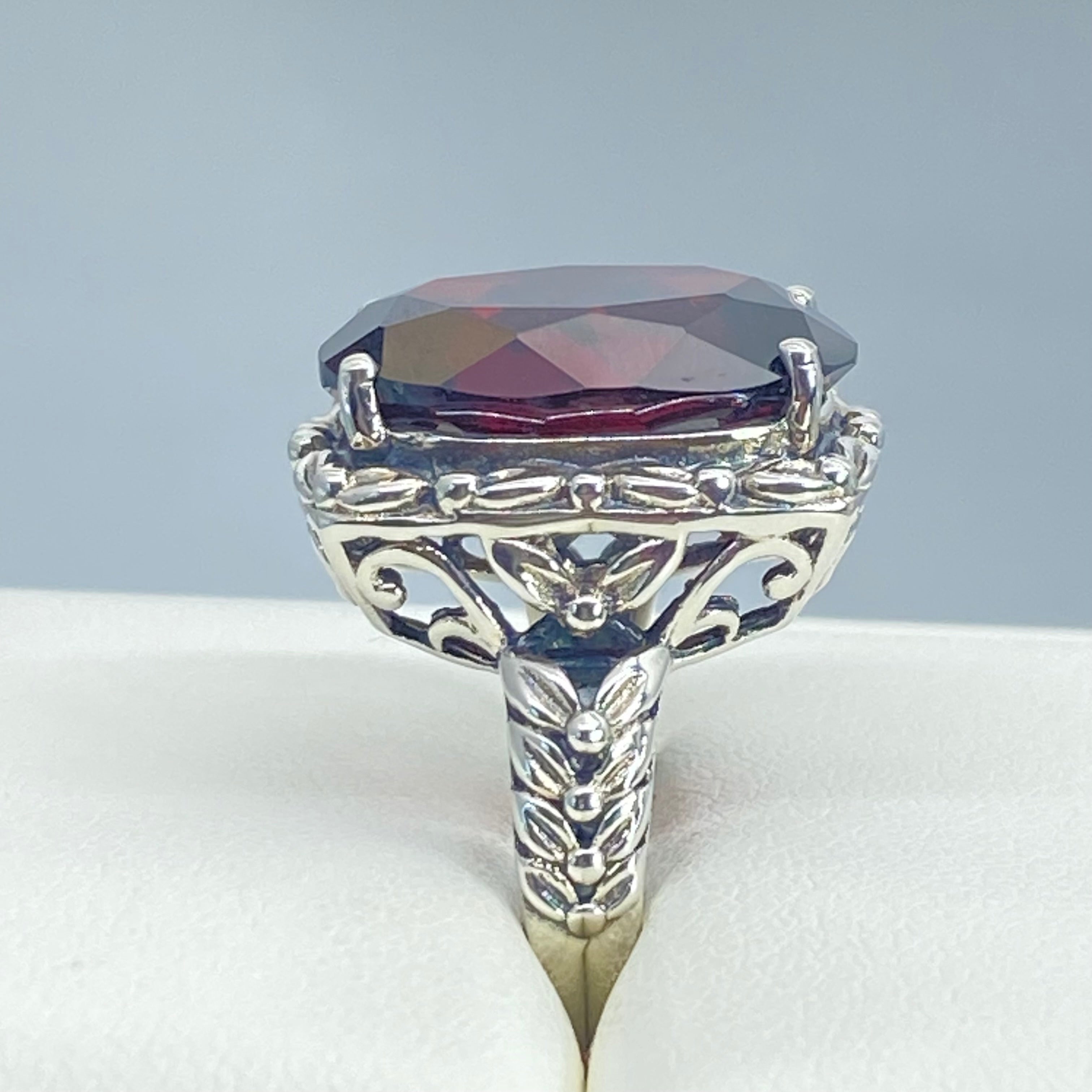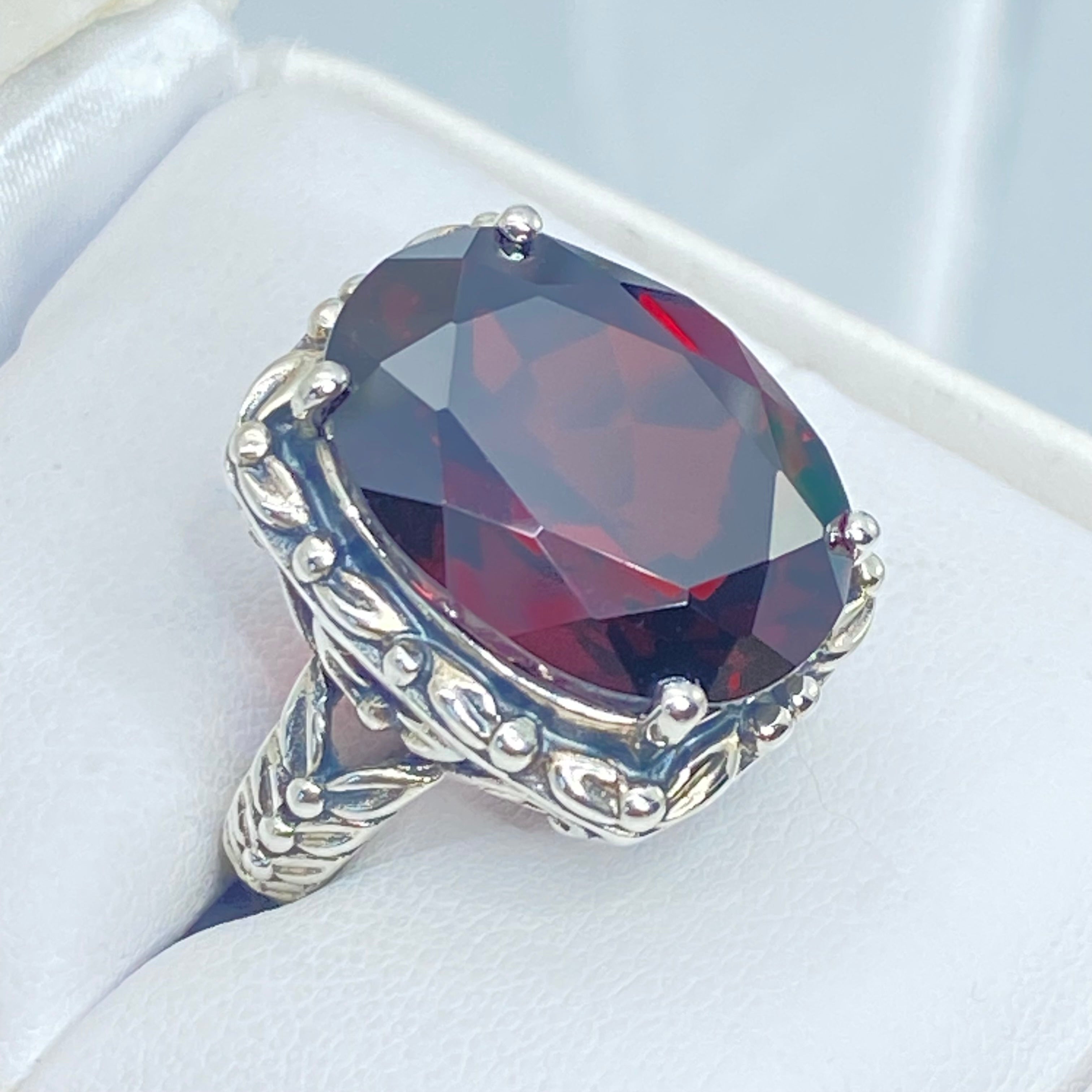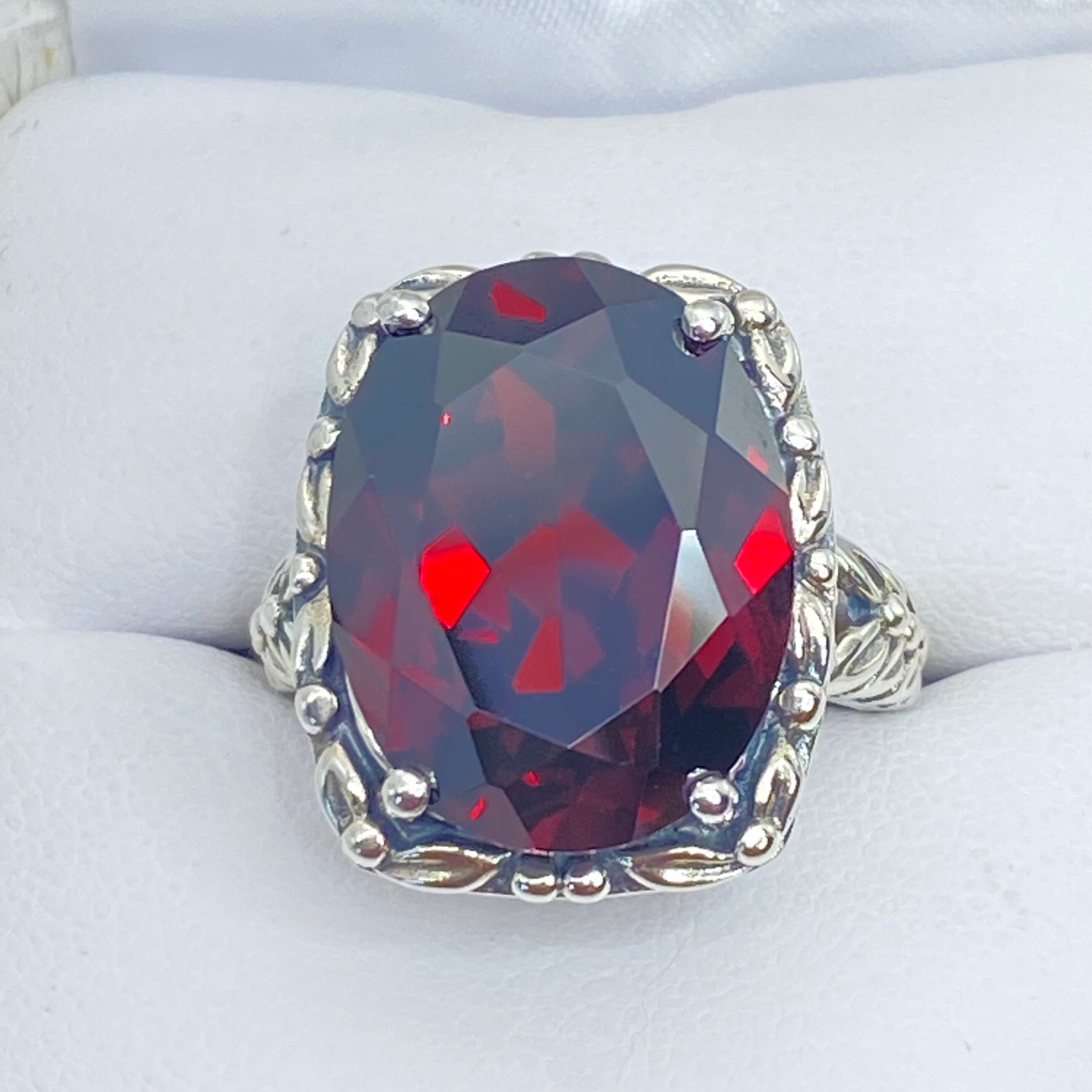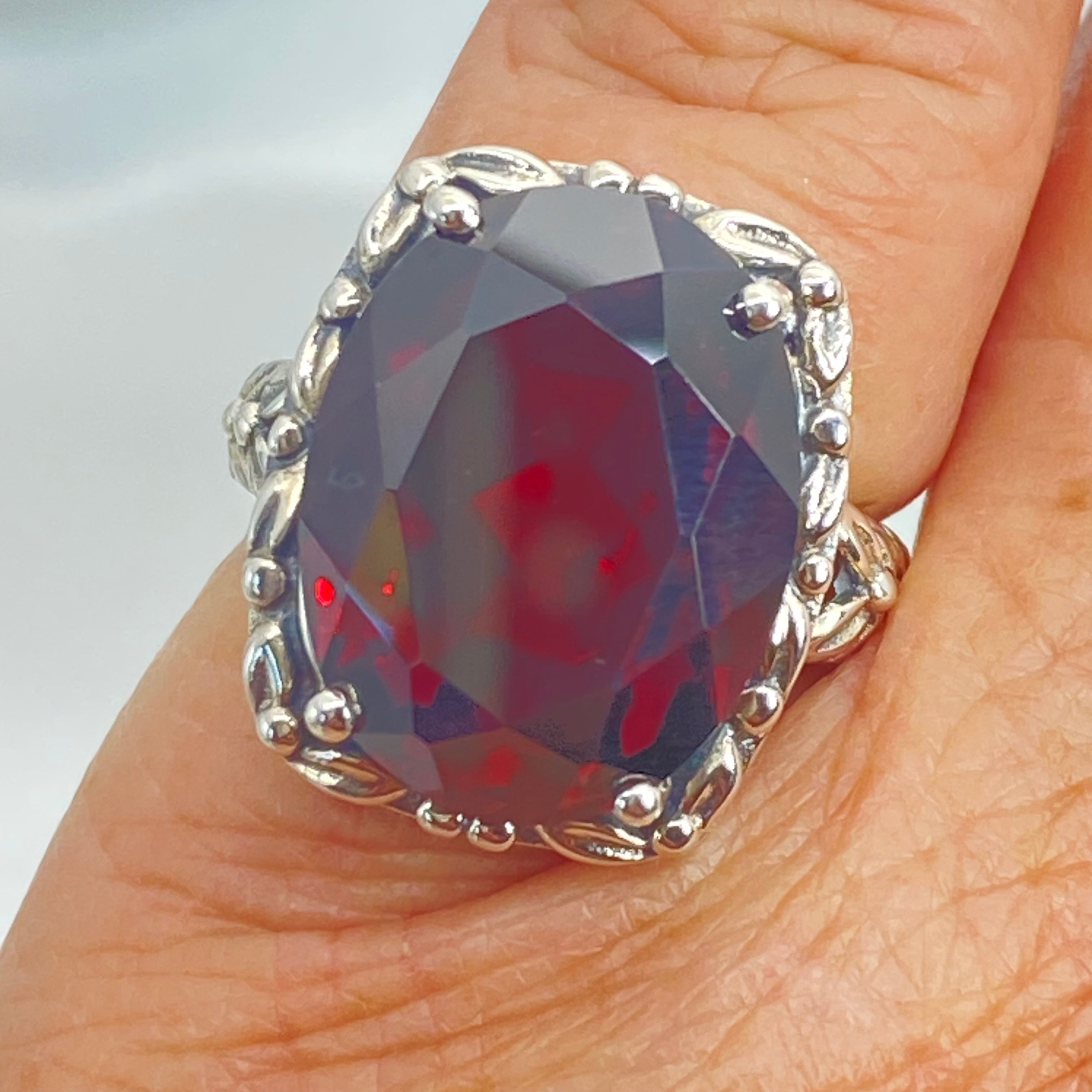 Red Garnet CZ Ring, 12ct Oval Gem, Leaf Accent Vintage Jewelry D120