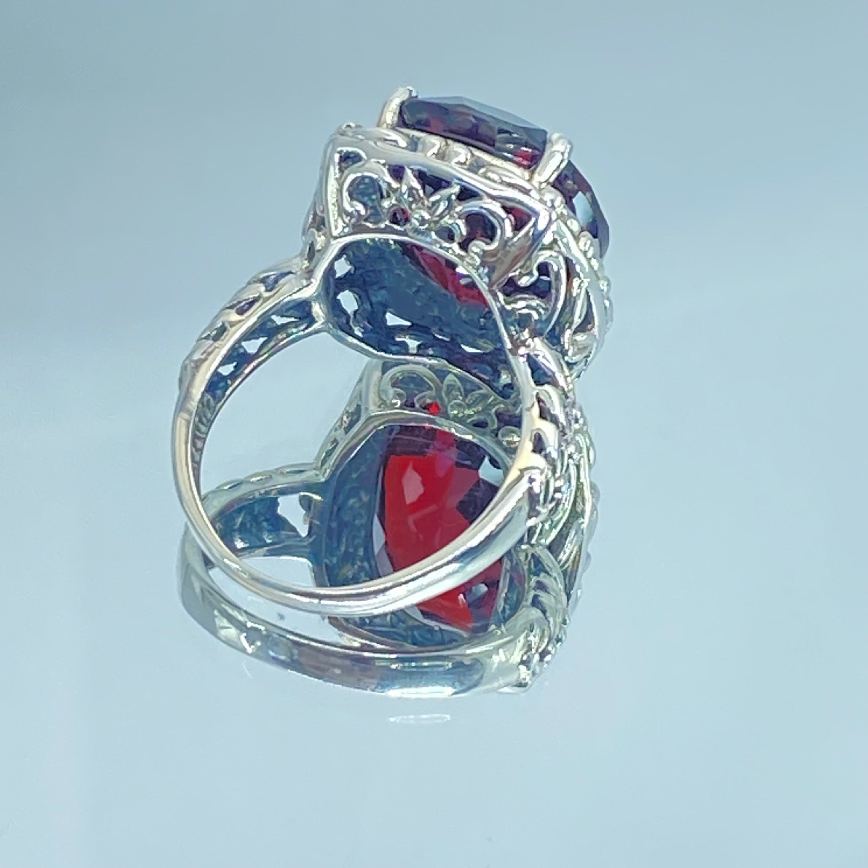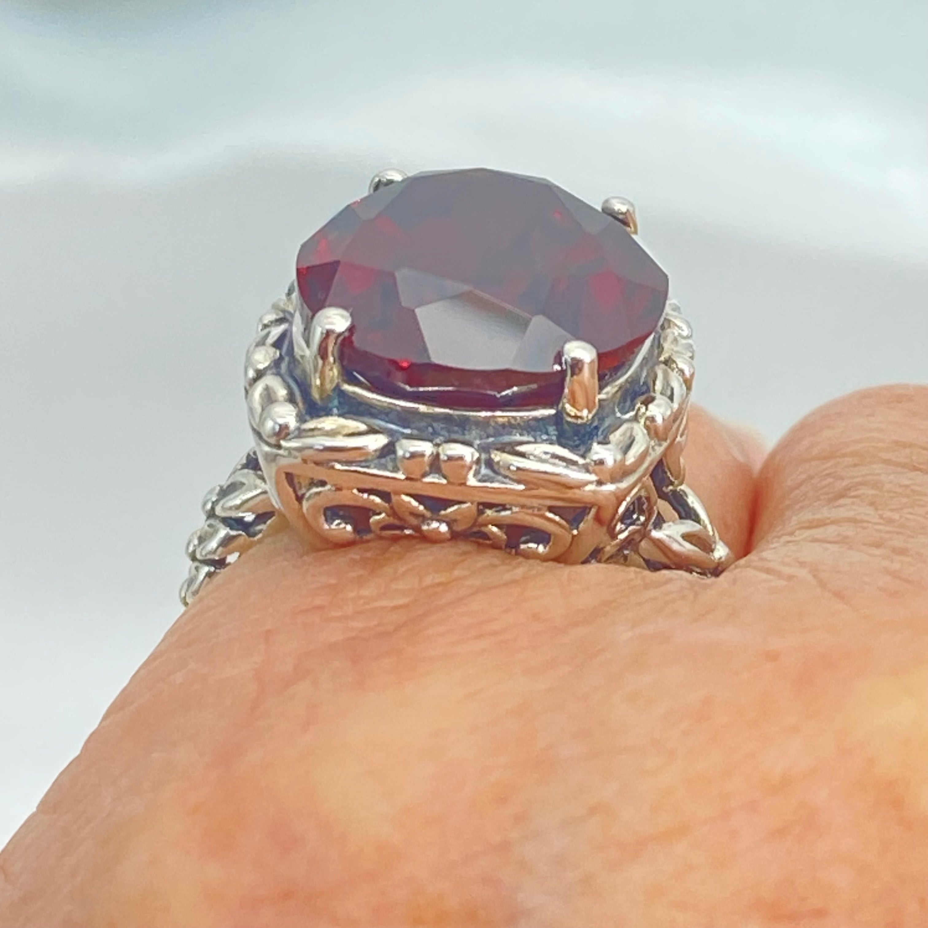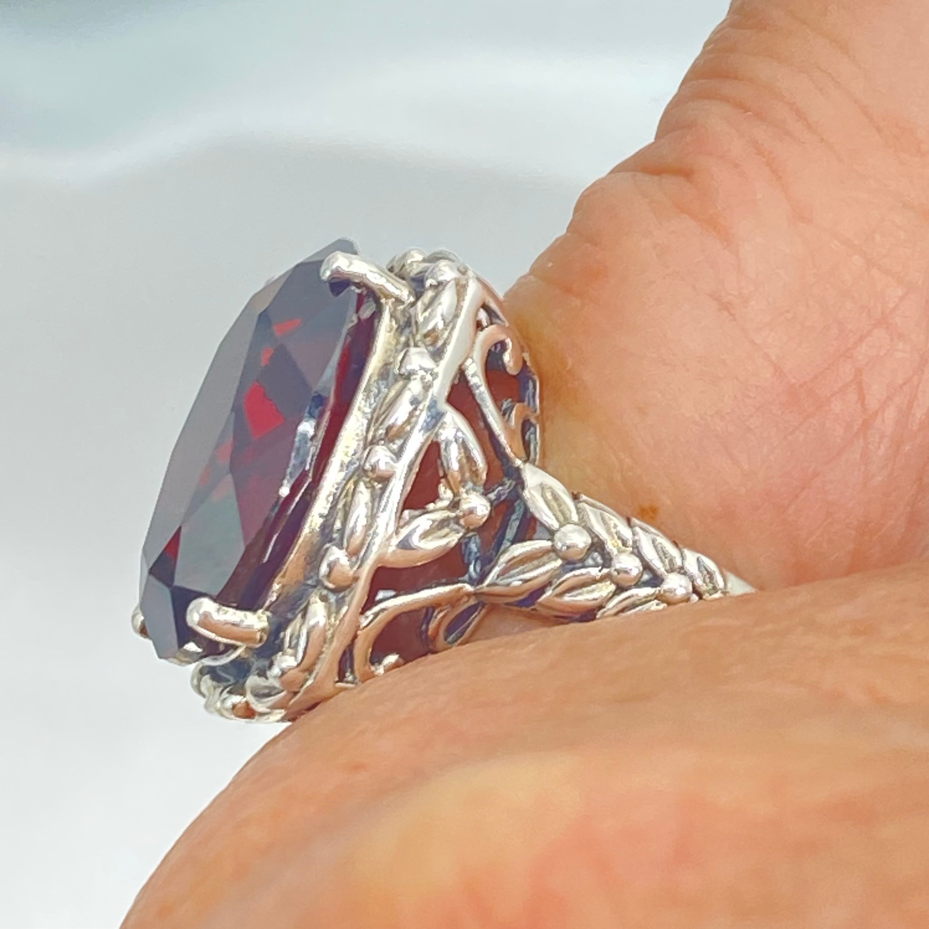 Measuring 18mm by 14mm, this striking ring is perfect for those who appreciate timeless beauty. Its bold yet feminine design makes it a unique addition to any jewelry collection. Indulge in the beauty of this Red Garnet CZ Ring and embrace its old world charm. Whether it's for a special occasion or everyday wear, this ring is sure to turn heads and make a statement. Don't miss out on adding this exquisite piece to your jewelry collection.
