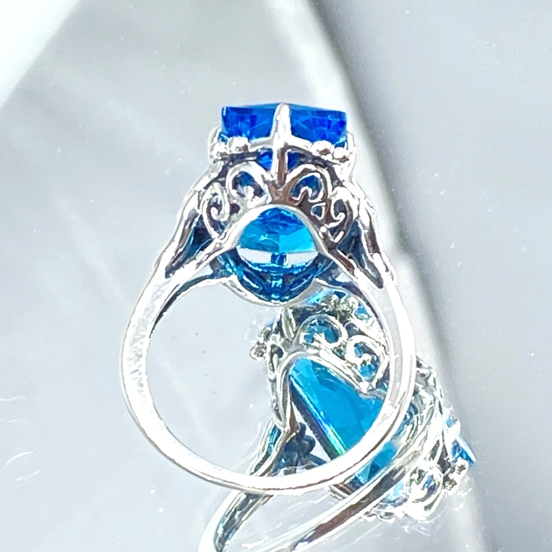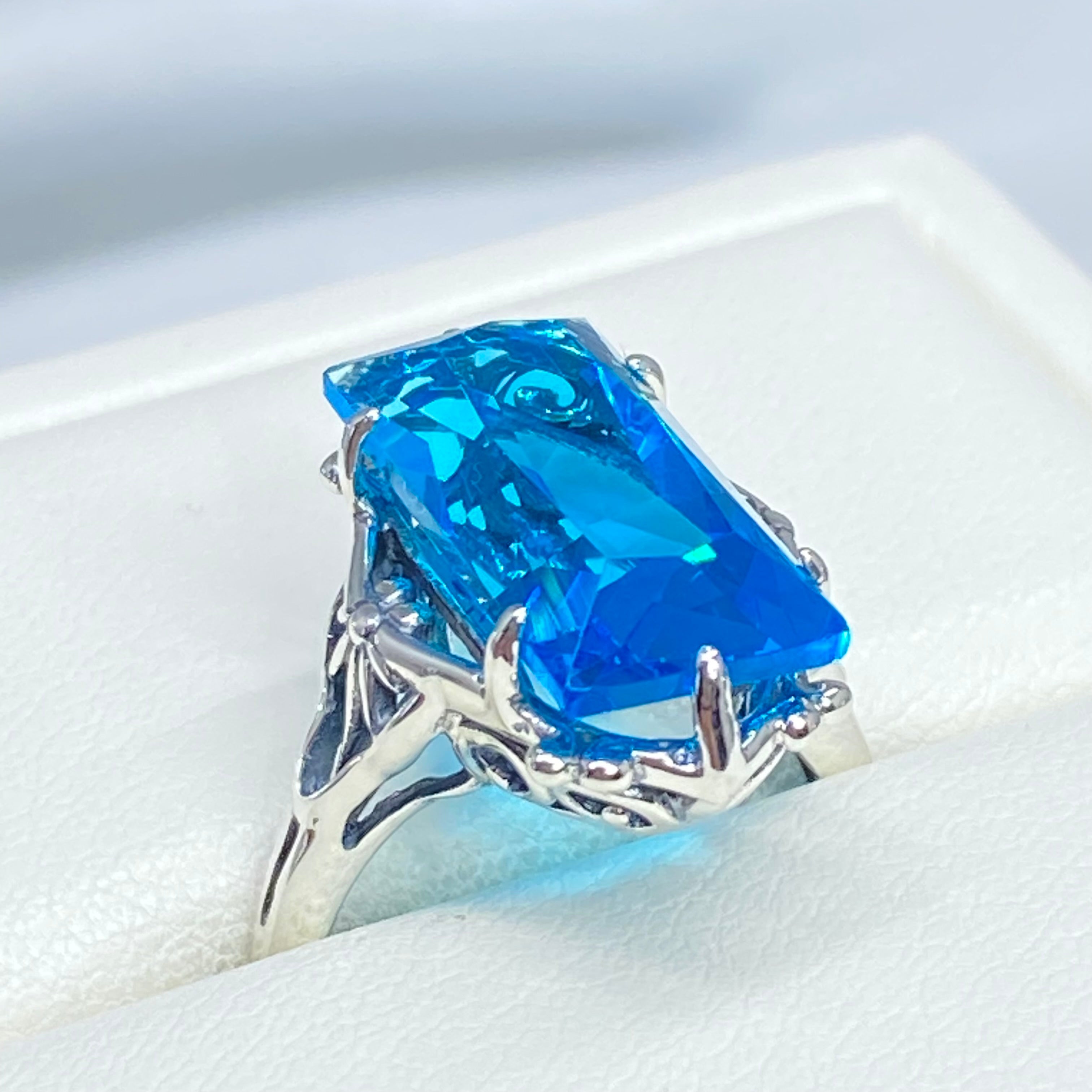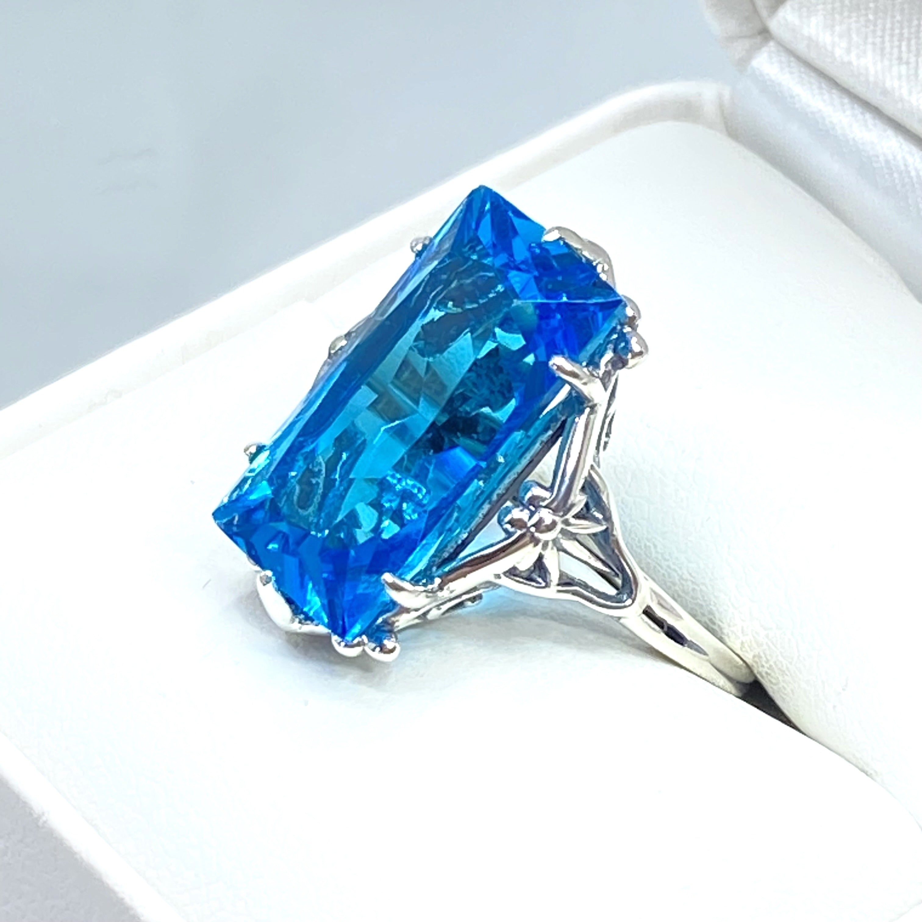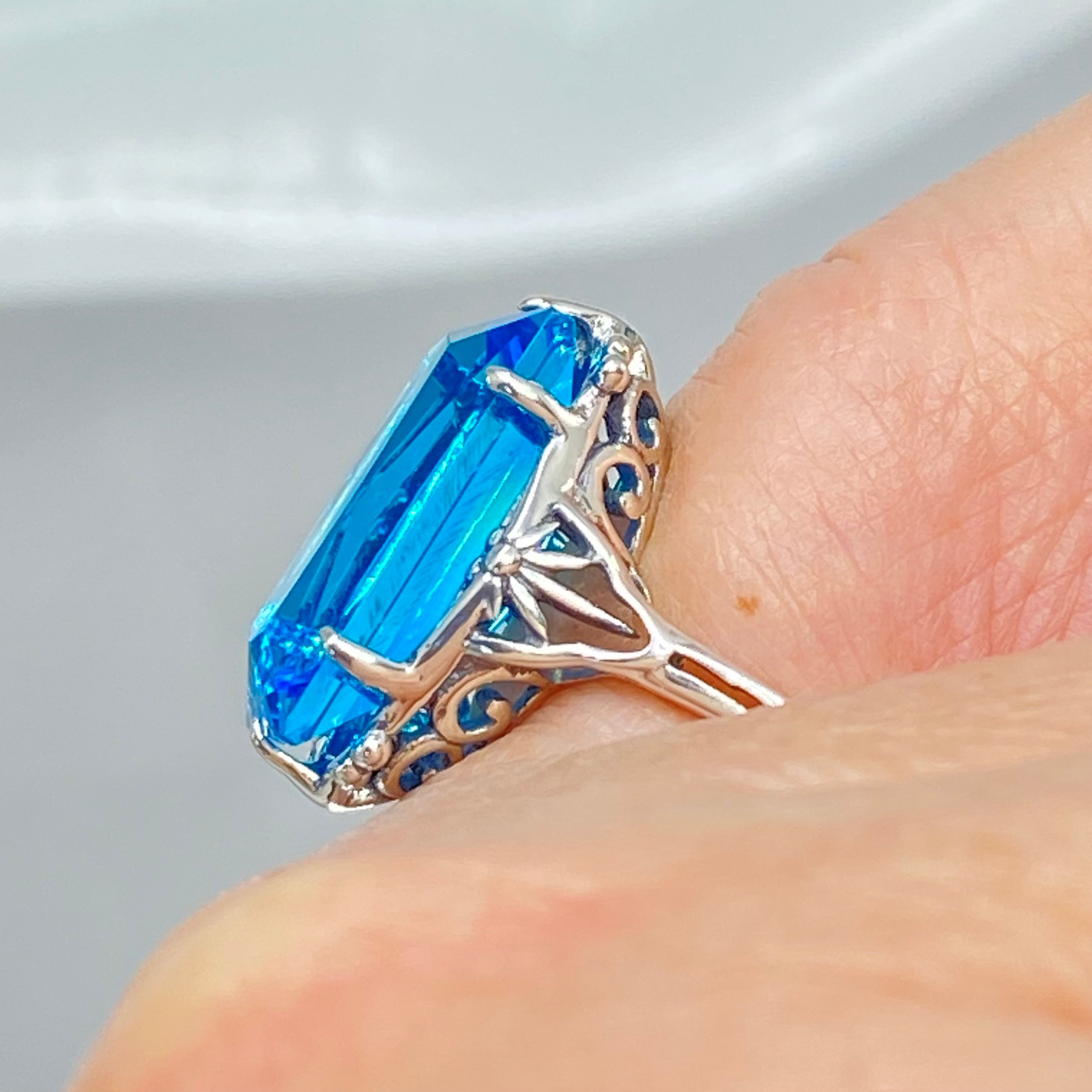 Inspired by the intricate Gothic and Renaissance designs of centuries past, this stunning filigree ring brings antique elegance to modern wear. Crafted in sterling silver and marked 925, it features a flawless 7-carat simulated blue aquamarine gemstone that catches the light beautifully. The baguette rectangle-cut stone measures 18mm long by 9mm wide, creating a striking focal point on your hand. The band sits 8mm off your finger for comfortable everyday wear. This ring is ready to ship and perfect for those who appreciate vintage-inspired jewelry with a contemporary twist. Whether you're drawn to gothic aesthetics or simply love the timeless appeal of ornate metalwork paired with brilliant gemstones, this piece delivers both sophistication and character.