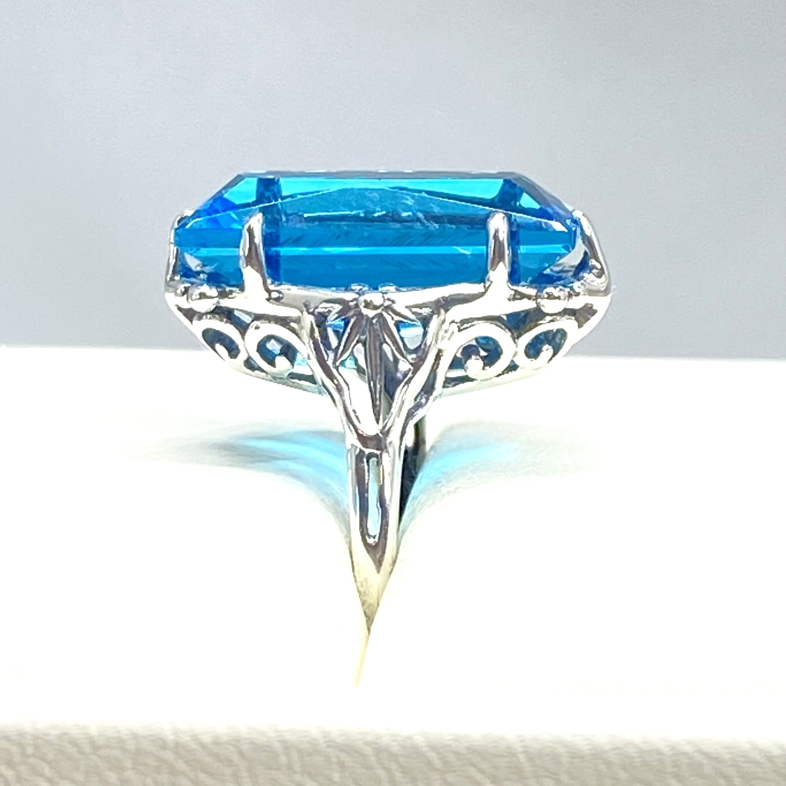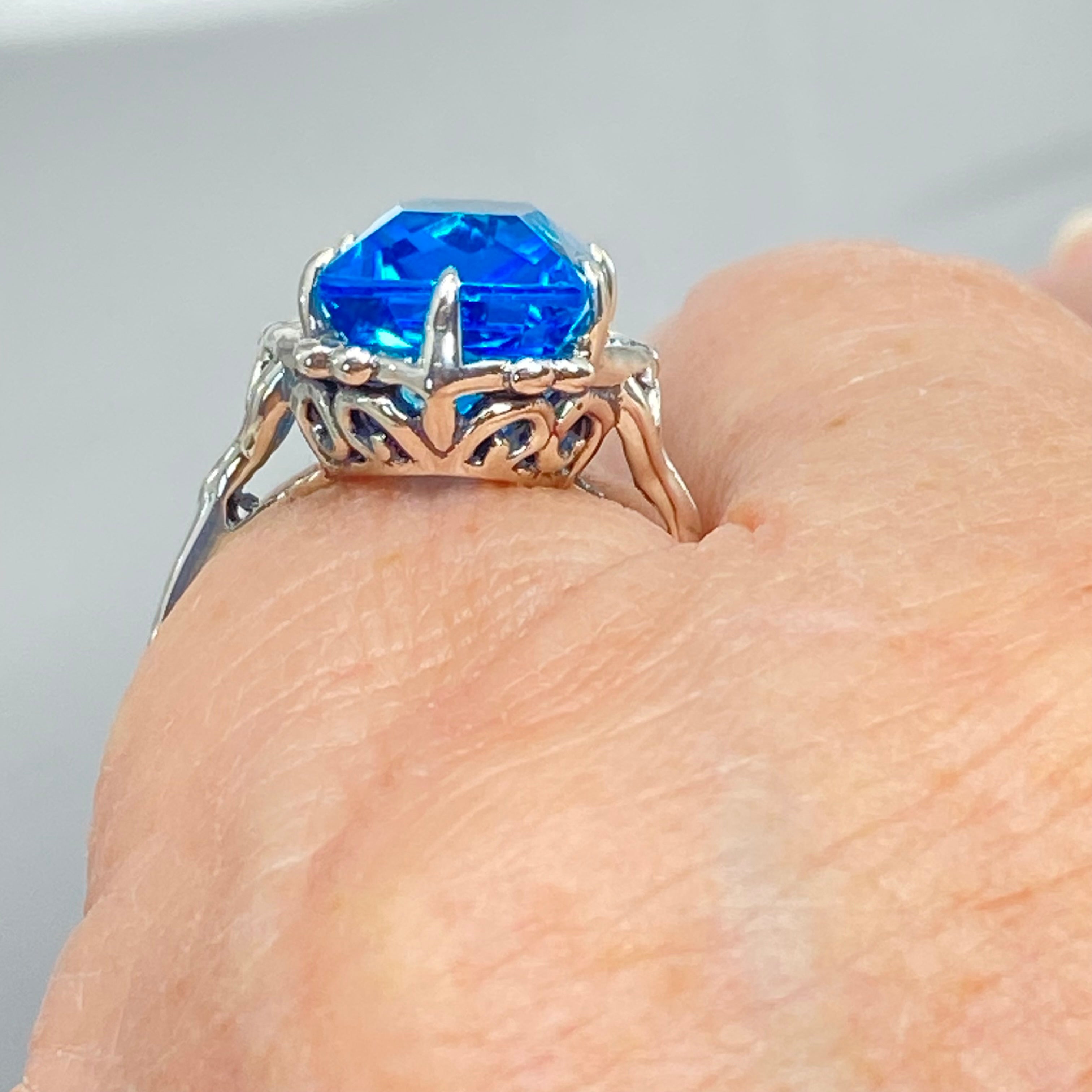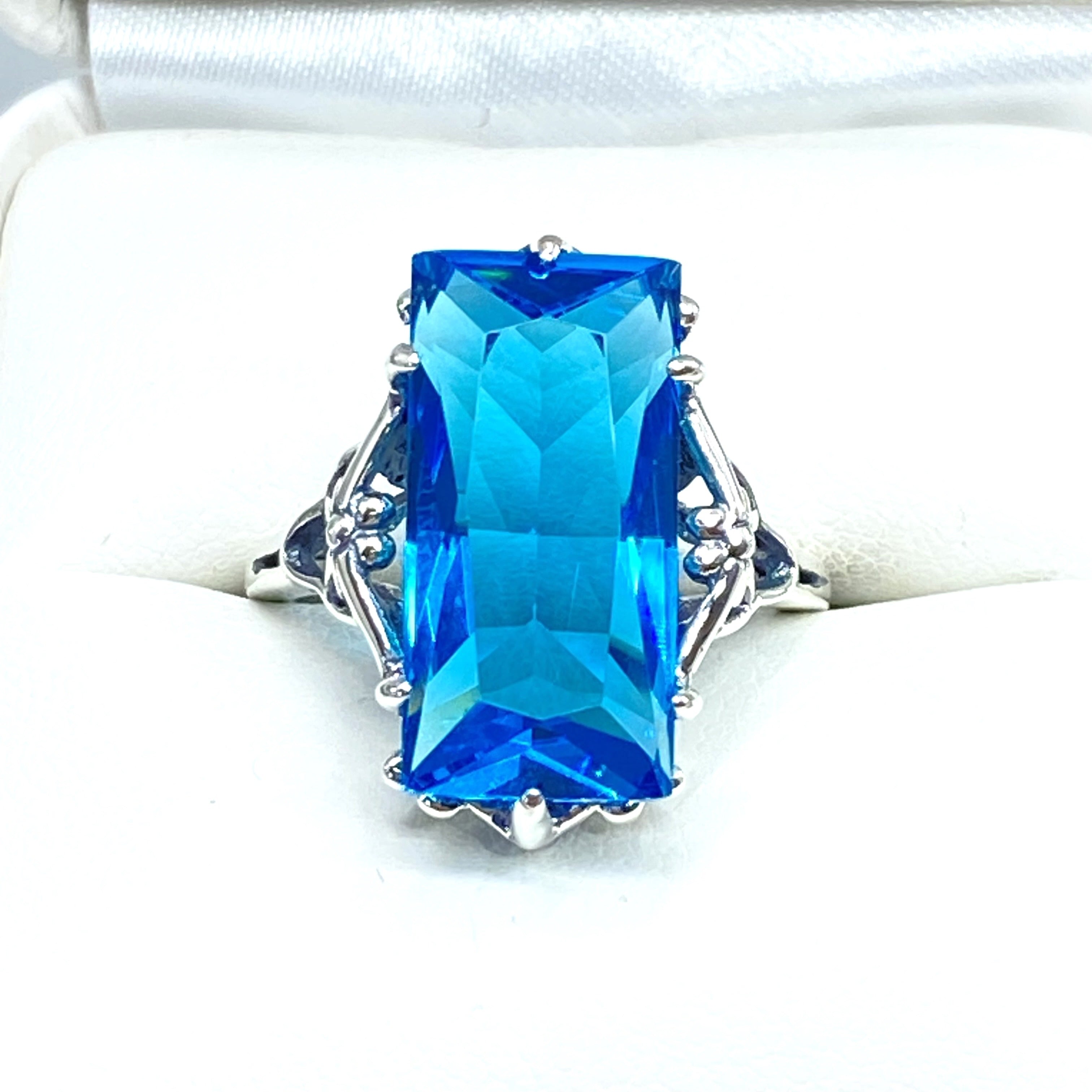 Swiss Blue Topaz Ring, Size 7, Baguette Gem, Gothic Filigree, D67 - Ready to Ship