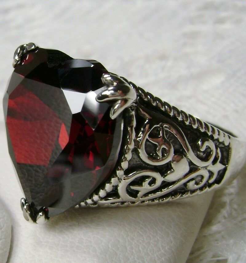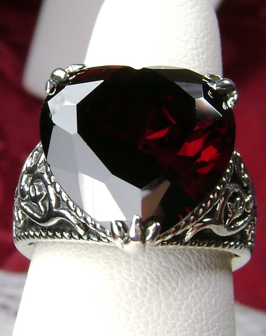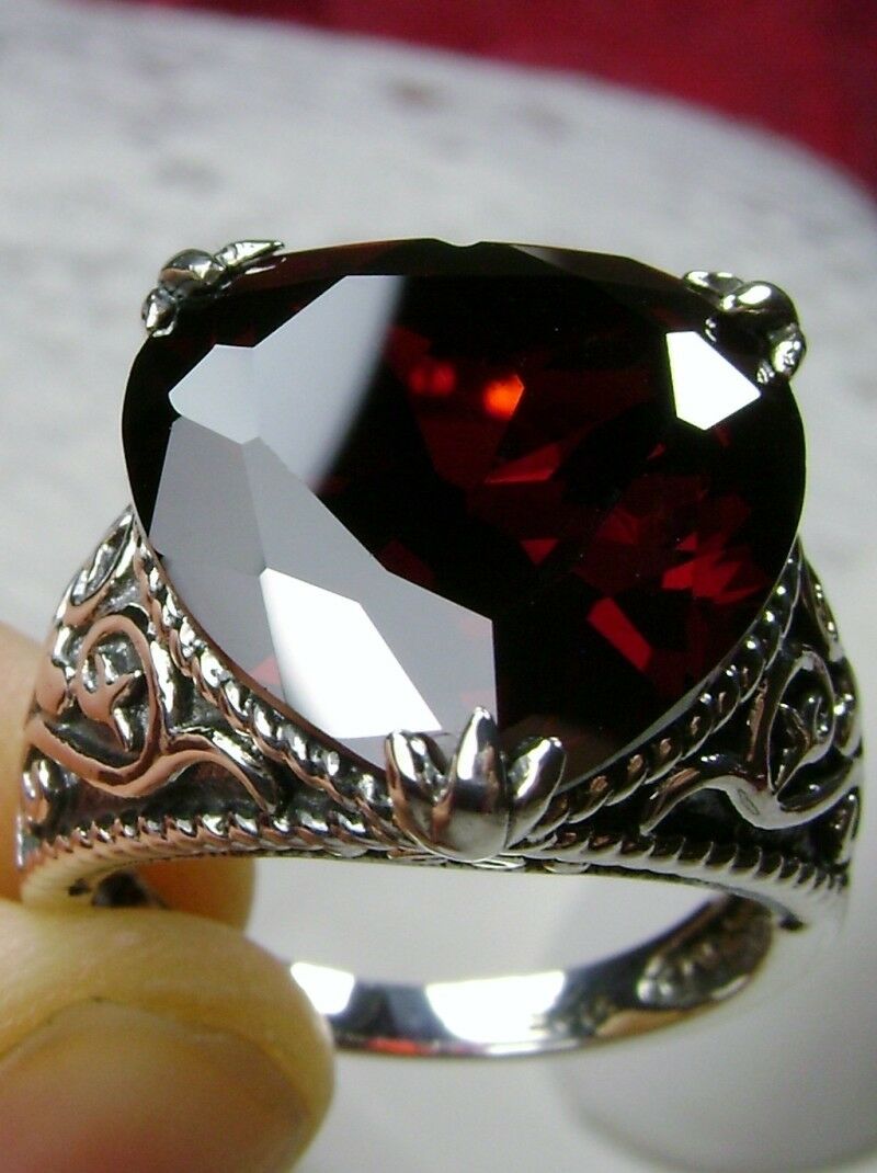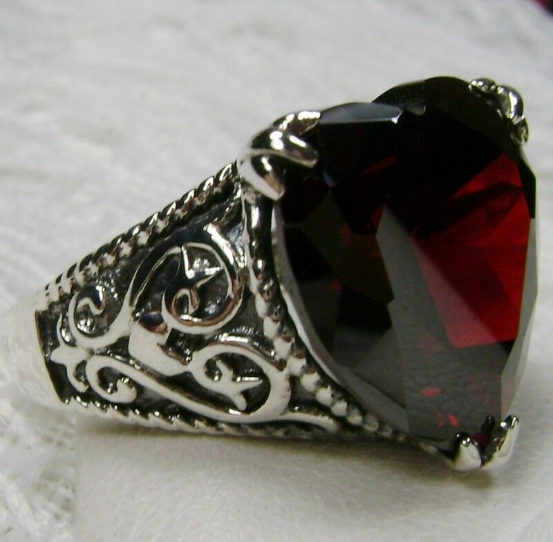 Discover the allure of history with this exquisite antique-inspired ring, masterfully crafted in sterling silver. Drawing from the enchanting styles of Gothic and Renaissance designs, this piece showcases a breathtaking 10ct flawless Red Garnet Cubic Zirconia gem.