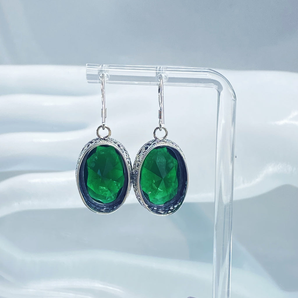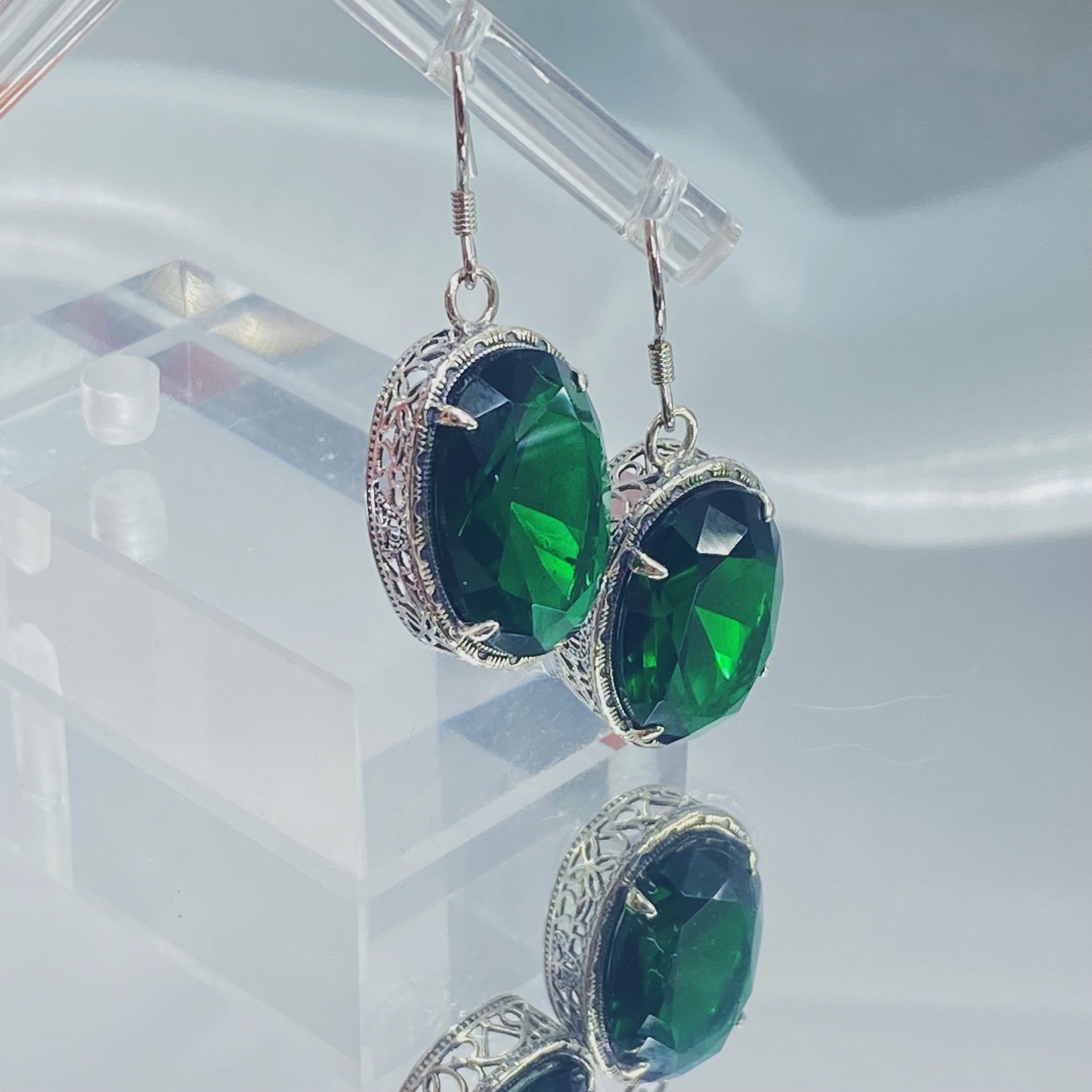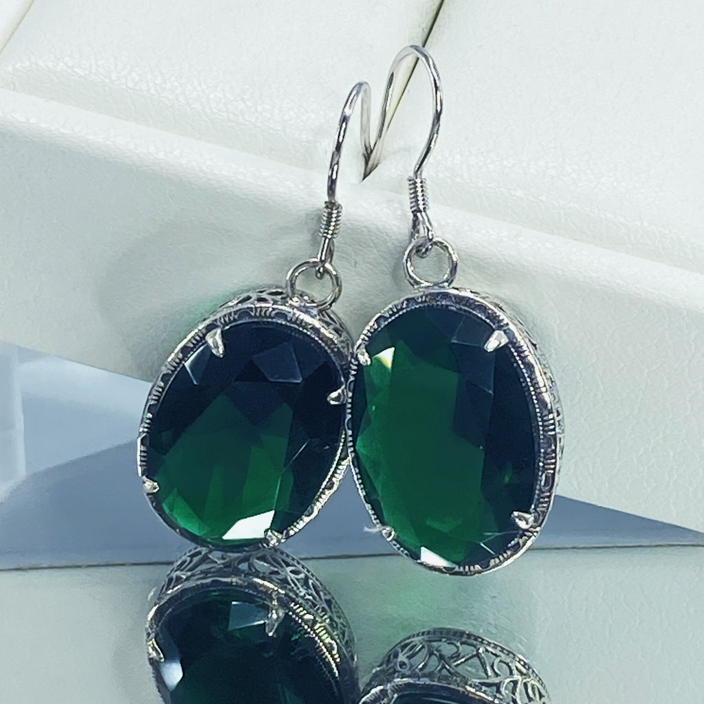 Indulge in the timeless elegance of these exquisite earrings featuring stunning oval simulated emerald gemstones, each measuring 18mm x 13mm. Suspended gracefully at 1-3/4 inches in length and boasting a width of 5/8th of an inch (15mm), these earrings are sure to captivate attention wherever you go.