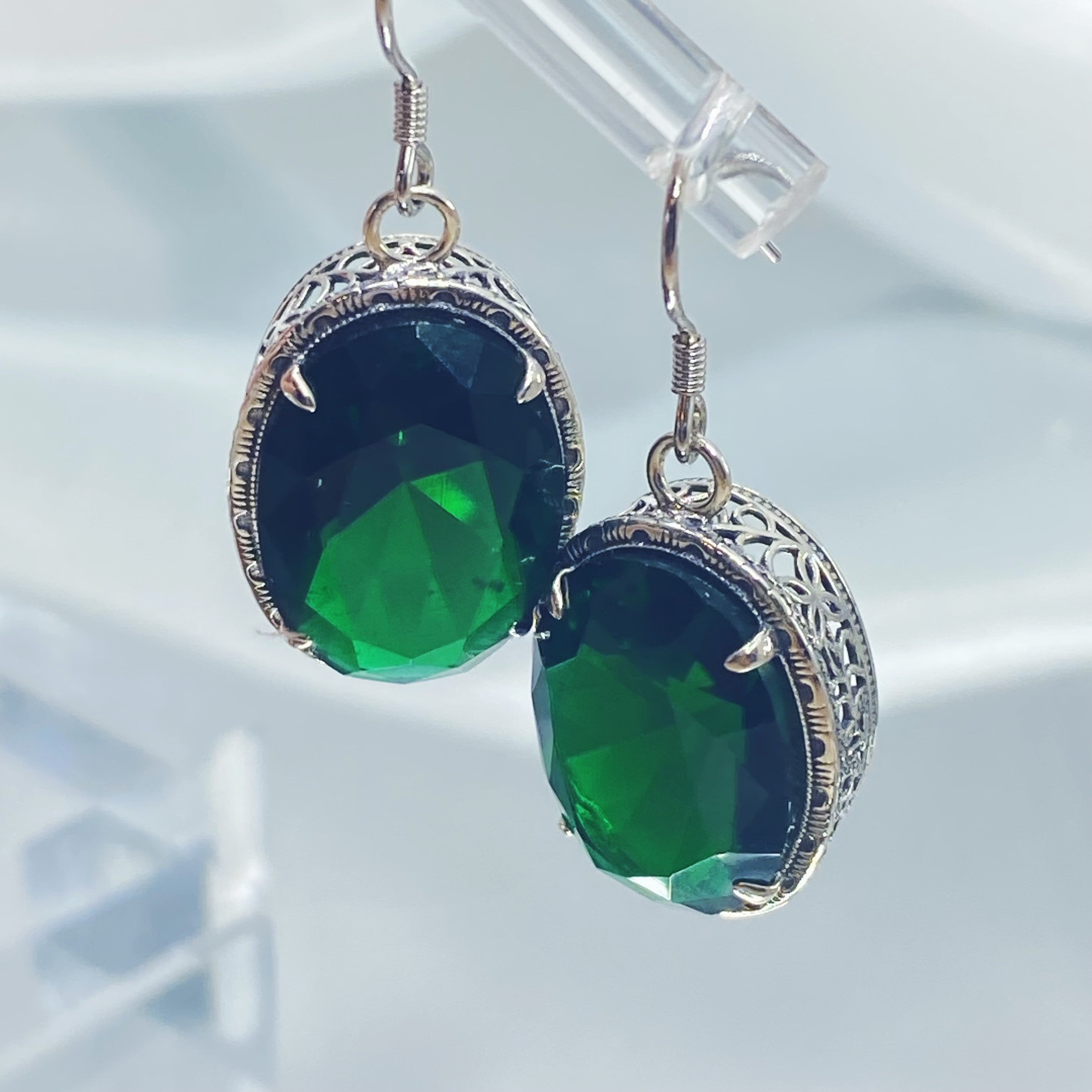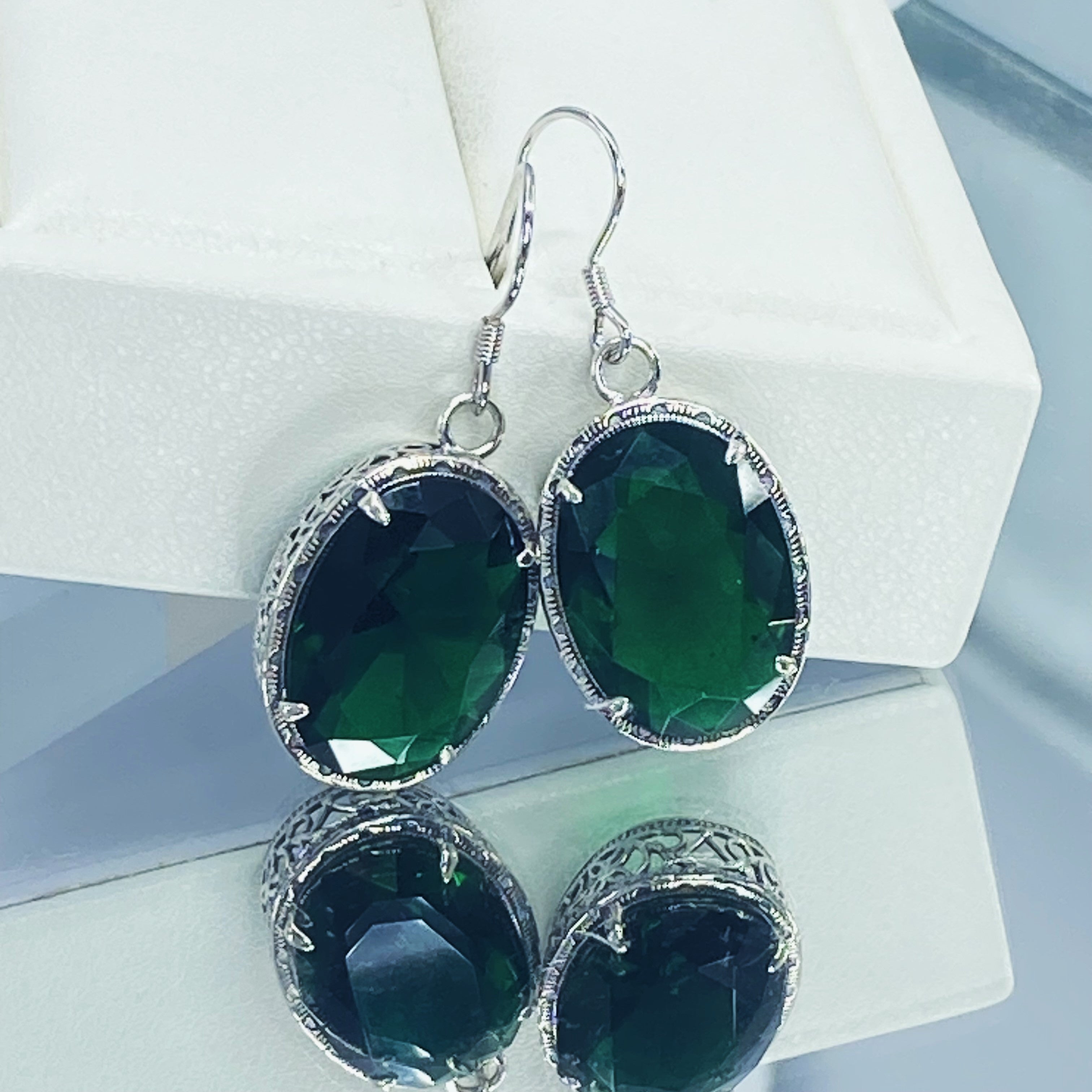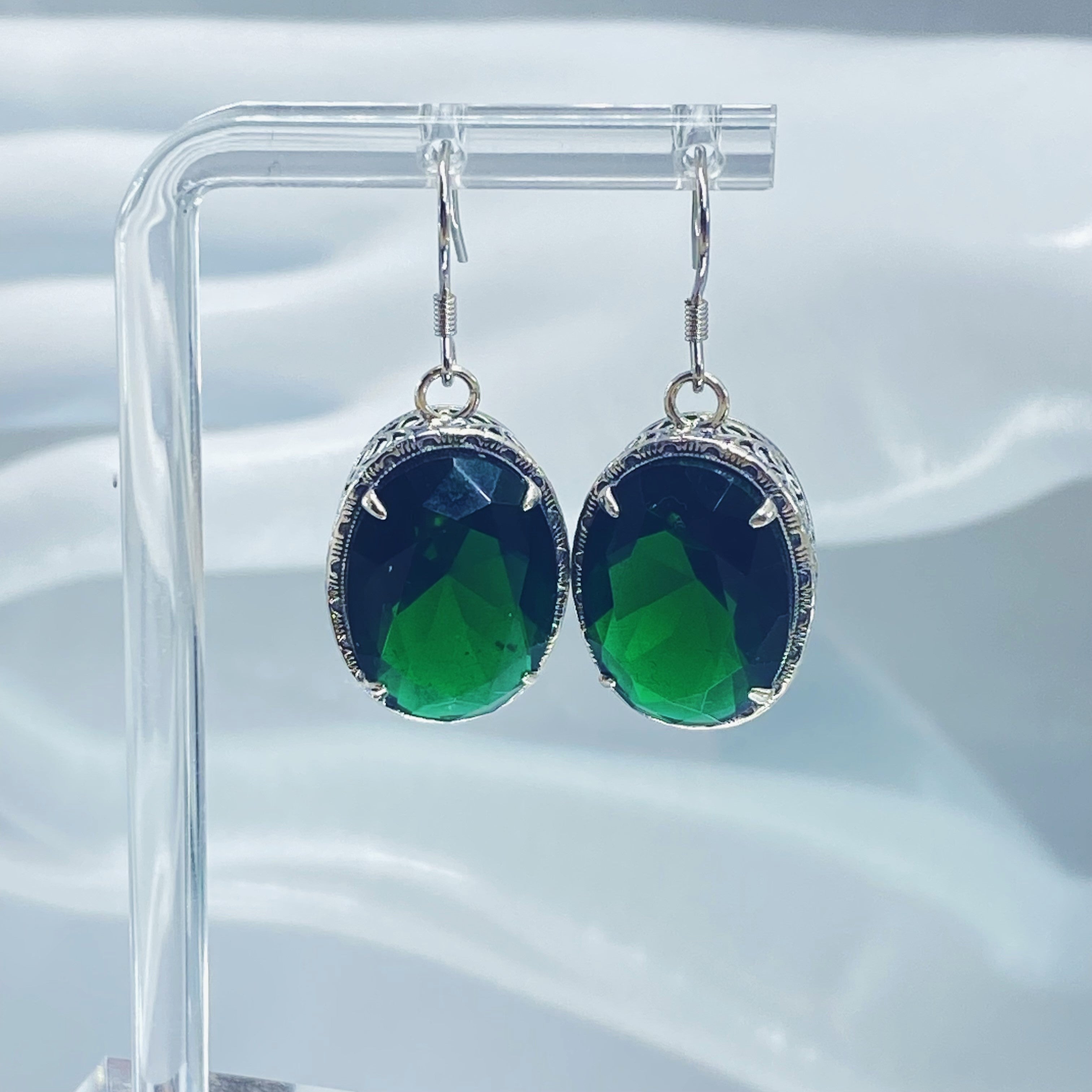 Indulge in the timeless elegance of these exquisite earrings featuring stunning oval simulated emerald gemstones, each measuring 18mm x 13mm. Suspended gracefully at 1-3/4 inches in length and boasting a width of 5/8th of an inch (15mm), these earrings are sure to captivate attention wherever you go.