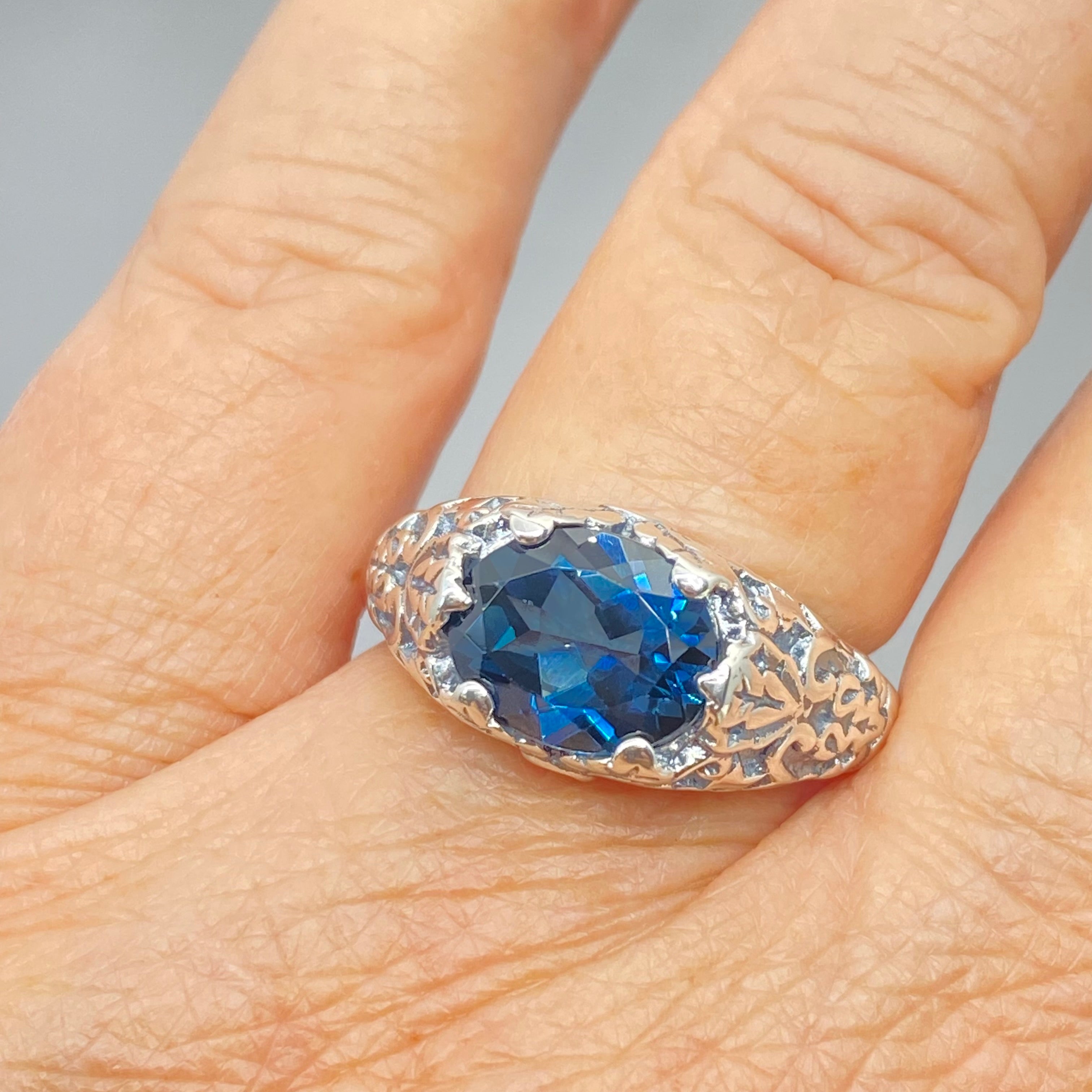 At its heart, a stunning 5-carat natural London blue topaz, flawlessly cut to catch the light and captivate the eye. Measuring 9mm north to south and 11mm east to west, this gem is set in a delicate silver filigree that features an enchanting leaf and ivy motif, a hallmark of Art Nouveau’s love for nature. The ring stands 7.5mm above the finger, offering a graceful yet bold presence.