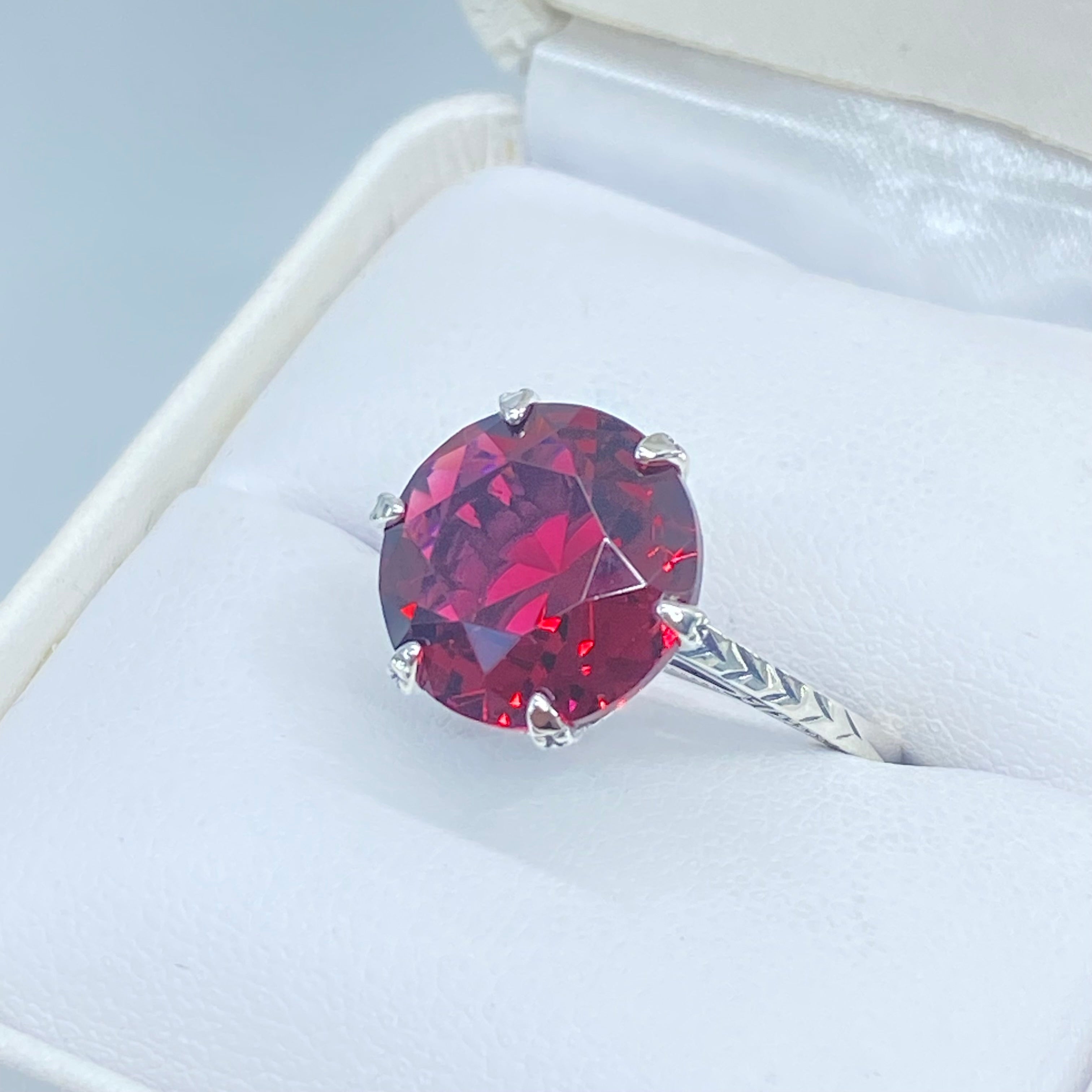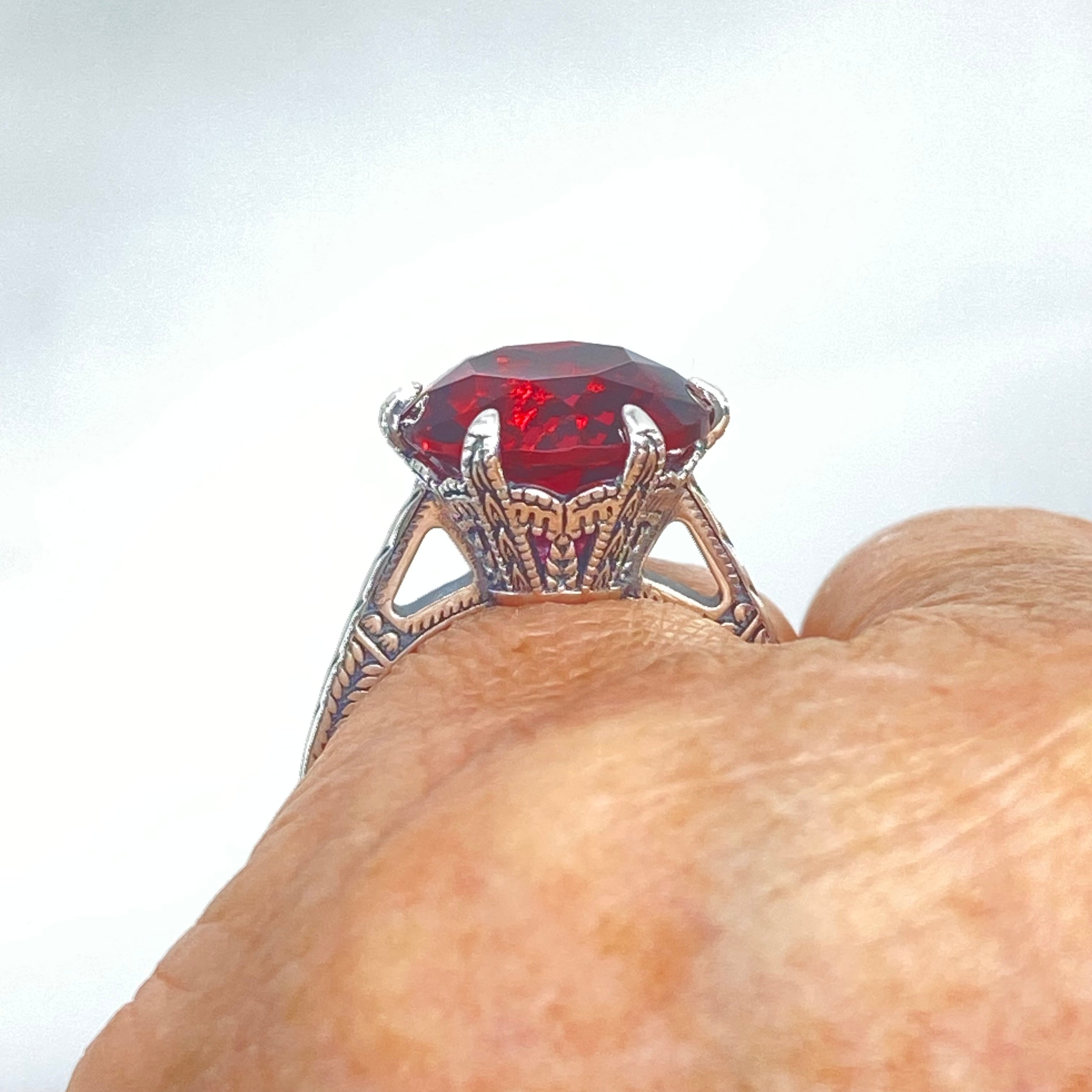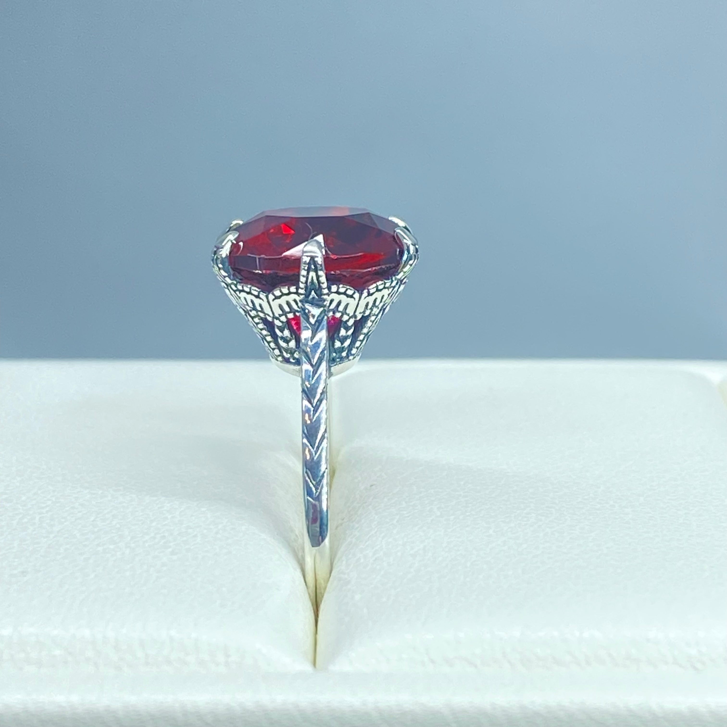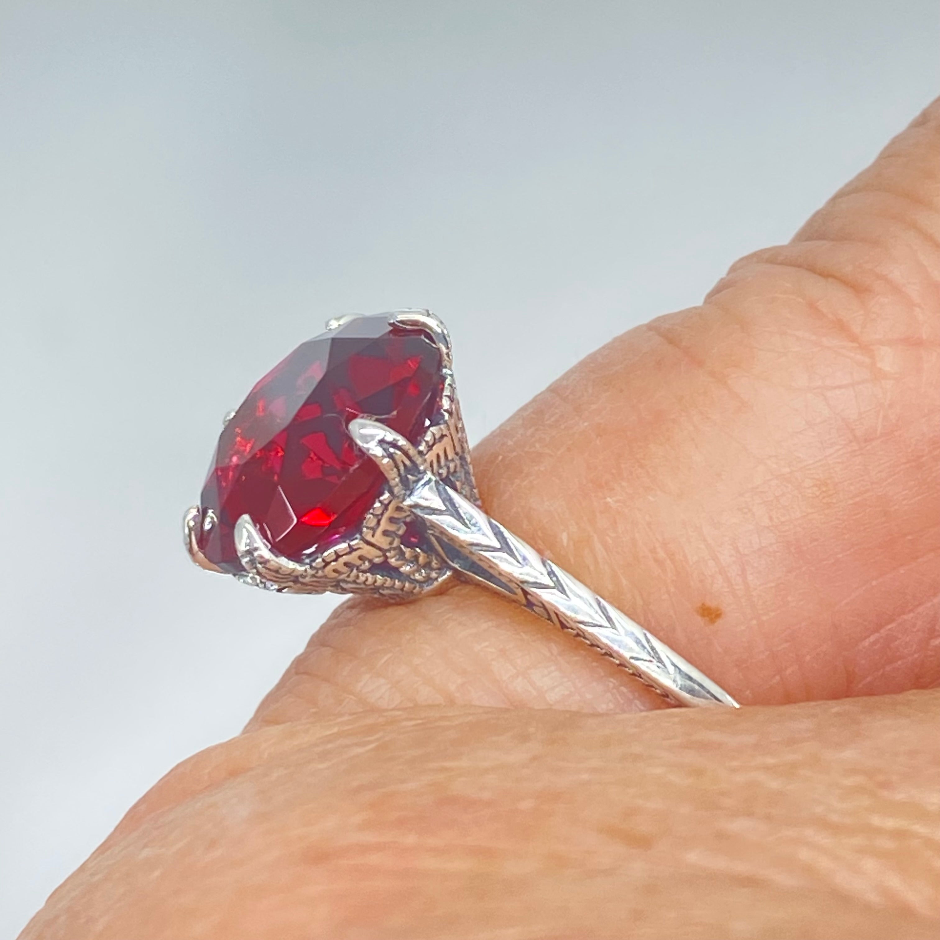 This is an Edwardian reproduction filigree ring in antiqued solid sterling silver. The round full cut high quality Simulated Red Ruby solitaire gemstone is 12mm in diameter. The inside of the band is marked 925 for sterling silver.