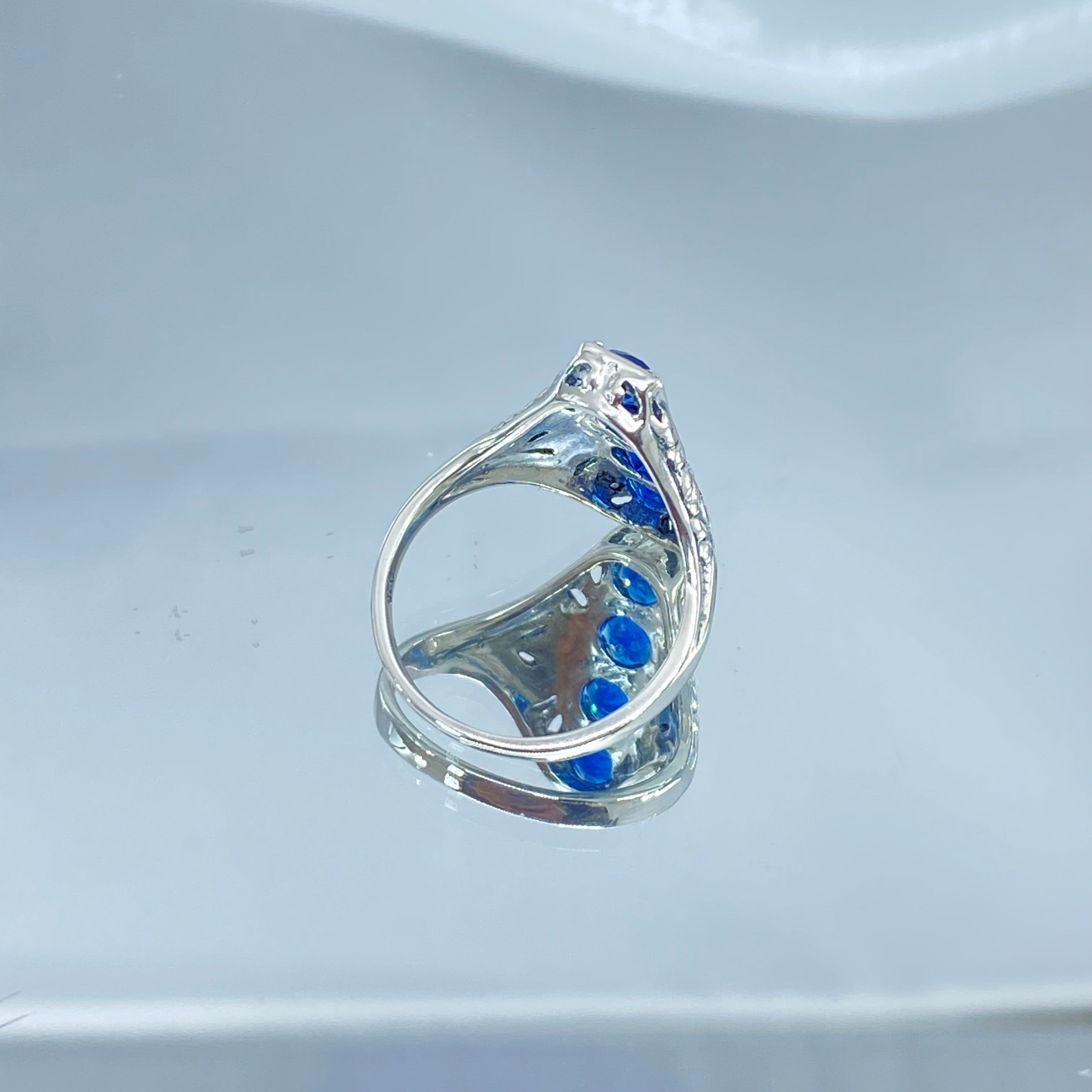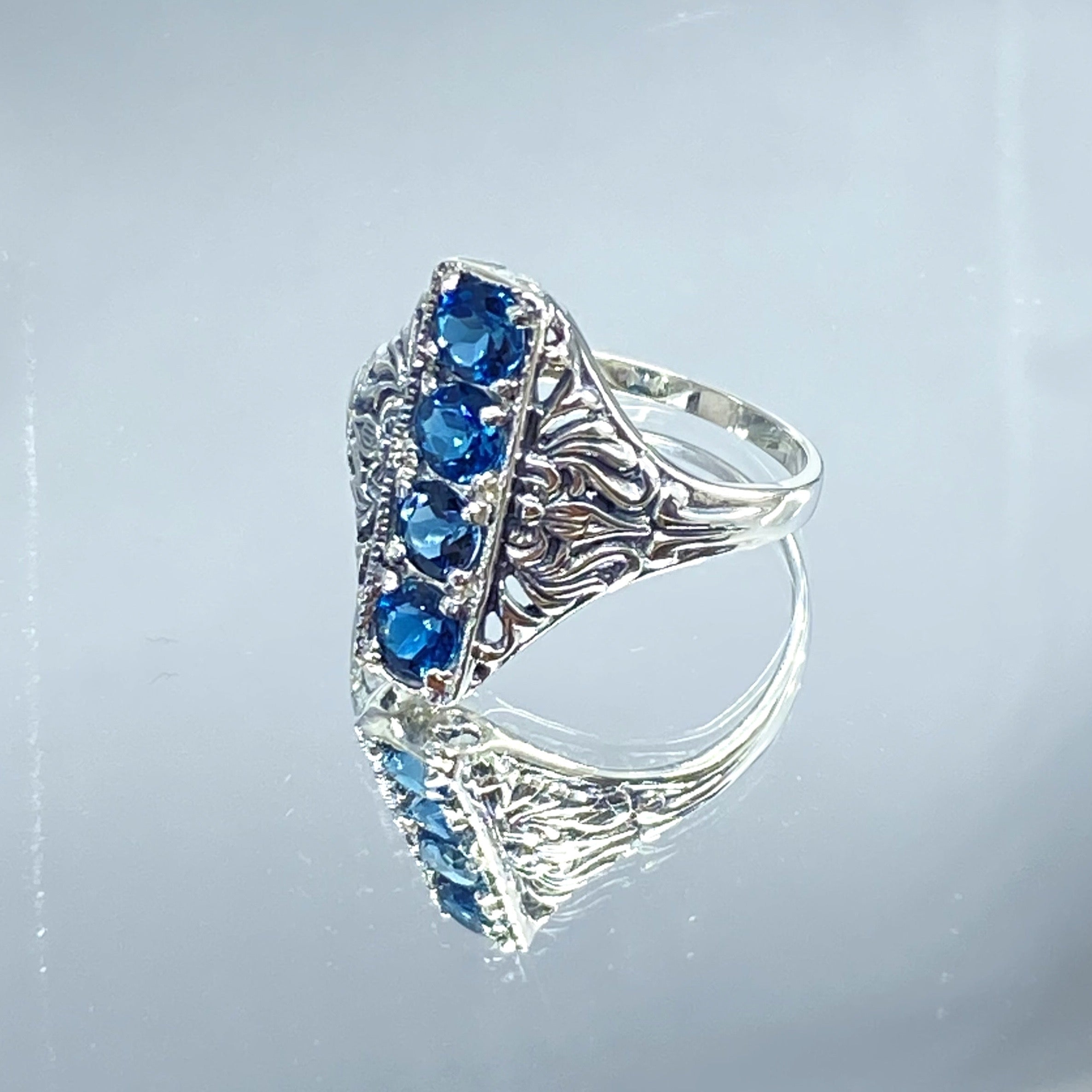 This gorgeous Topaz Ring is a stunning addition to any jewelry collection. Crafted in antiqued sterling silver, this late Victorian, early Edwardian era inspired design features a beautiful swirl filigree and is set with four round simulated London blue gemstones. Each gemstone measures 4mm in diameter, adding a touch of vibrant color to the ring. The intricate filigree setting is a revival of an authentic antique ring, featuring a charming etched band that adds a touch of history to the piece. The ring sits at 3/4th of an inch (19mm) on the finger, making it a bold and eye-catching statement piece.