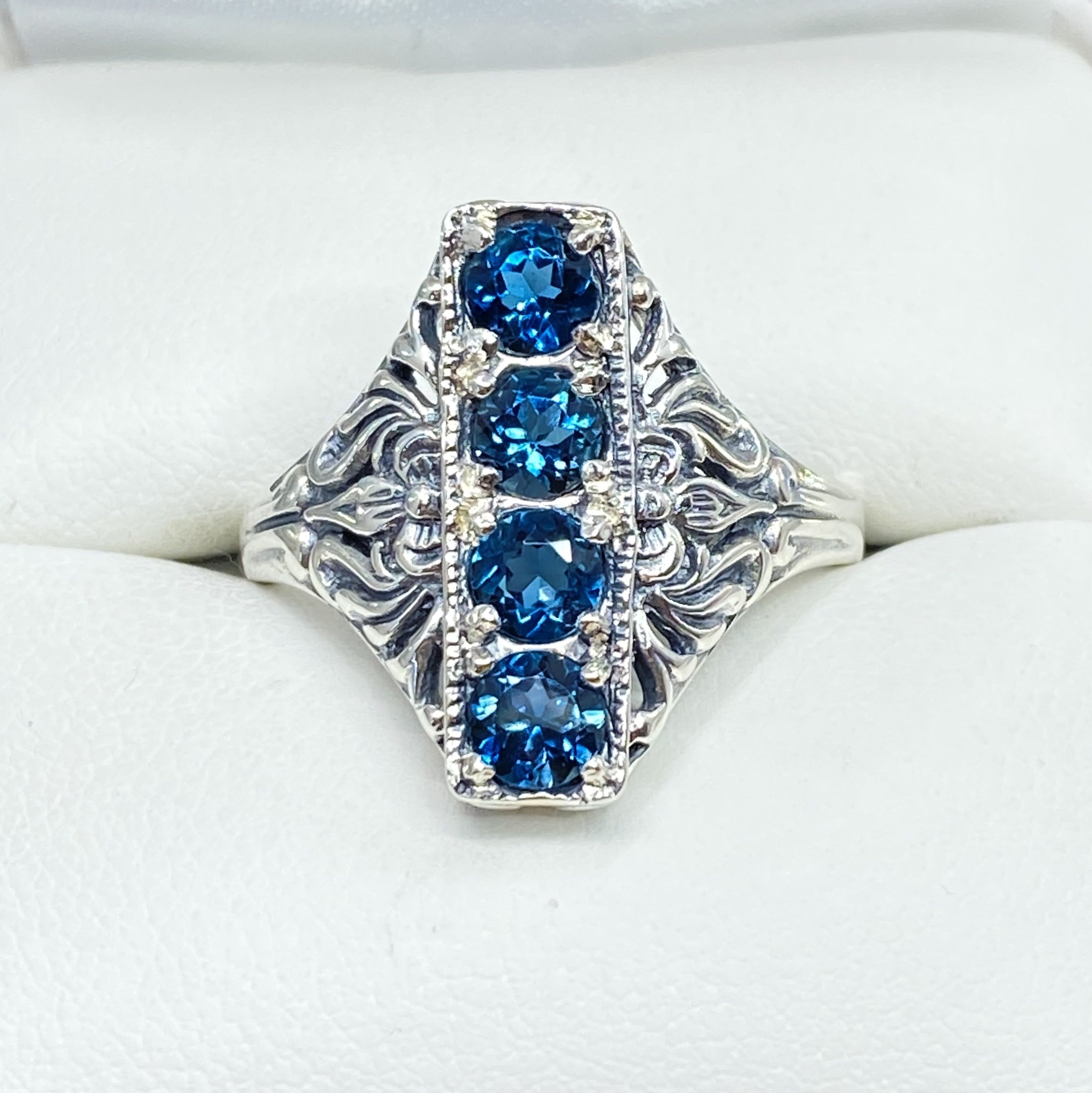 London Blue Topaz Ring, Size 7, Round Four Gem Victorian Swirl Filigree D72 - Ready to Ship