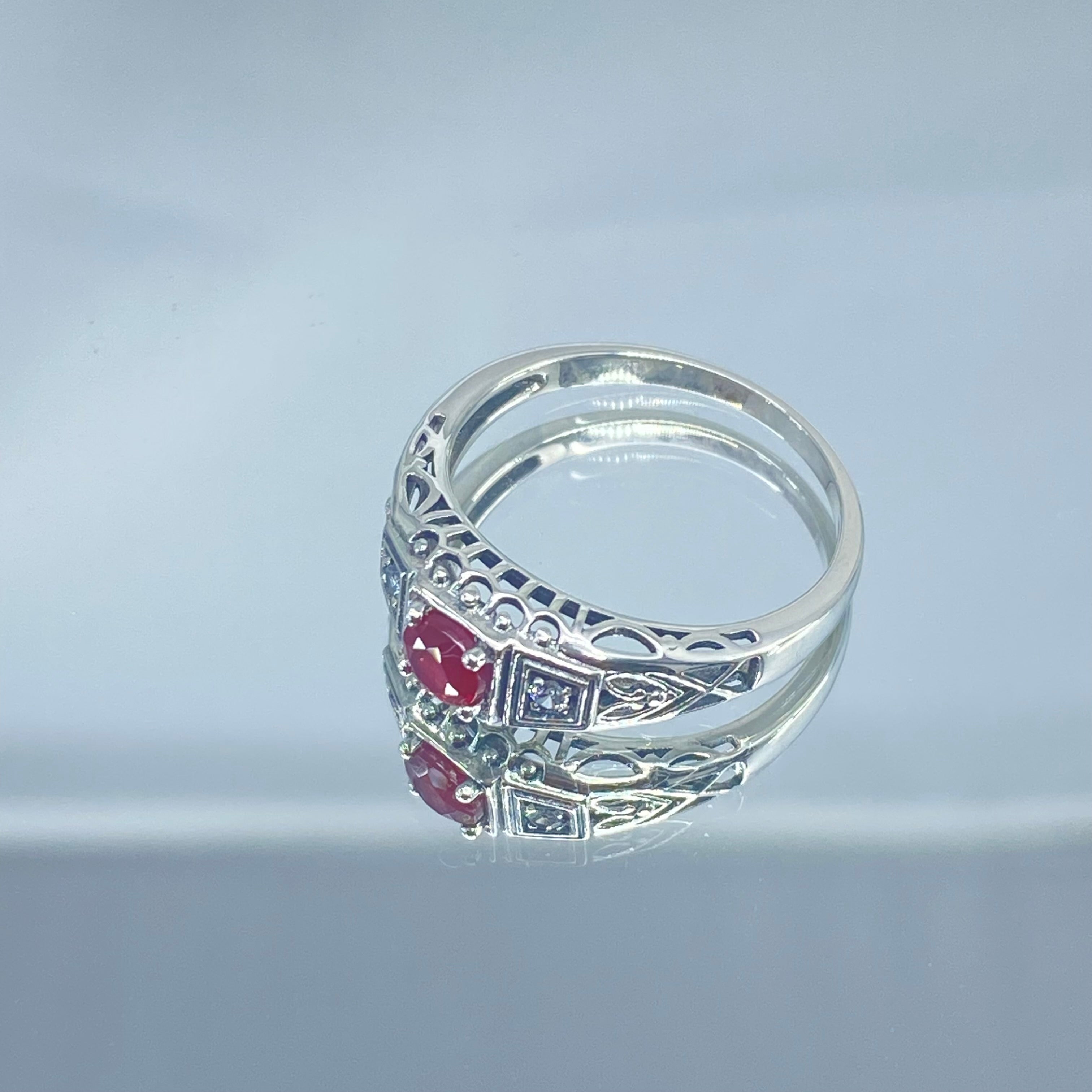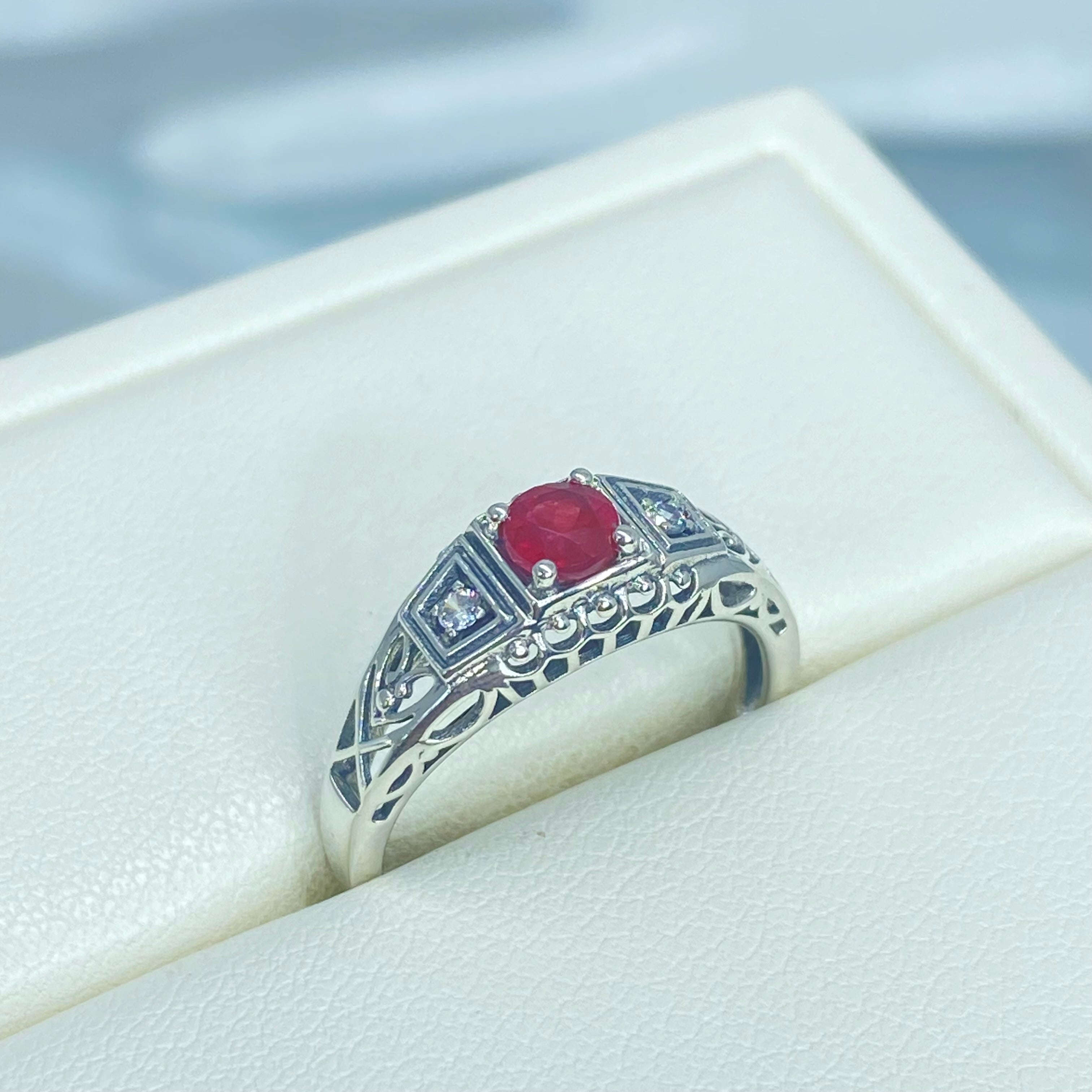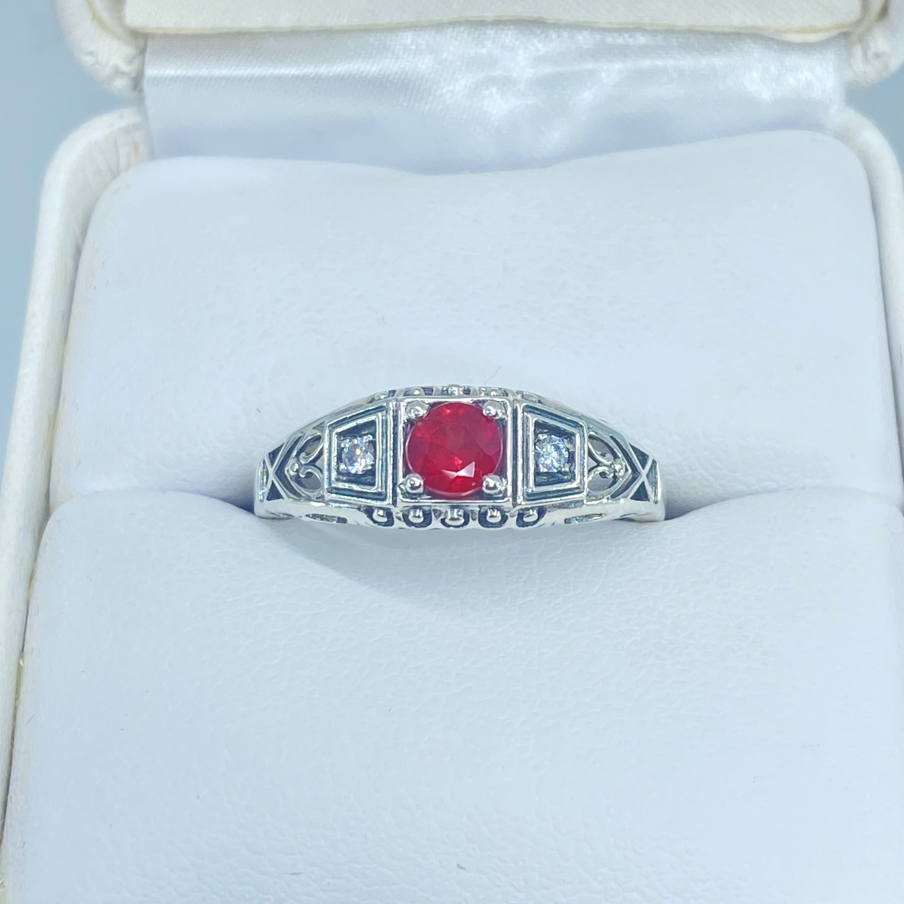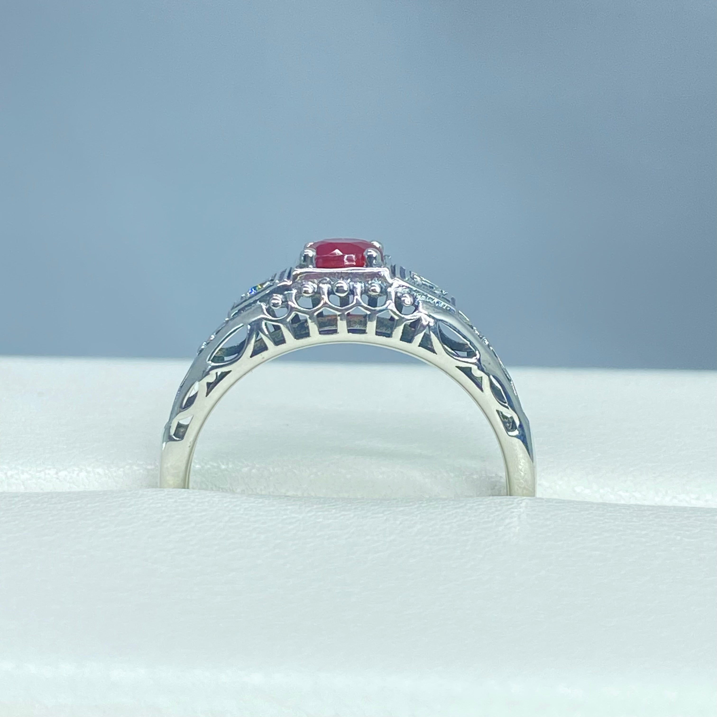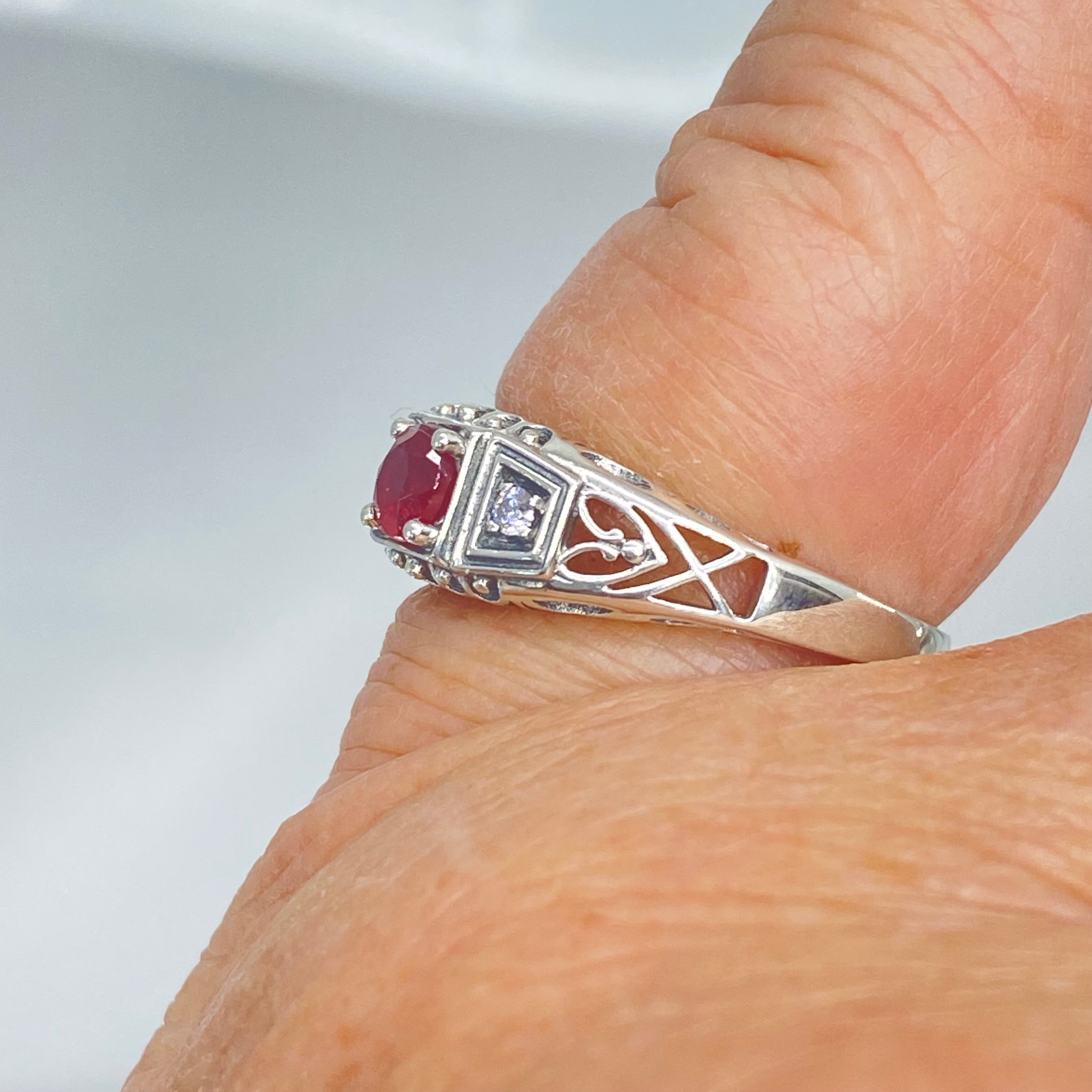 Inspired by Art Deco era designs, this lovely filigree ring is a gorgeous antique reproduction in sterling silver. The full round cut .36ct Natural Red Ruby stone is 4.5mm in diameter. There are 2 (two) 1mm Cubic Zirconia (CZ) on each side of the ruby. The band is marked 925 for solid sterling silver.