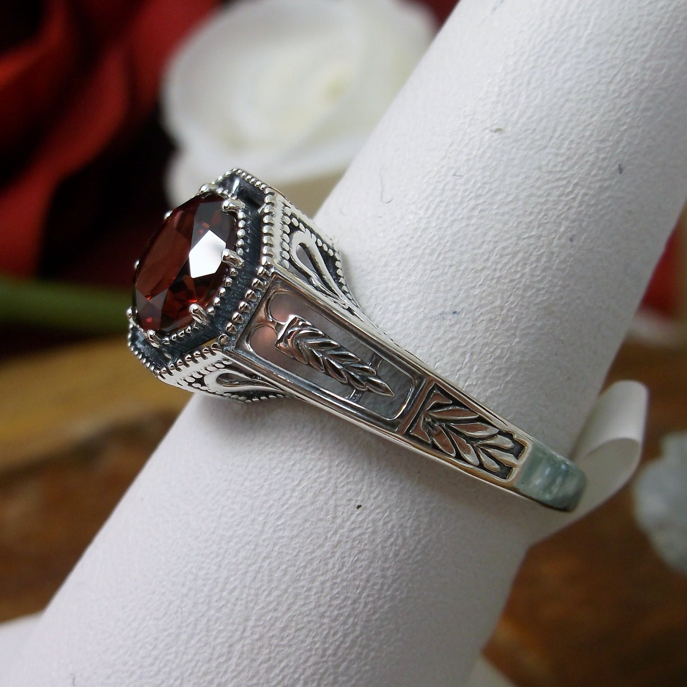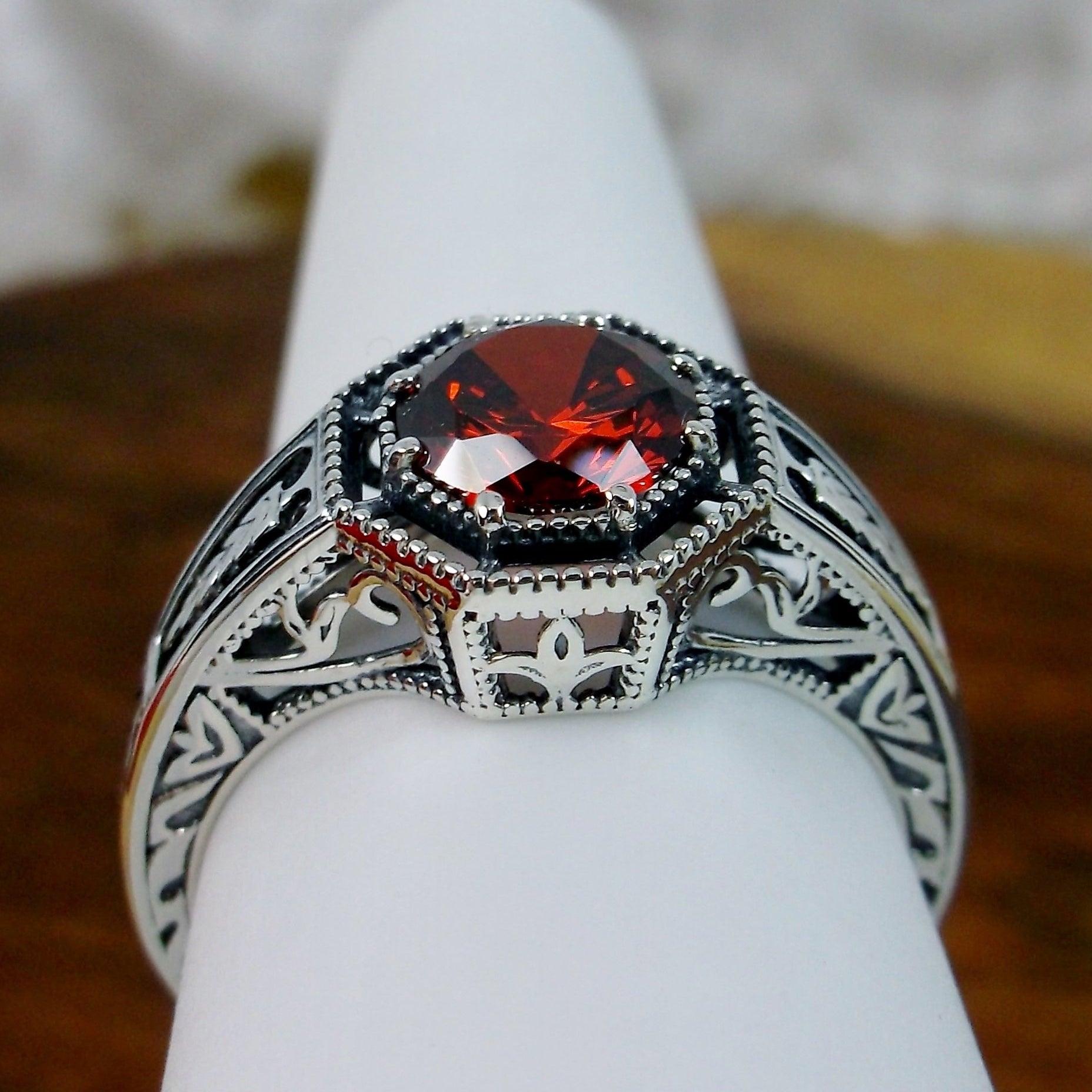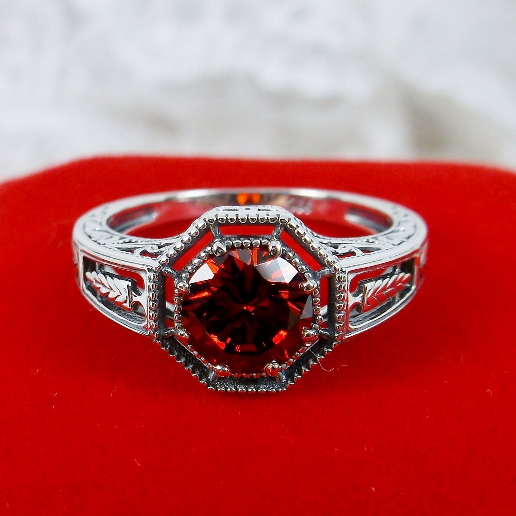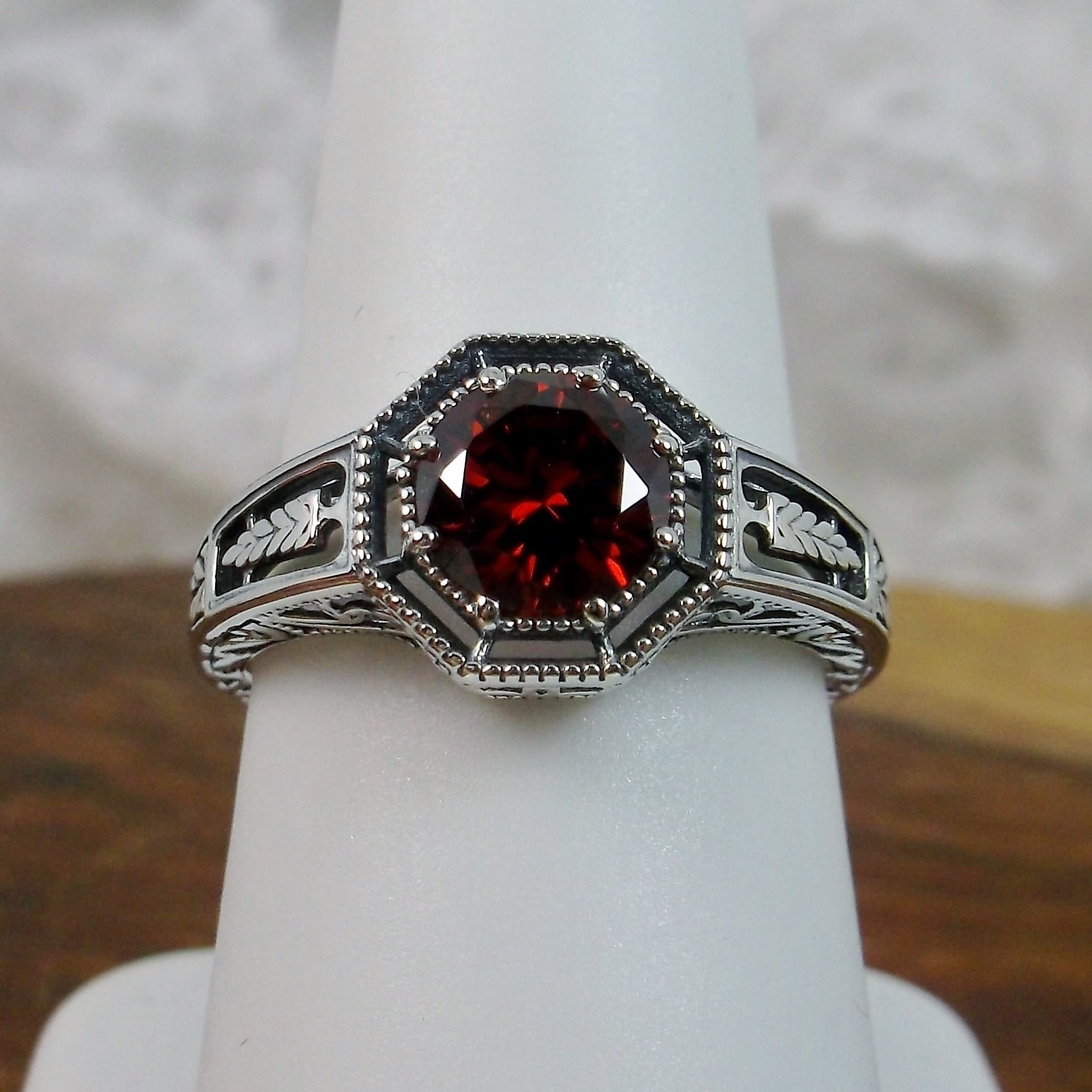 Inspired by the Art Deco era, this unusual filigree ring is a solid sterling silver antique reproduction. The full round cut 2 carat Garnet CZ solitaire is 8mm in diameter. The ring sits 11mm North to South and 7mm off the finger. The band is marked 925 for sterling silver.