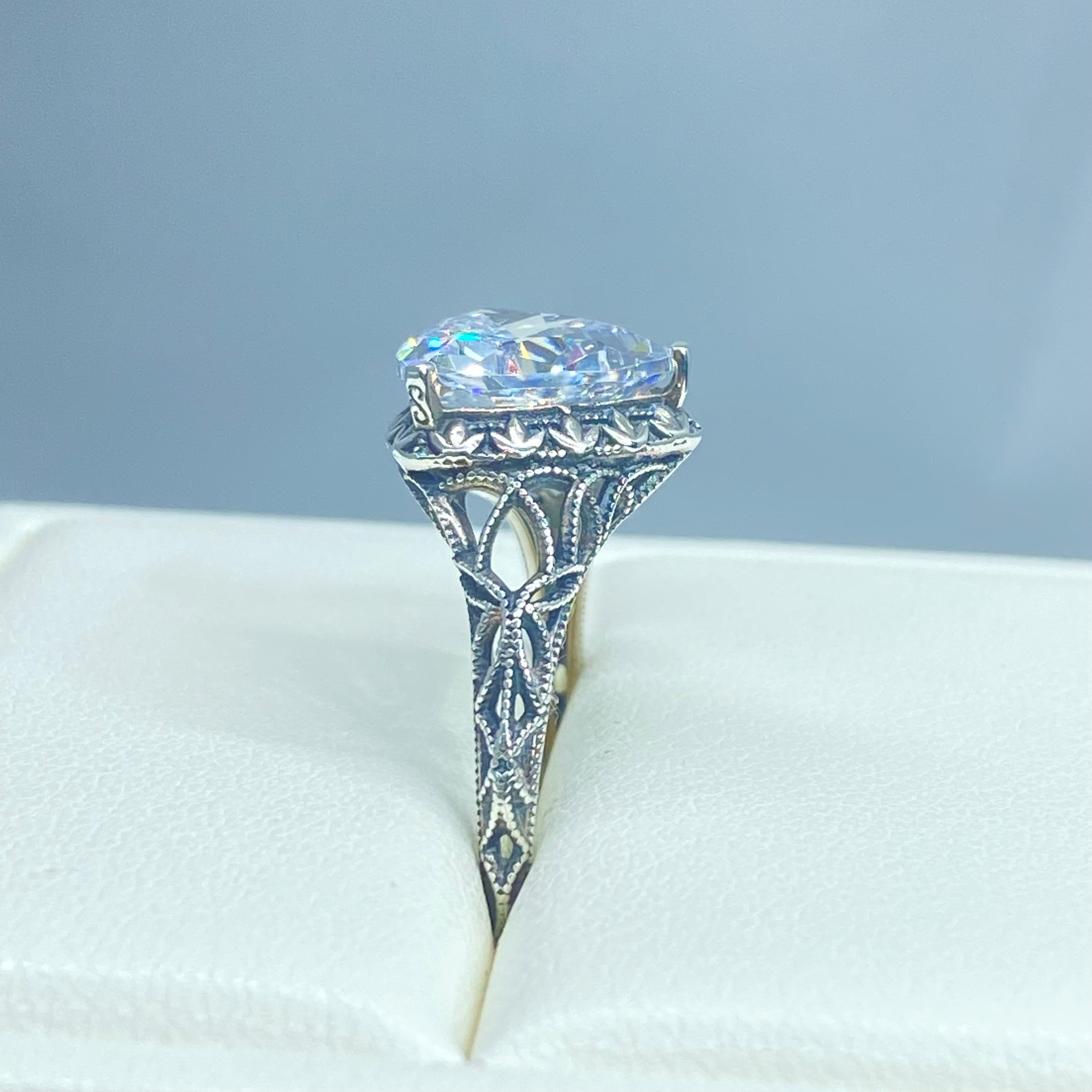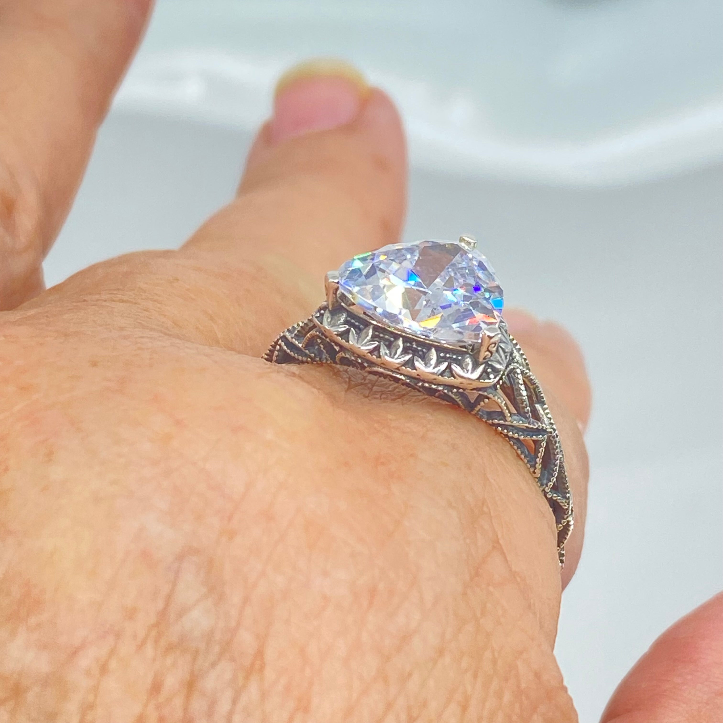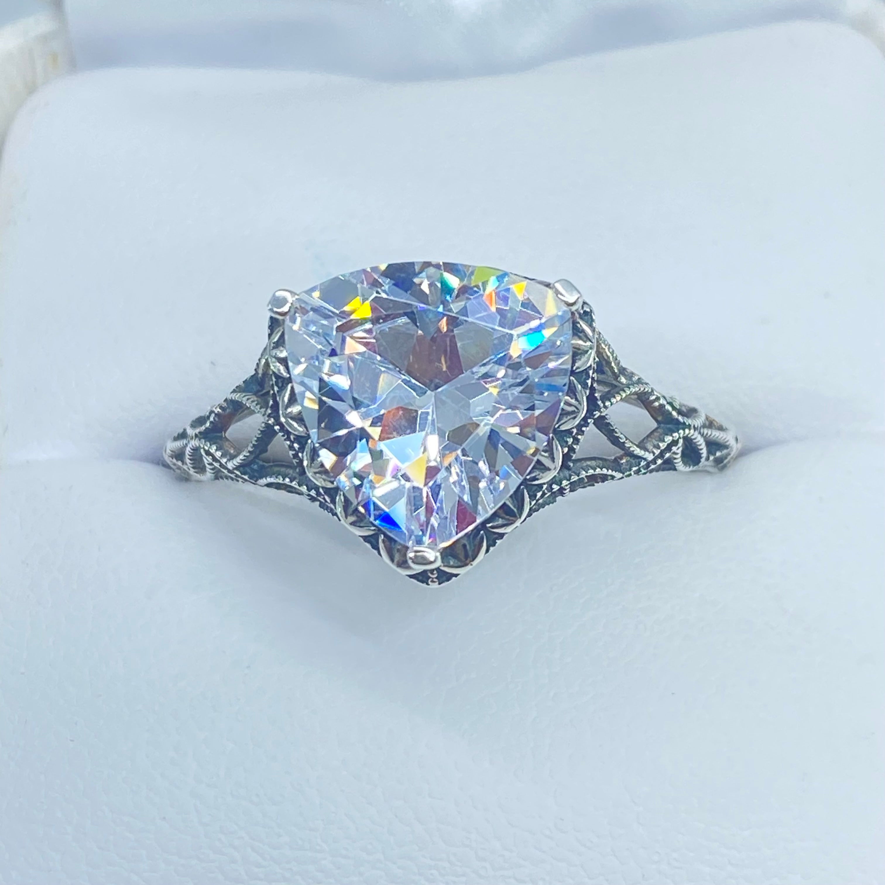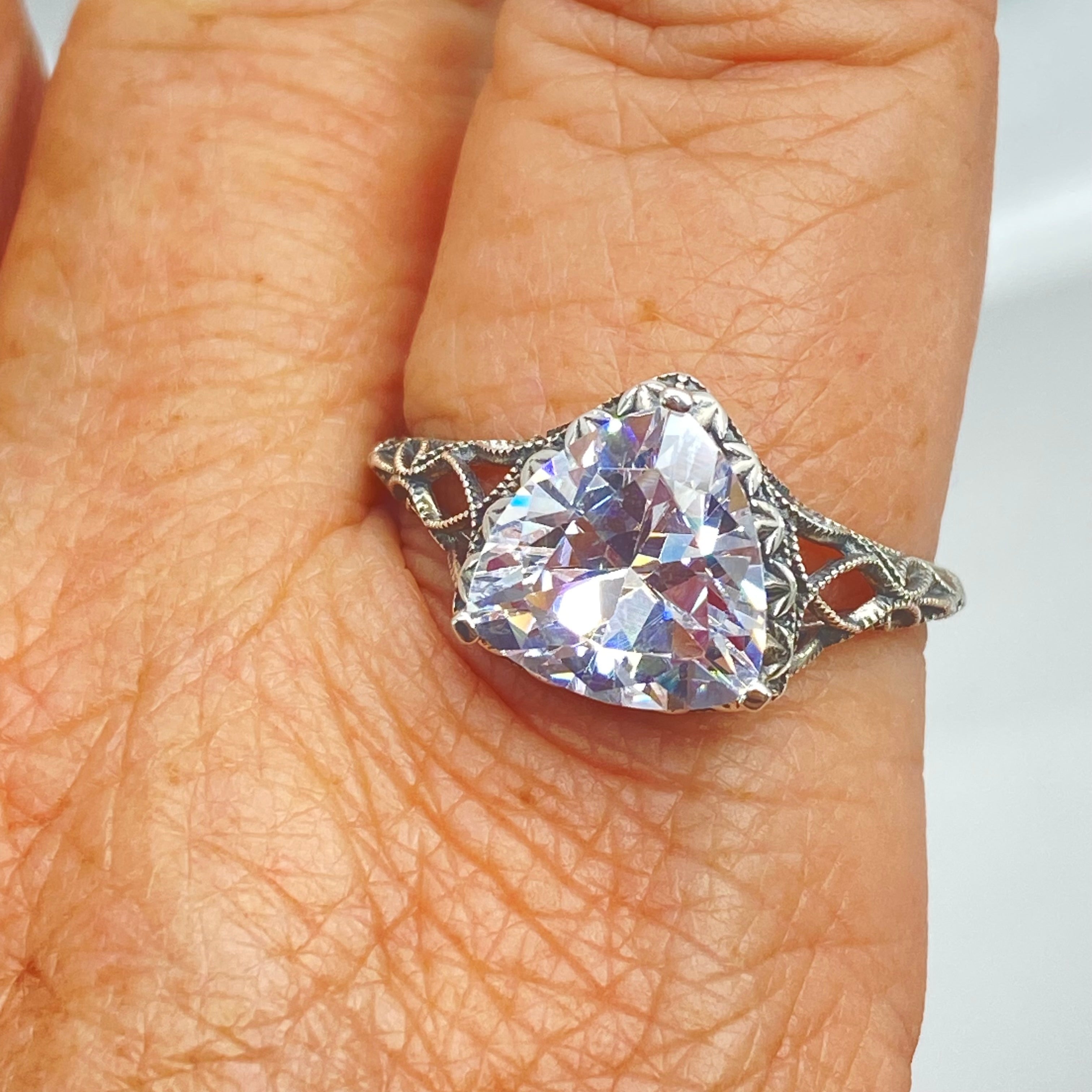 Inspired by Victorian and Art Deco era designs, this lovely filigree ring is a lovely sterling silver antique reproduction. The triangle cut White Cubic Zirconia (CZ) solitaire is 11mm and sits 7.5mm off the finger. The band is marked 925 for sterling silver. Notice the fine filigree leaf and floral details of this antique reproduction ring. The details accent the gemstone. The open filigree on each side of the gem are a detail that helps direct the eye towards the stone. Graceful and elegant, this ring captures the imagination.