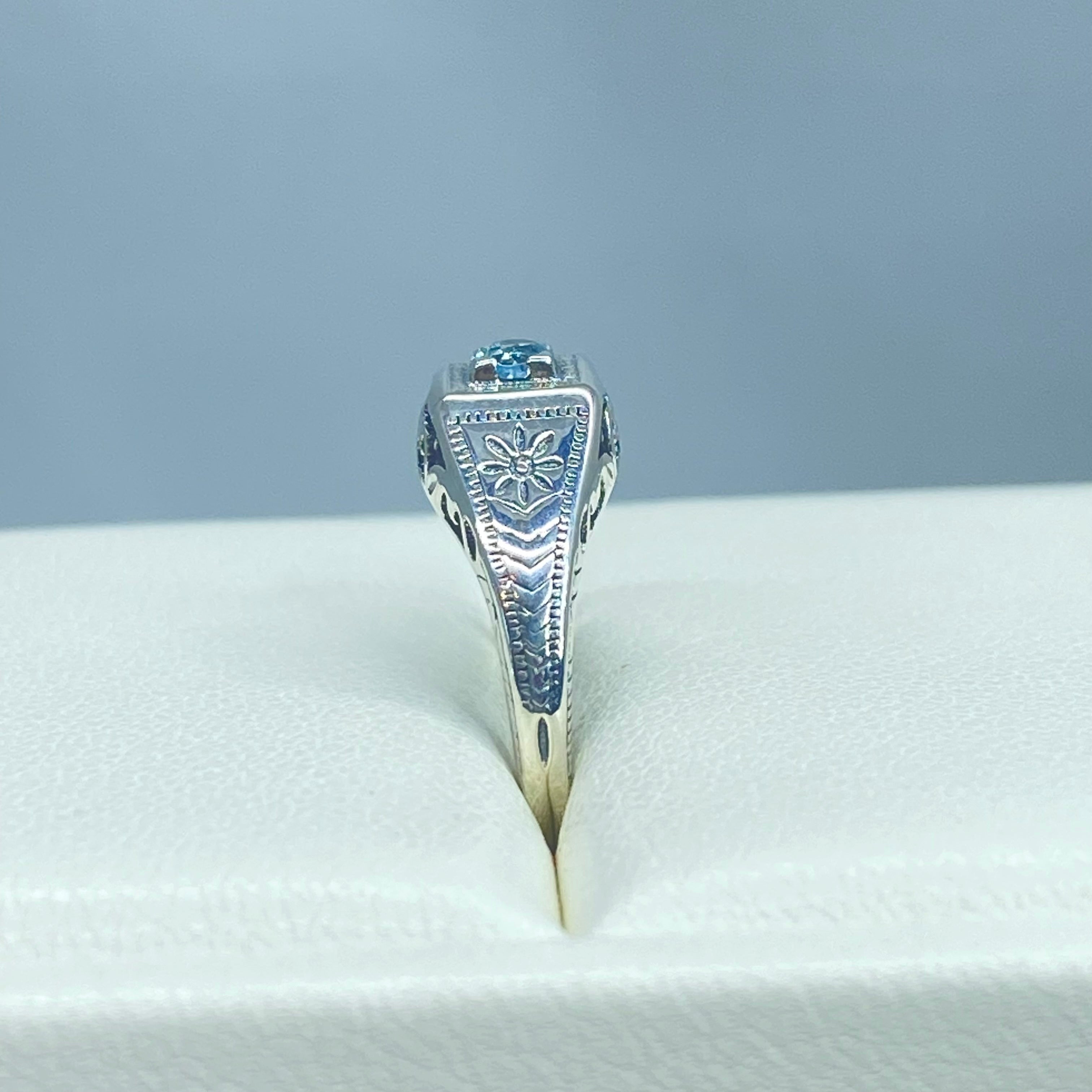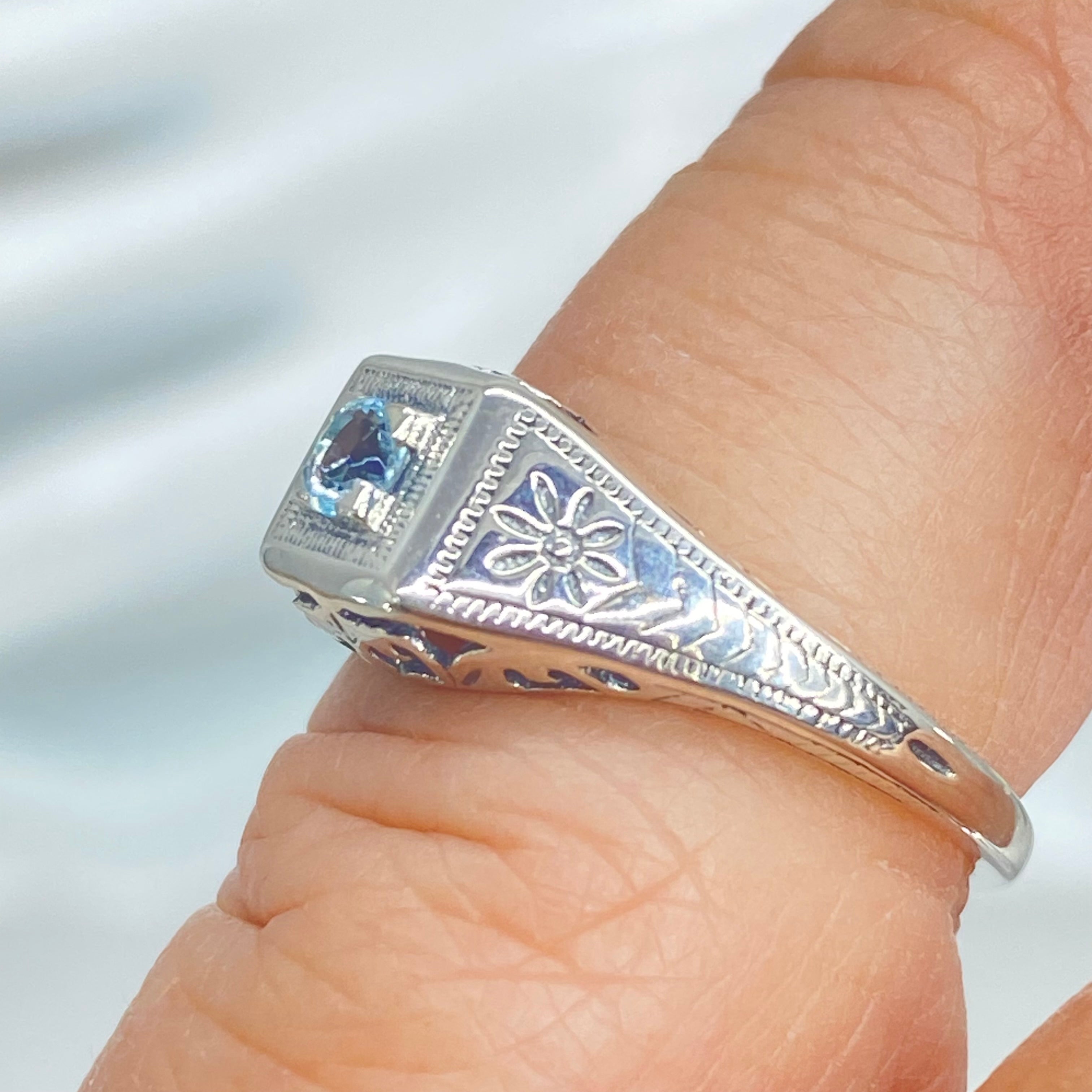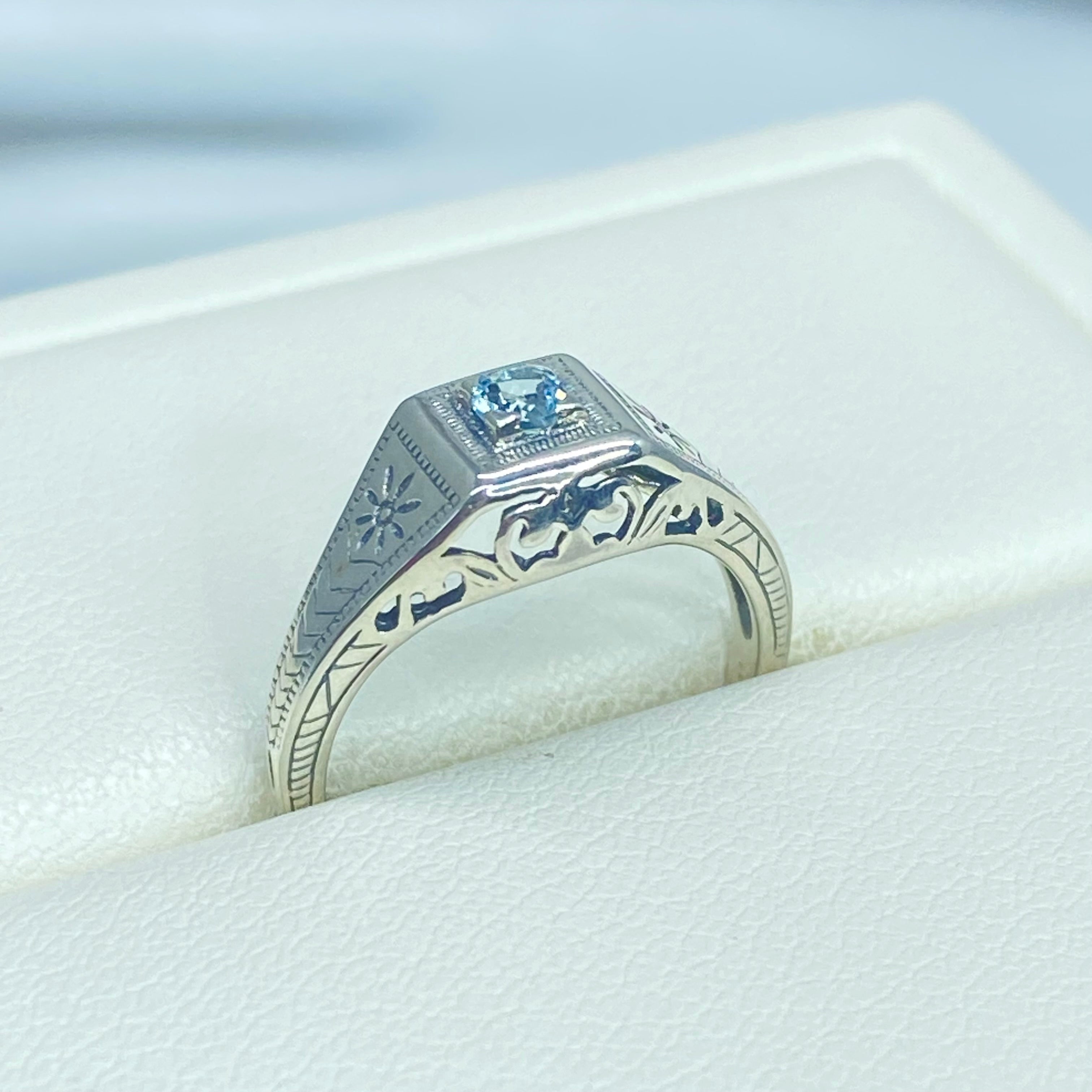 This is an Art Deco reproduction ring in sterling silver. This full cut round cut Natural Aquamarine gem is 3mm in diameter. The setting is 7mm North South on the finger. Notice the beautiful sun & swirl etched design of the silver filigree setting. The inside of the band is marked 925 for sterling silver. This is a lovely rendition of an antique filigree wedding ring; it is very comfortable to wear and sits beautifully on the hand.