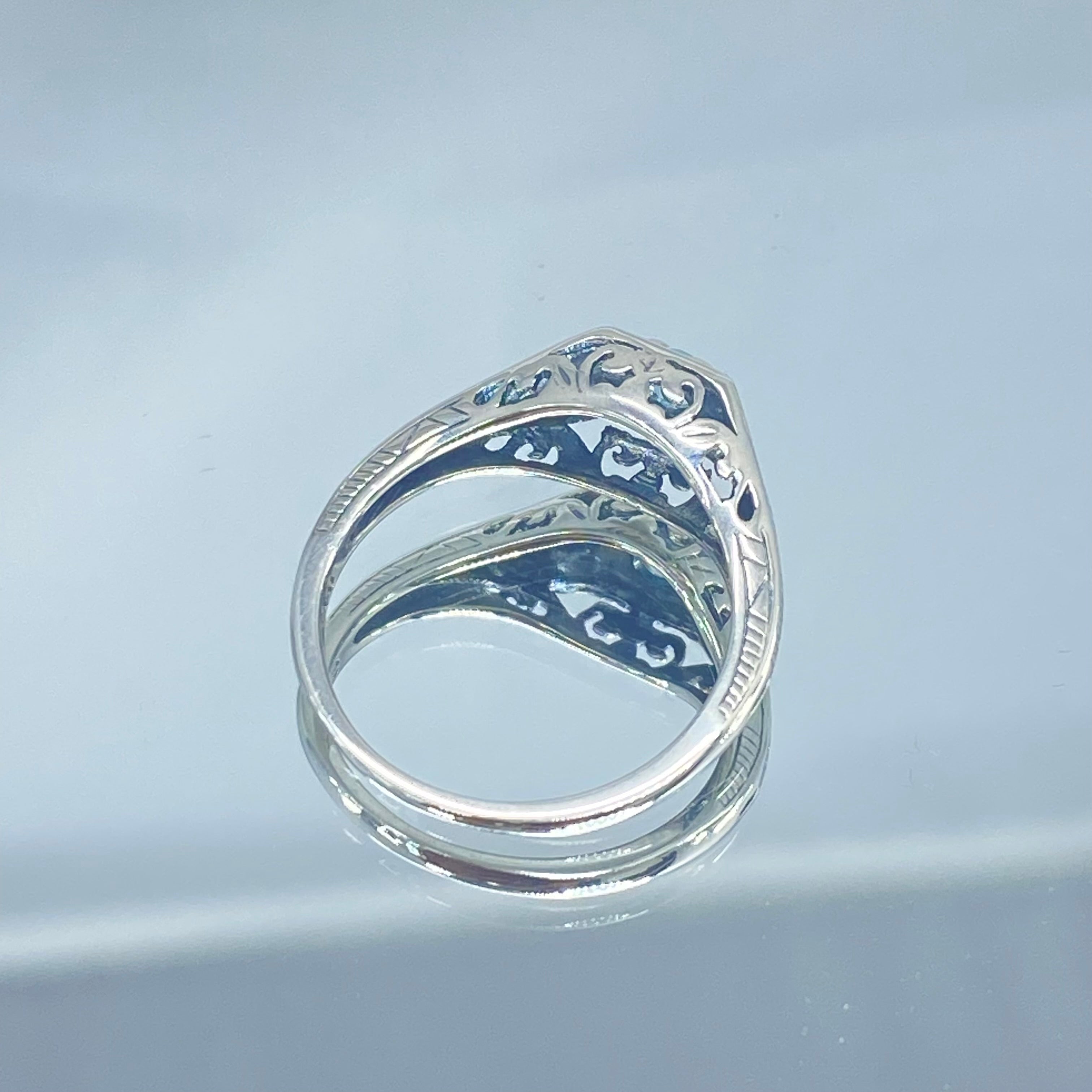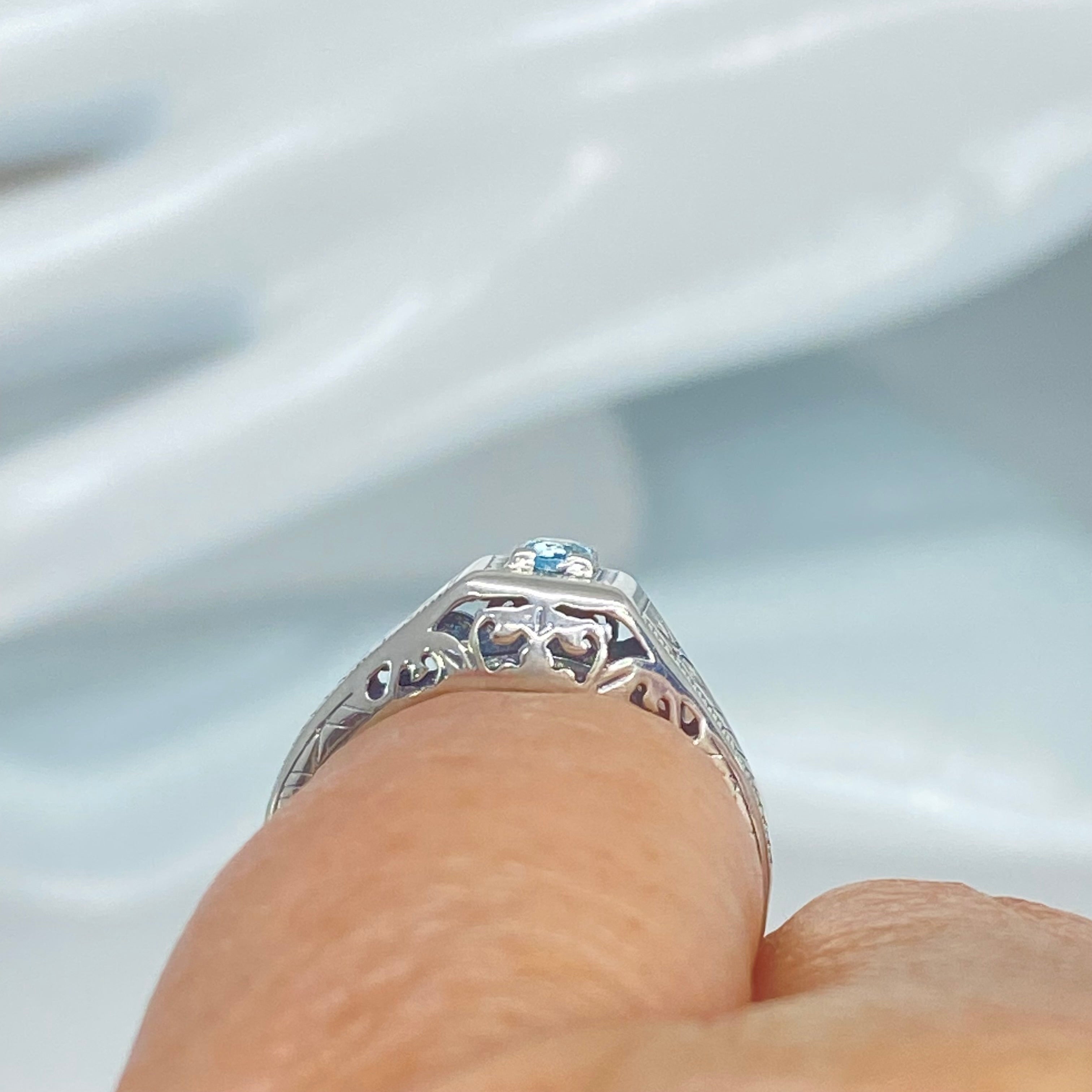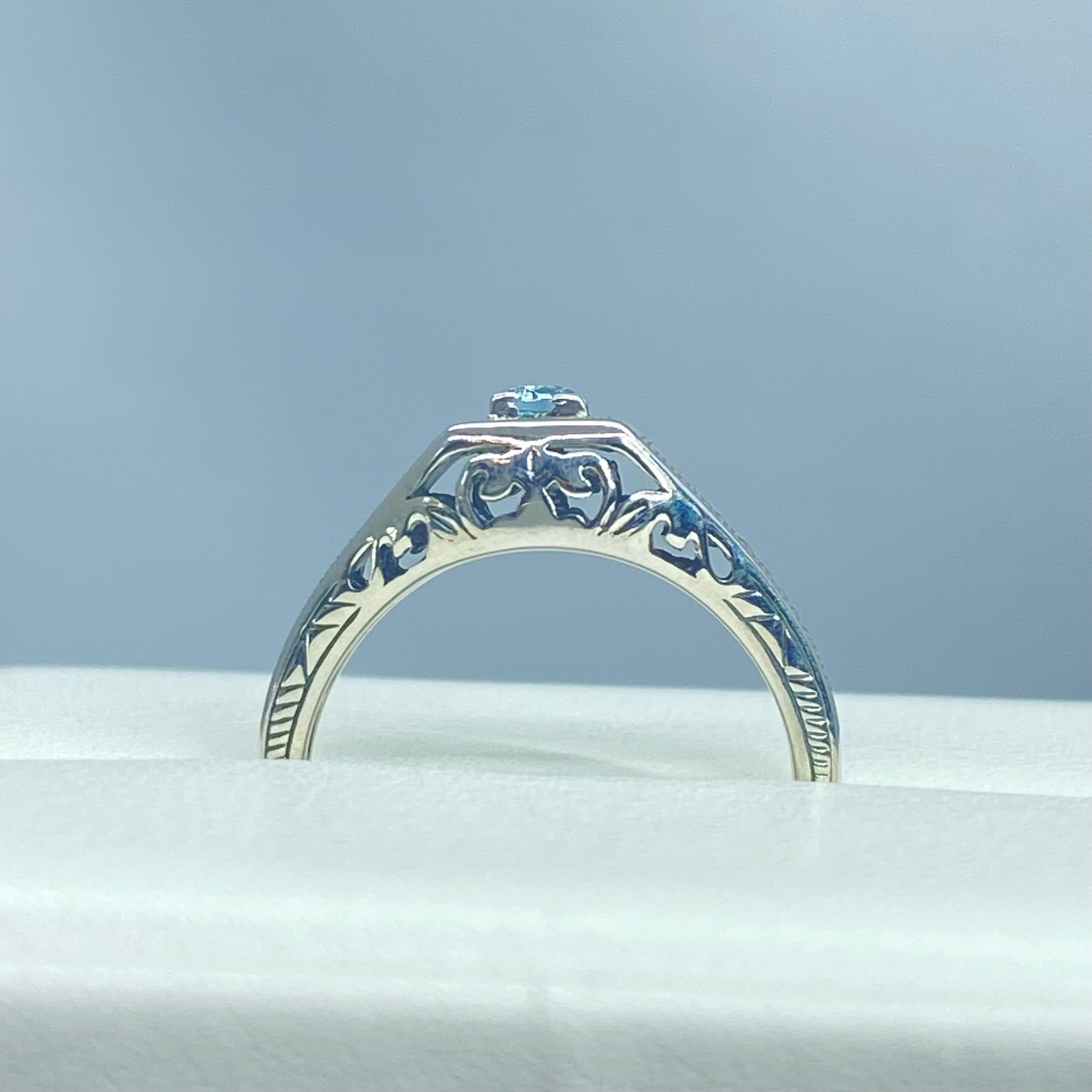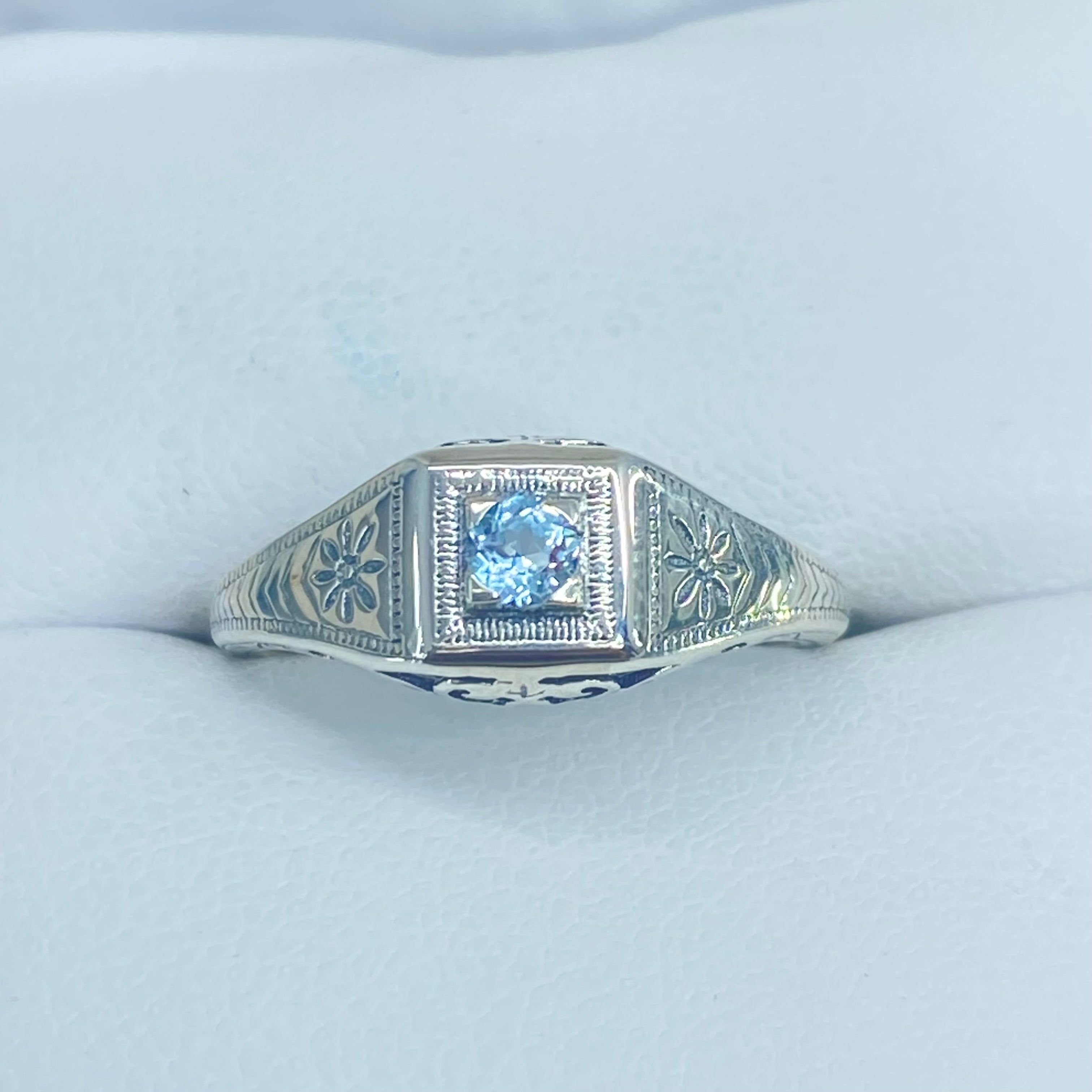 This is an Art Deco reproduction ring in sterling silver. This full cut round cut Natural Aquamarine gem is 3mm in diameter. The setting is 7mm North South on the finger. Notice the beautiful sun & swirl etched design of the silver filigree setting. The inside of the band is marked 925 for sterling silver. This is a lovely rendition of an antique filigree wedding ring; it is very comfortable to wear and sits beautifully on the hand.