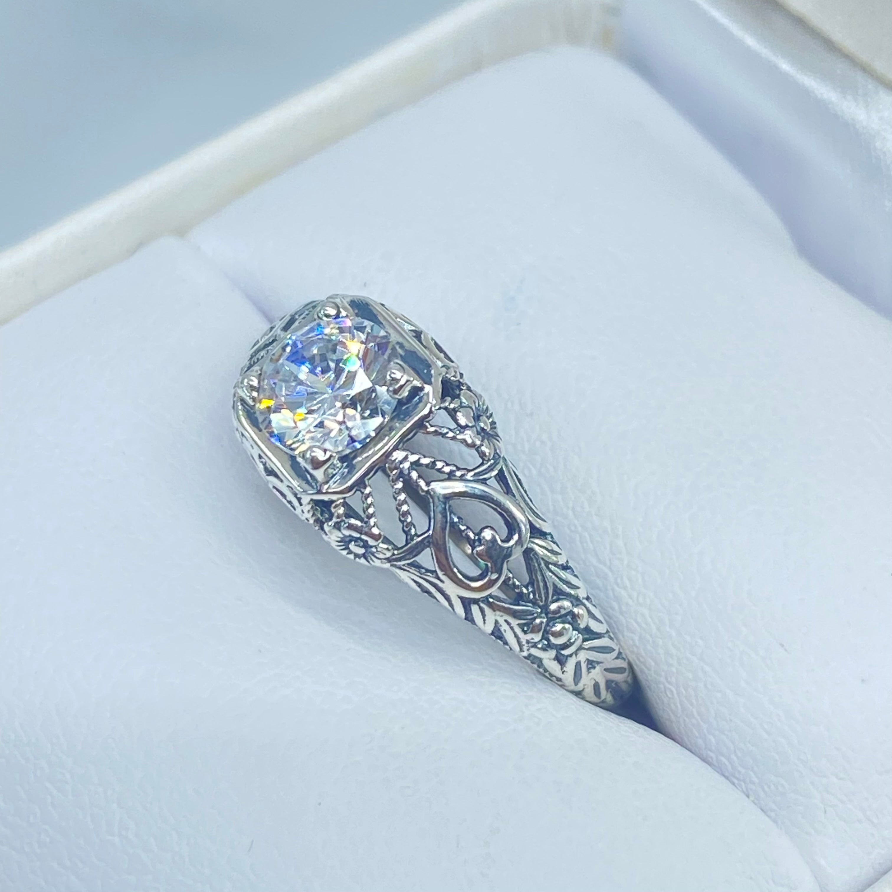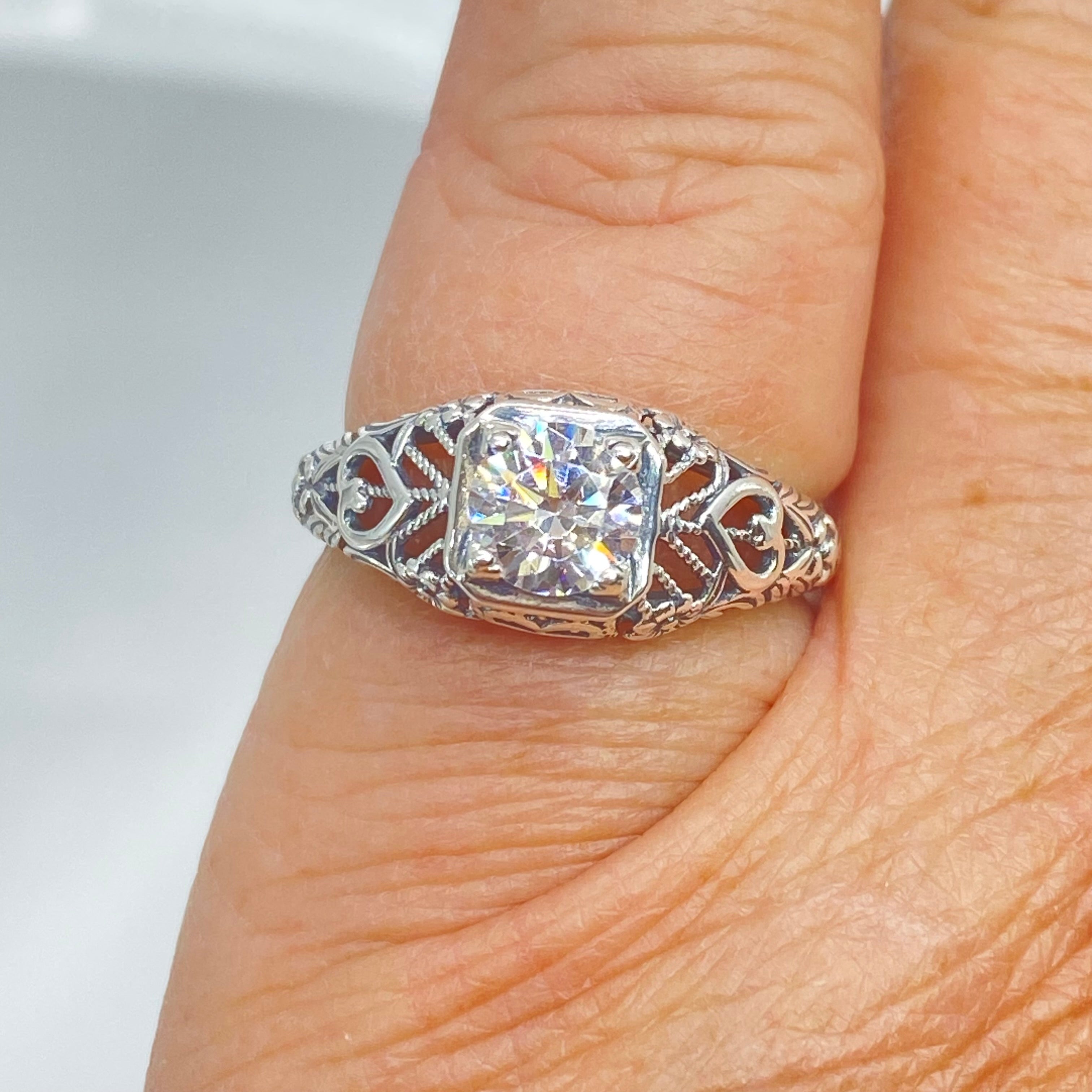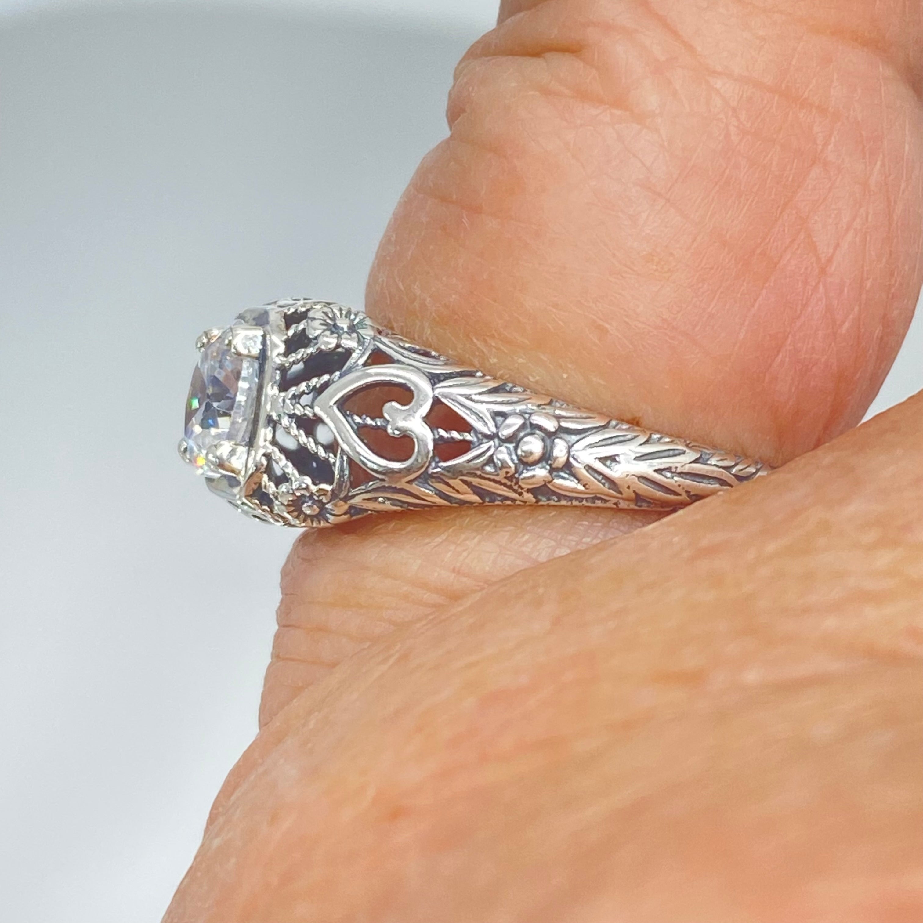 This is a stunning Victorian vintage-style ring handcrafted in sterling silver. It has a lovely white Cubic Zirconia (CZ) as the solitaire gemstone. This round full cut gem is 6mm in diameter. The inside of the band is marked 925 for sterling silver.