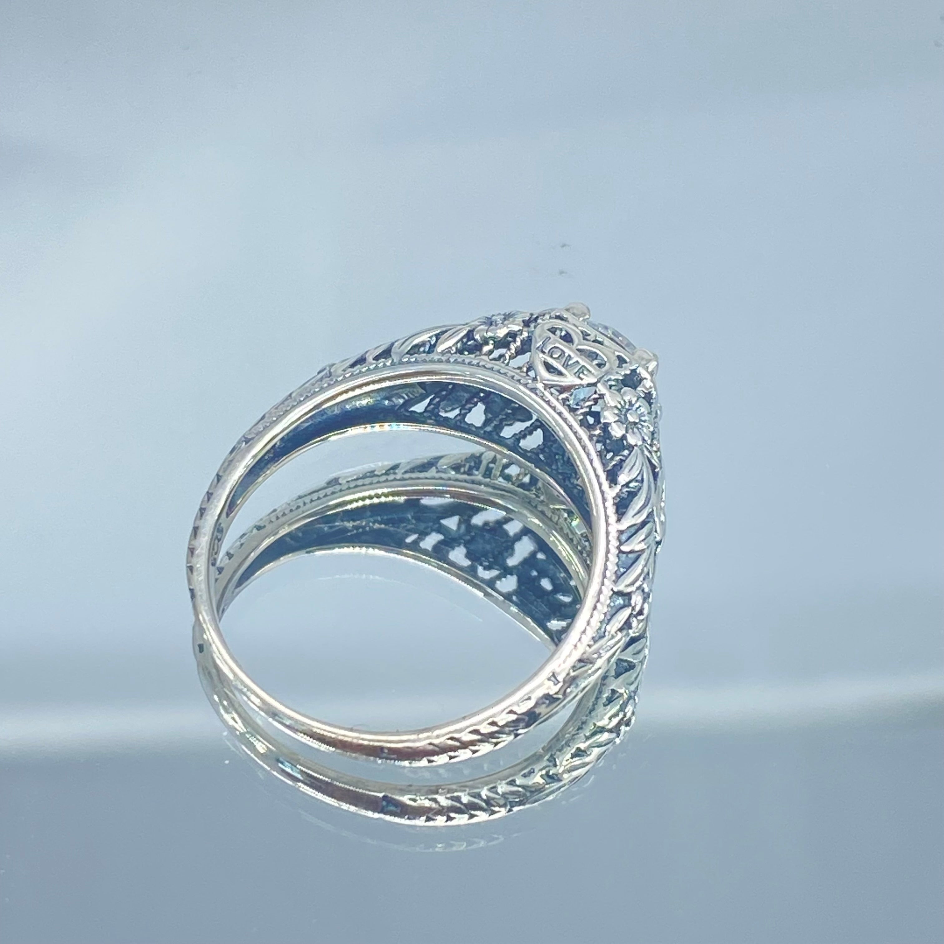 Perfect to show someone how much you care; this ring is even etched with the word "love" on each side. There is beautiful craftsmanship throughout the filigree setting. This ring is a lovely example of romantic antique style. There are beautiful designs that surround and raise the gem, elevating the brilliant gemstone in a striking design. Enjoy this fashionable solitaire as your very own. This would make a wonderful valentine gift, promise ring, or covenant ring.