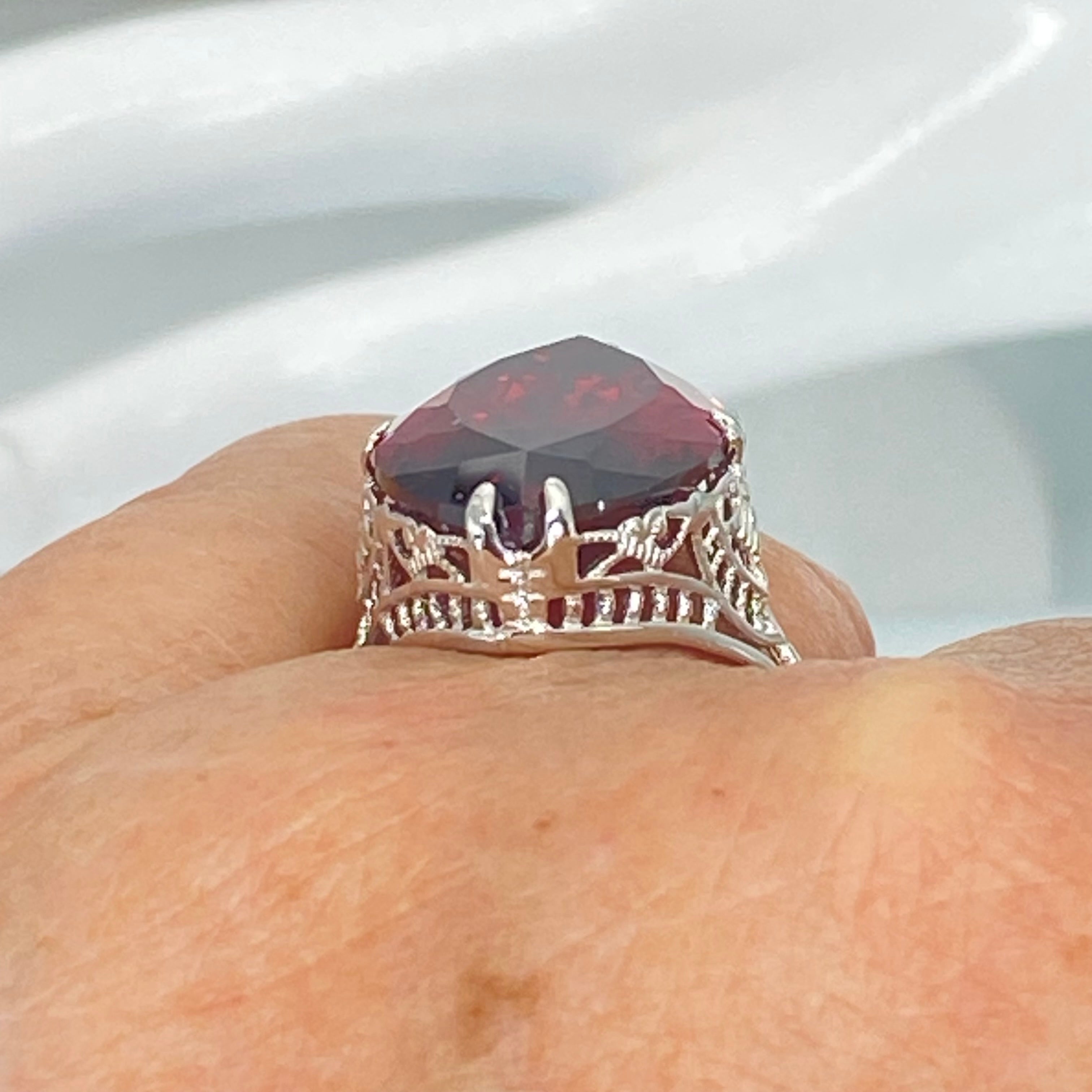 Inspired by the Victorian era designs, I now offer this Antique reproduction ring in sterling silver. This gorgeous ring is set with an 12ct marquise cut flawless red Garnet CZ gemstone. The deep red gem is 26mm (1") long by 15mm (9/16") in width. The ring sits 7.5mm off the finger. The inside of the band is marked 925 for sterling silver.