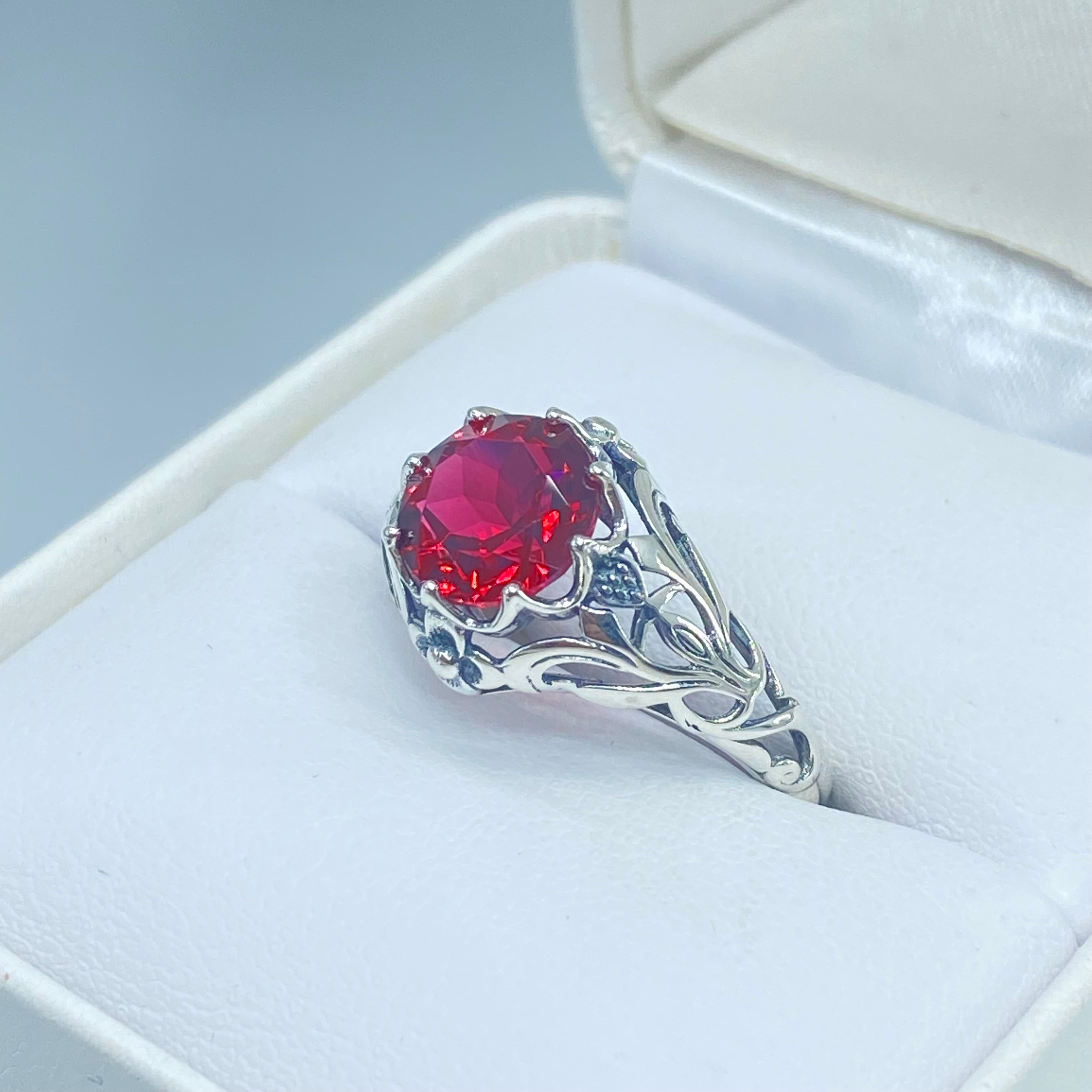 This is a sterling silver filigree ring inspired by Art Nouveau movement of the early 20th century. This beautiful floral filigree ring is set with a simulated red ruby stone. The round full cut gem is 8mm in diameter. The ring measures 12mm North to South on the finger. The band is marked 925 for sterling silver.