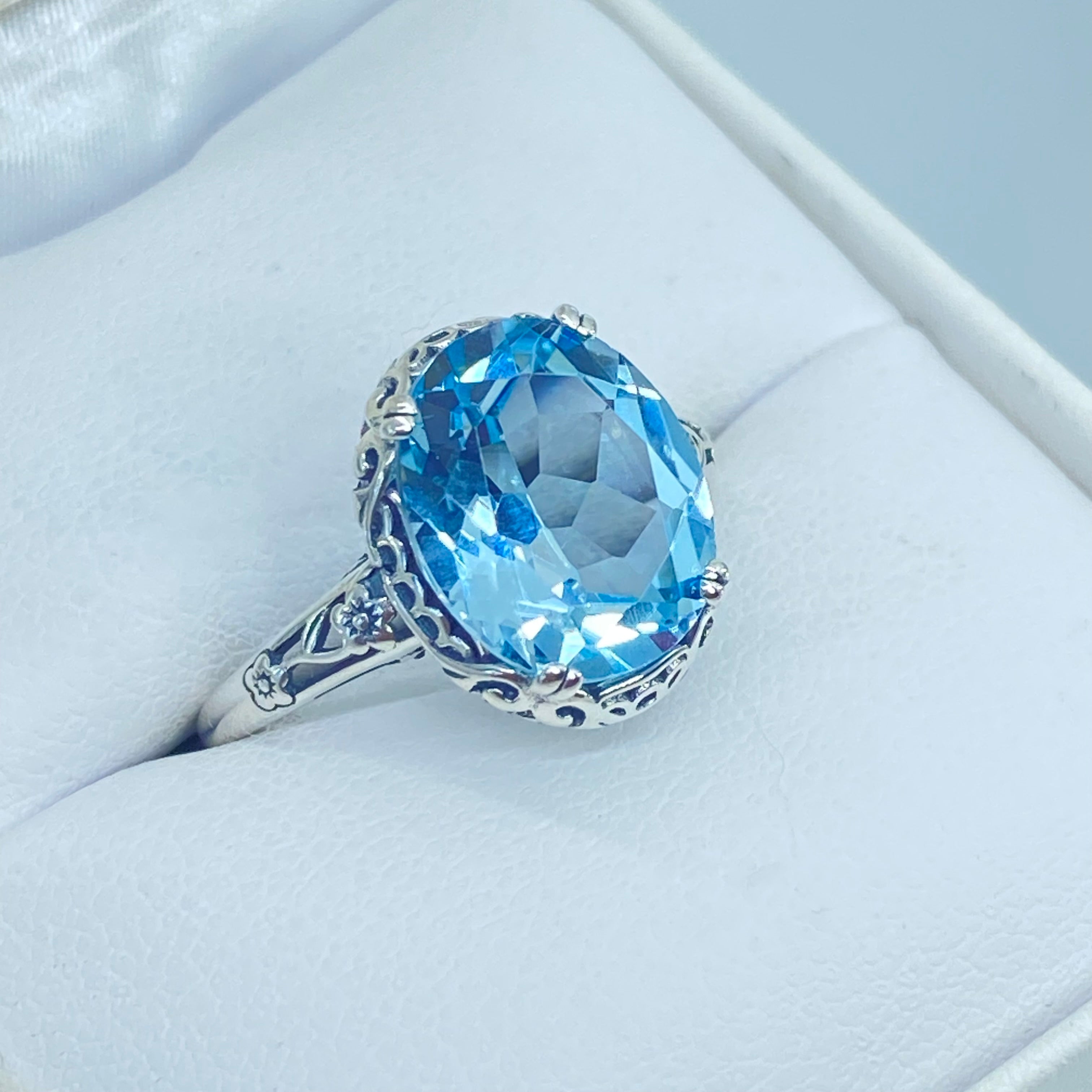 This filigree ring is an Edwardian antique reproduction in sterling silver set with a 4.5 carat Natural Sky Blue Topaz gemstone solitaire. This gem has great color and clarity, (VS). This full cut oval gem is 12mm x 10mm. This ring sits 7mm off the finger. The inside of the band is marked 925 for sterling silver. Notice the beautiful floral leaf design of the silver filigree setting and the etched band.